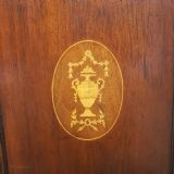 A pair of Edwardian Mahogany bedside cabinets and dating from around 1900. These lovely bedside cabinets have satinwood strung and shaped gallery backs, satinwood cross banded and moulded edge to the top with a single satinwood strung door to the front and a satinwood inlaid oval panel to the centre with Brass handles. It has a singular shelf inside. They stand on square tapered satinwood strung legs on Brass shoe castors.