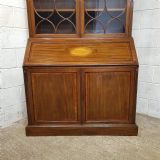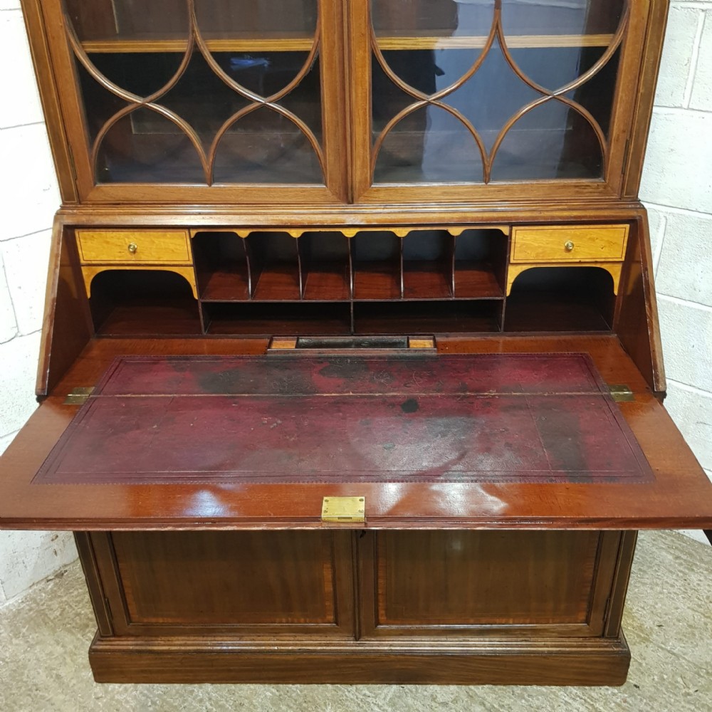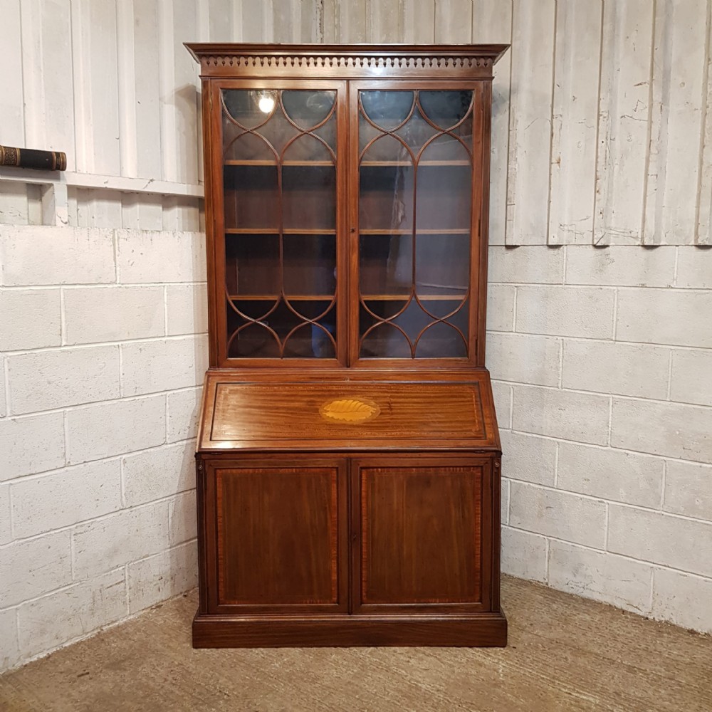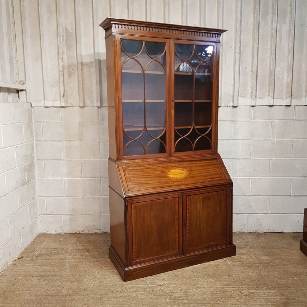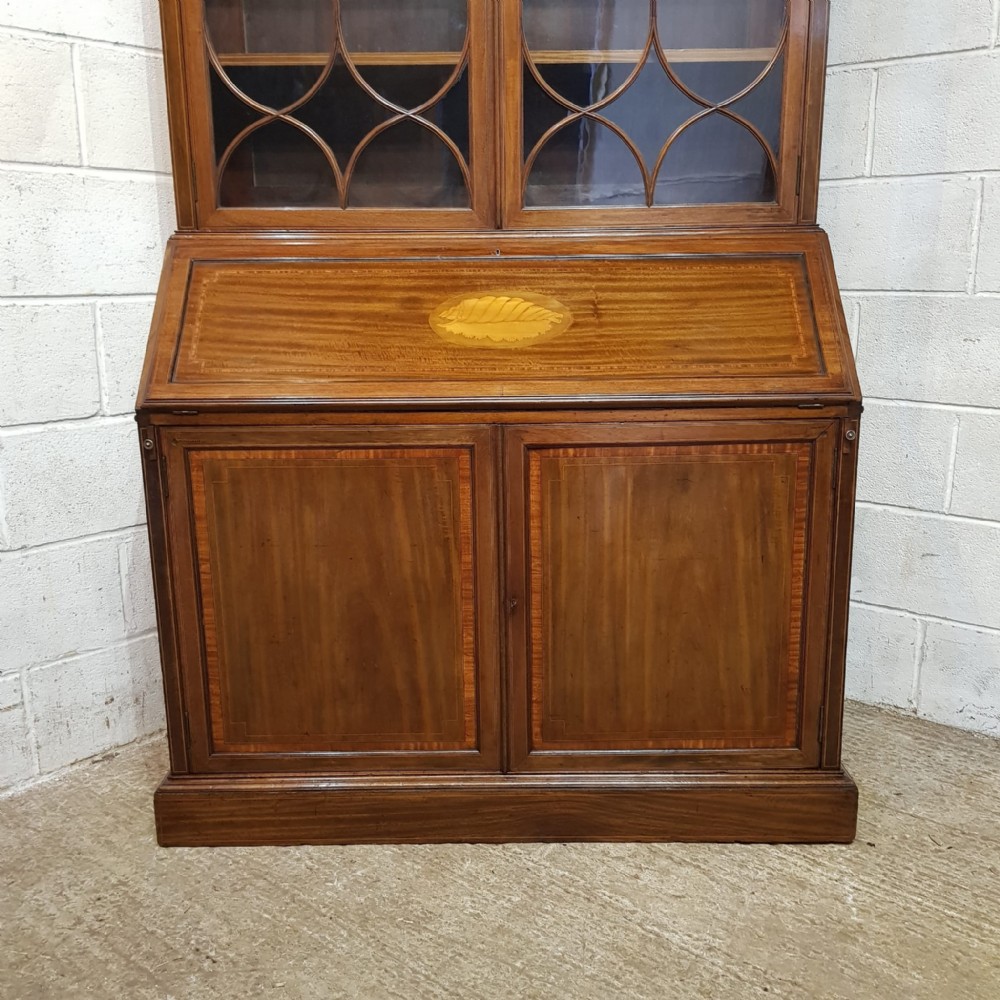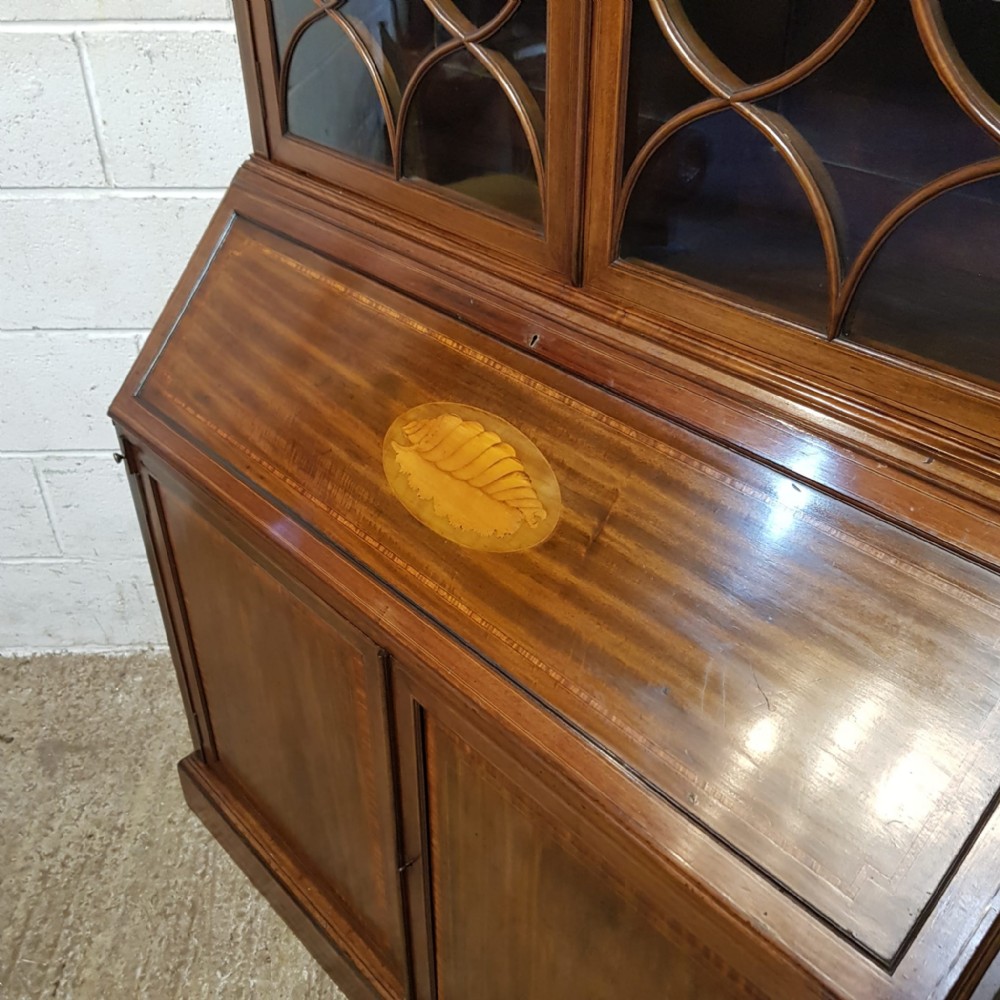 An Edwardian Mahogany bureau bookcase and dating from around 1900. This bookcase has a moulded cornice with a castlelated strung lip underneath. It features two astragal glazed doors with key and three original fully adjustable shelves inside. The bureau has a satinwood strung fall front with a large inlaid shell to the centre. Inside are pigeon holes small drawers all satinwood fronted with a leather writing surface. Underneath this are two doors each has a satinwood cross banded edge and a key with a shelf inside. It is moulded around the bottom and stands on a plinth base. The top lifts off the bottom for ease of movement.