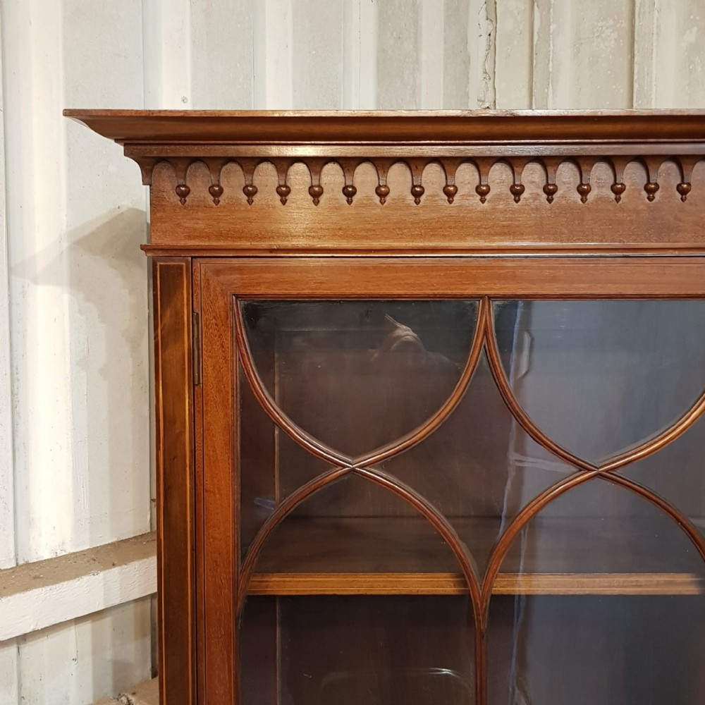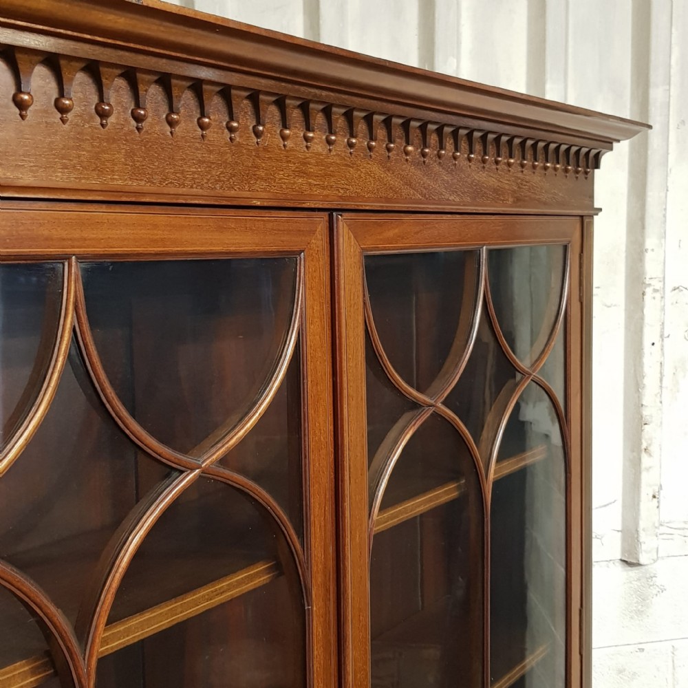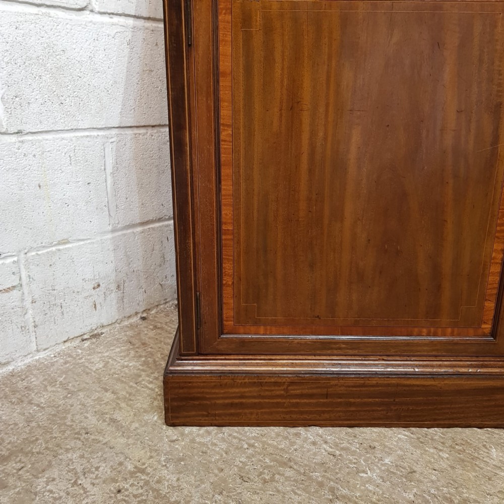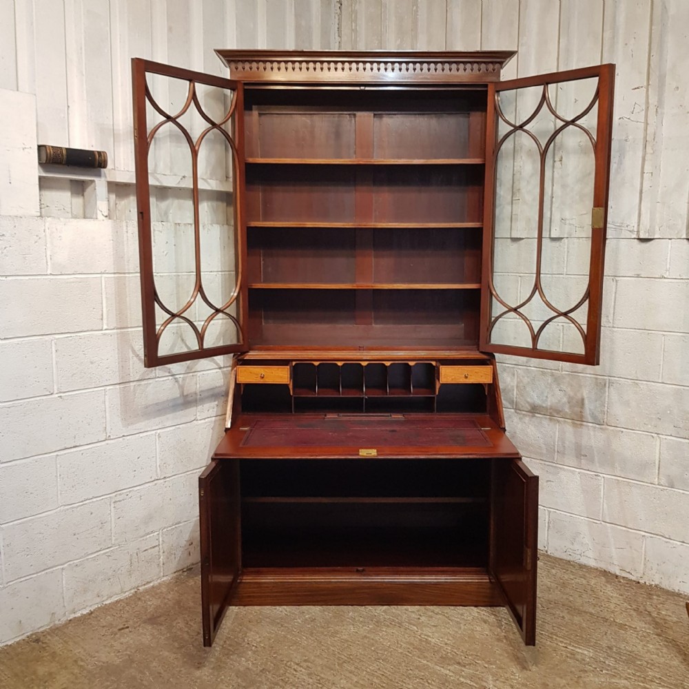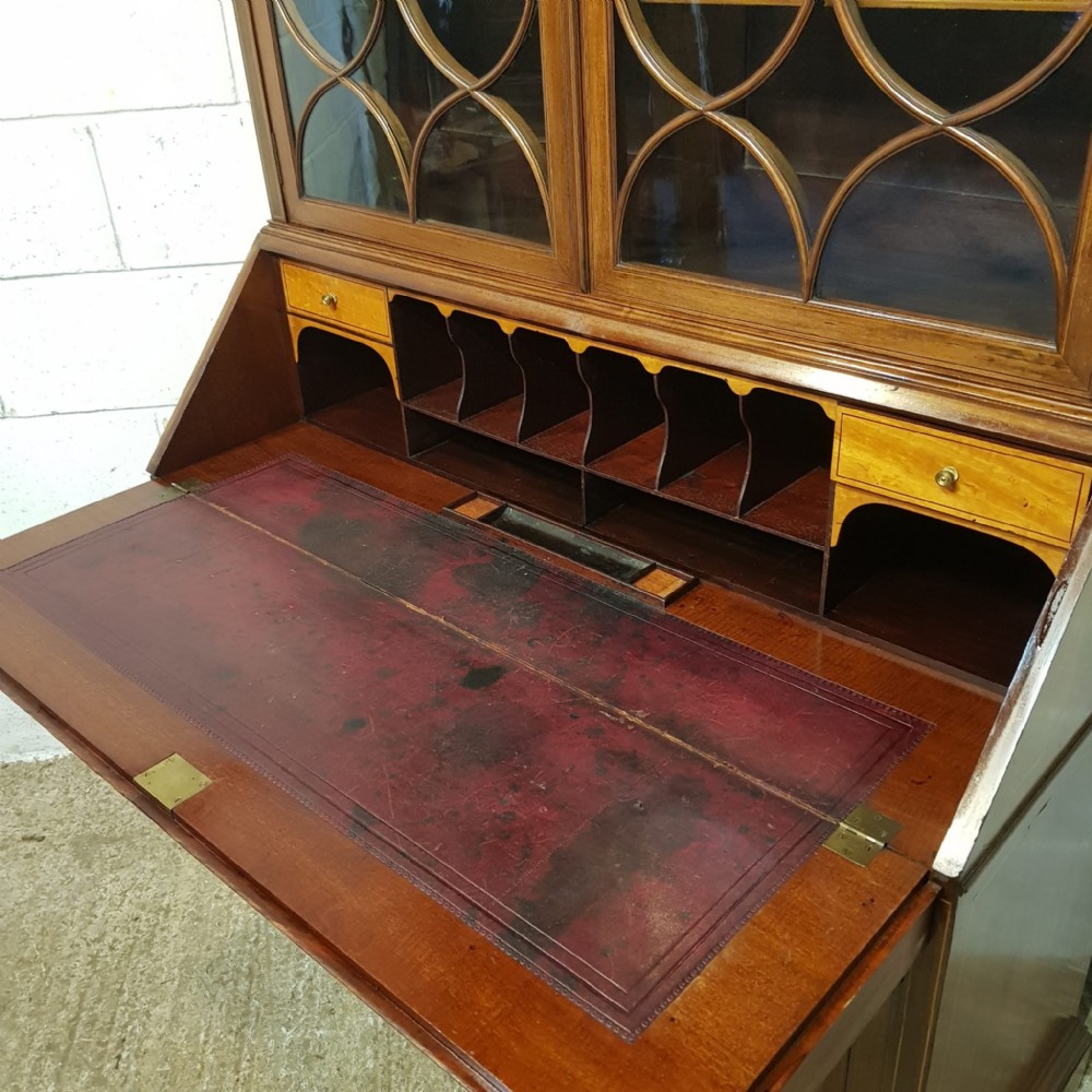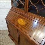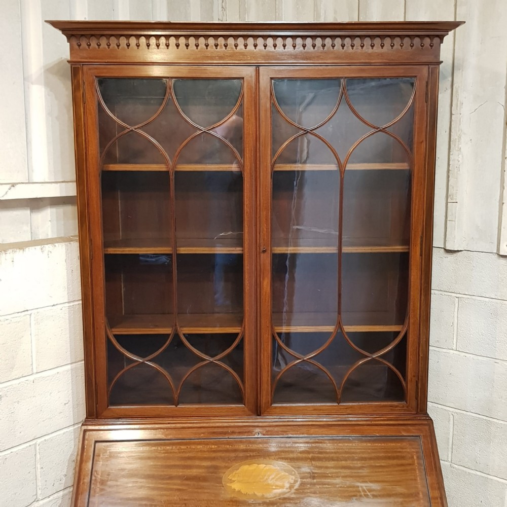 An Edwardian Mahogany bureau bookcase and dating from around 1900. This bookcase has a moulded cornice with a castlelated strung lip underneath. It features two astragal glazed doors with key and three original fully adjustable shelves inside. The bureau has a satinwood strung fall front with a large inlaid shell to the centre. Inside are pigeon holes small drawers all satinwood fronted with a leather writing surface. Underneath this are two doors each has a satinwood cross banded edge and a key with a shelf inside. It is moulded around the bottom and stands on a plinth base. The top lifts off the bottom for ease of movement.