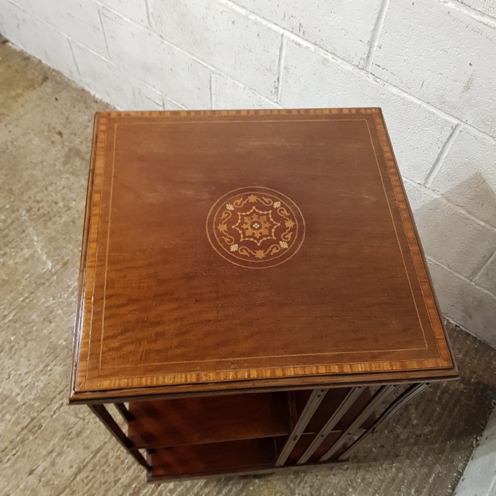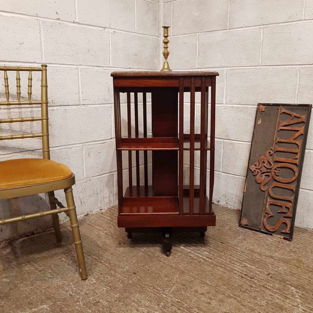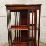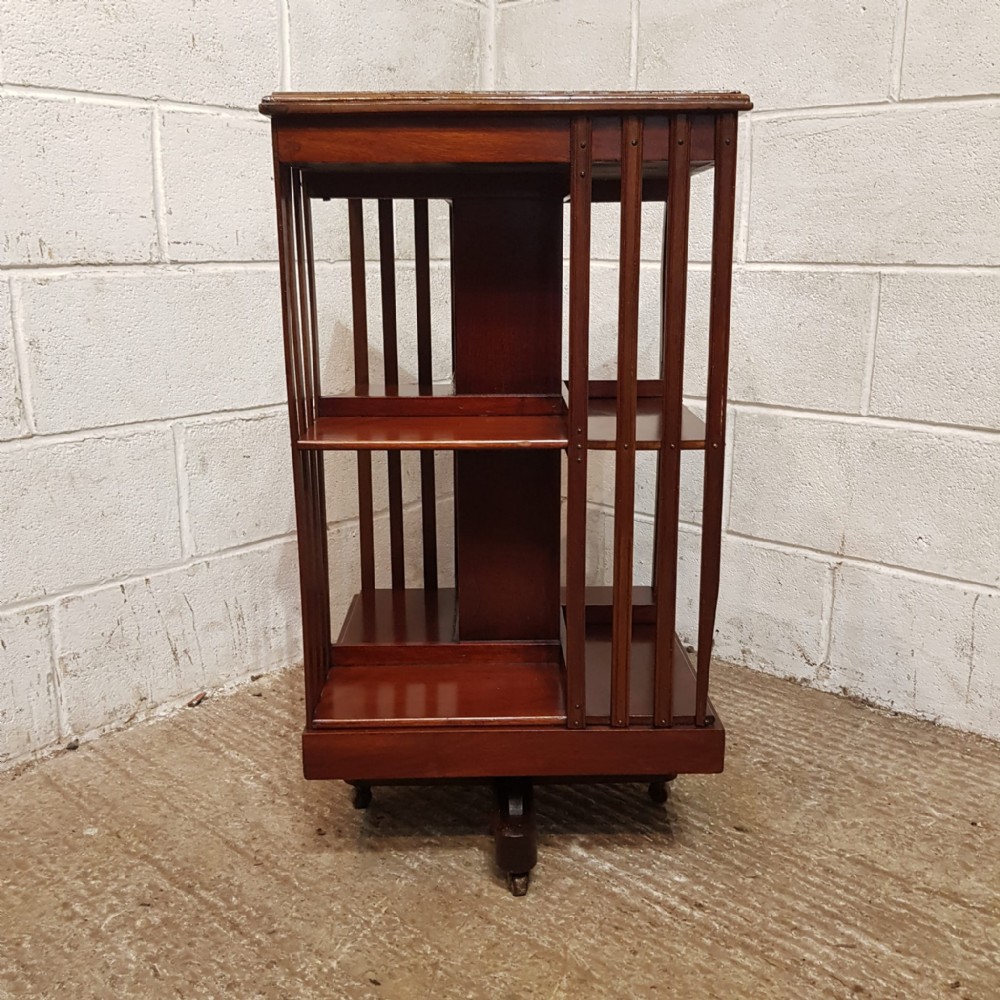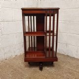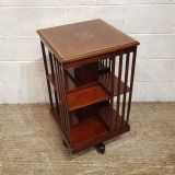 An Edwardian Mahogany revolving bookcase and dating from around 1900. This wonderful example has a Satin wood and cross banded moulded edge to the top which also has an inlaid centre. It has two tiers of shelves with readed rails and a plinth base which stands on a quad form base on castors.