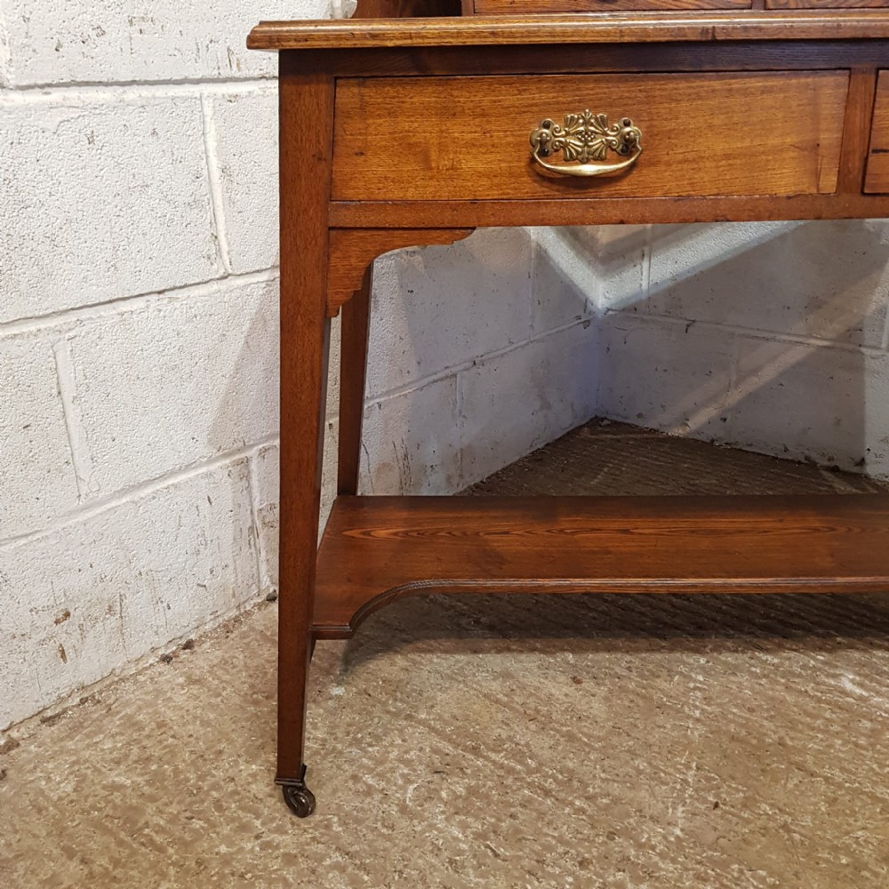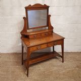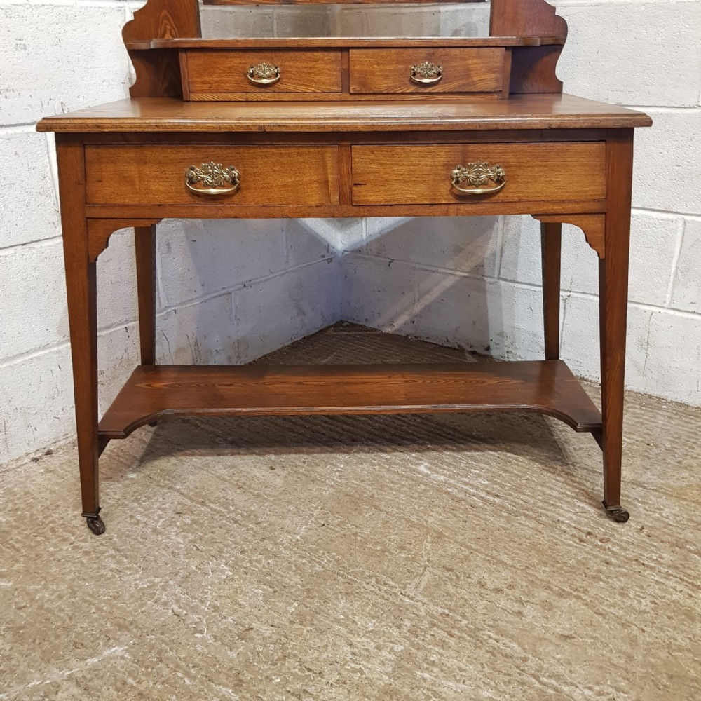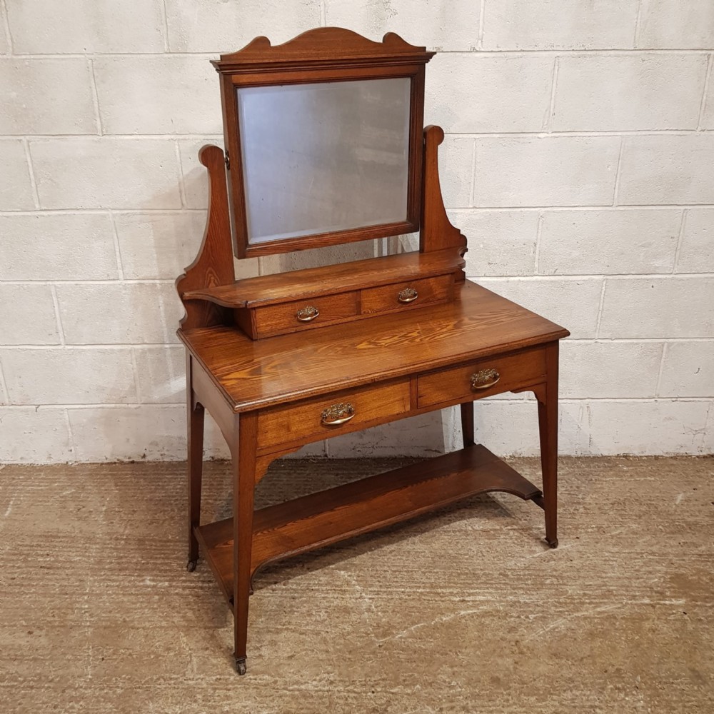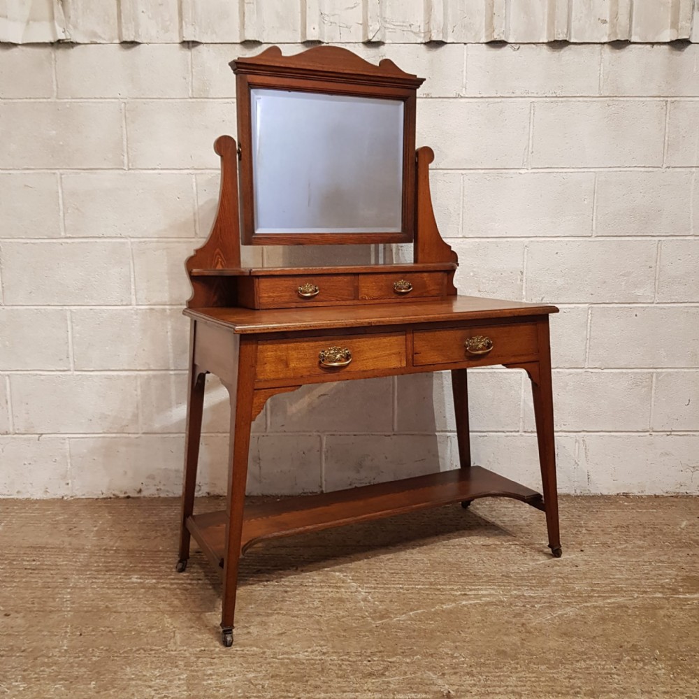 An Oak Art's & Craft's dressing table and dating from around 1900. This dressing table has a bevelled mirror framed mirror with a pediment above on shaped mirror supports which lead down to a shelf with two small drawers underneath it. It has a moulded edge to the top with two drawers underneath and all drawers are Oak lined with original Brass handles. The dressing table stands on square tapered and splayed legs on castors and has a shelf on the bottom.