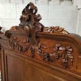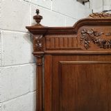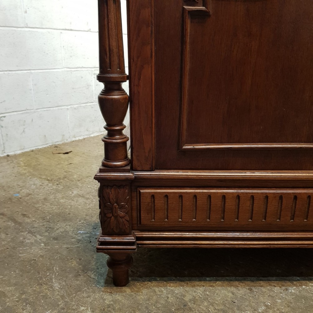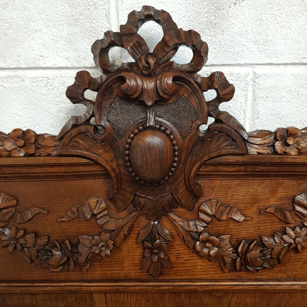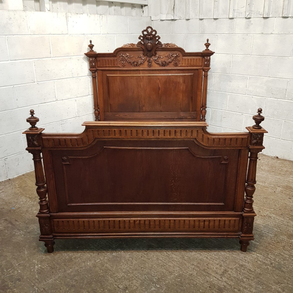 A French carved Oak double bed and dating from around 1890. This original and stunning piece has a turned and carved column to each end of the head board with a turned finial. The top of the head board is heavily carved with ribbons and swags. Underneath is a moulded panel. The foot board has the same columns with a chip carved top rail and a moulded column underneath. Both stand on turned feet with original moulded and chip carved side rails and drop in base and it takes a standard double mattress.