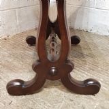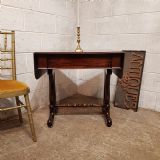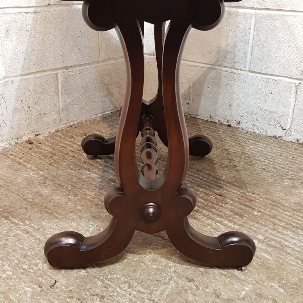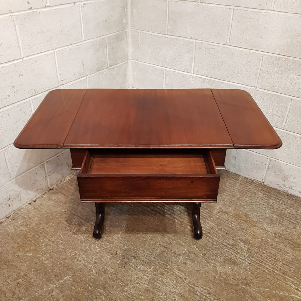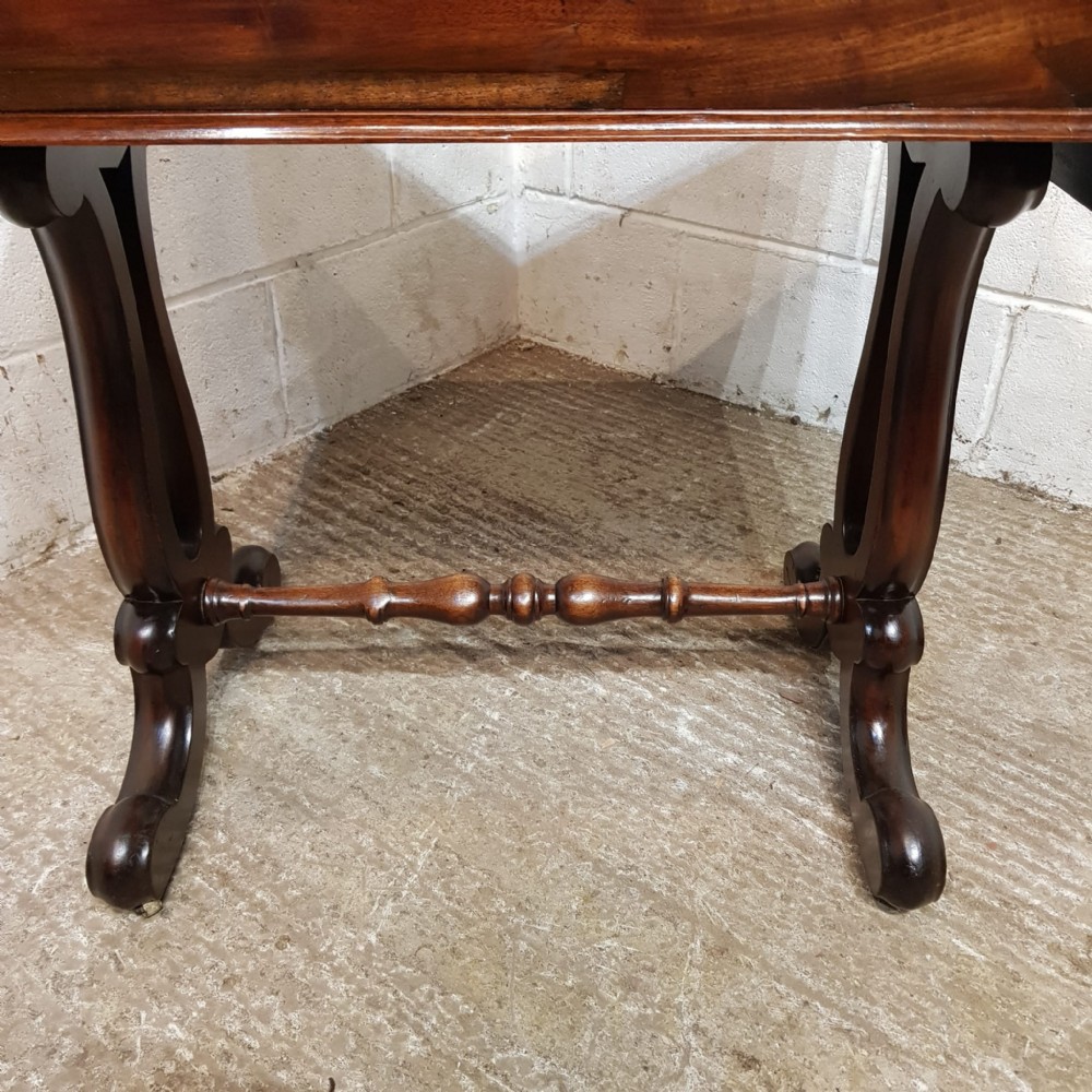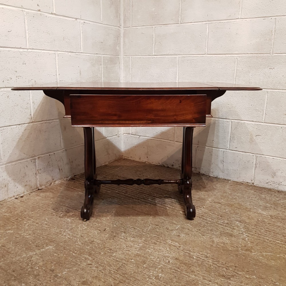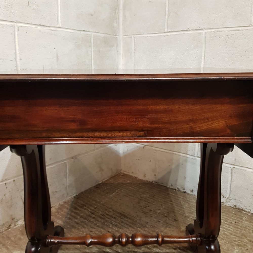 A William 4th Mahogany sofa table and dating from around 1830. This original piece has a moulded edge to the top with a drop leaf to each end. It has a frieze drawer to the front which is Oak lined. It has a moulded lyre end supports on moulded legs and feet on castors and a turned stretcher between the ends.