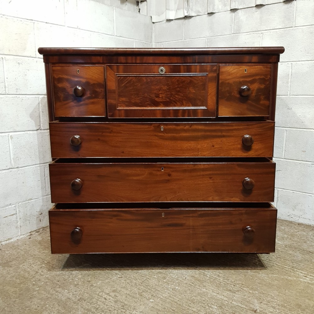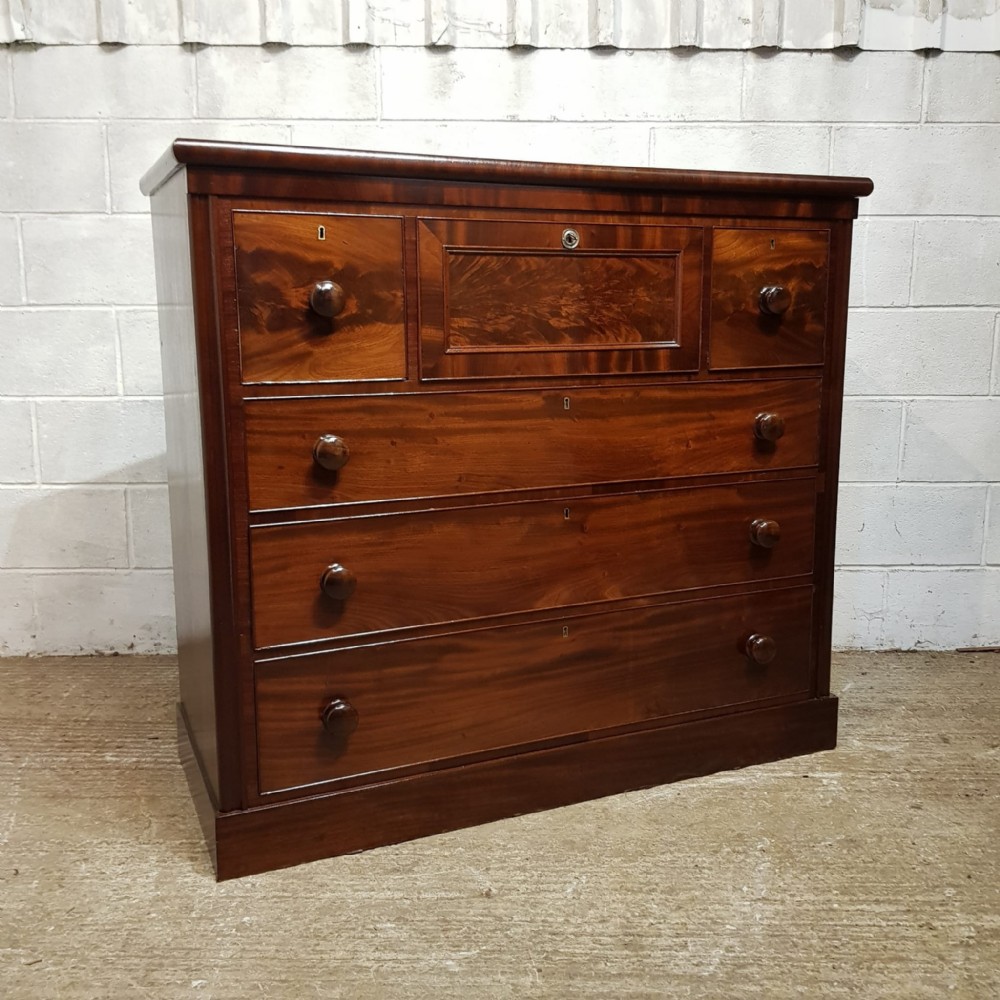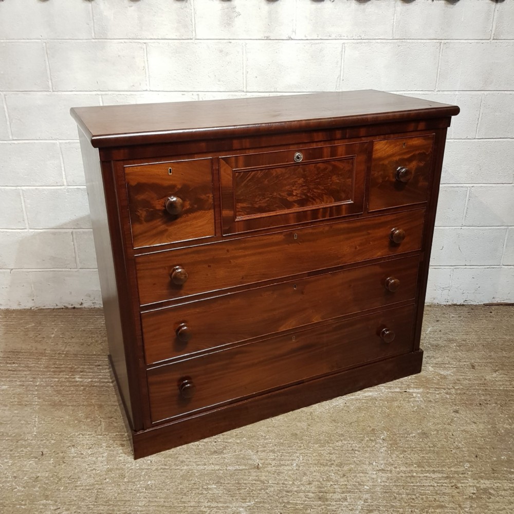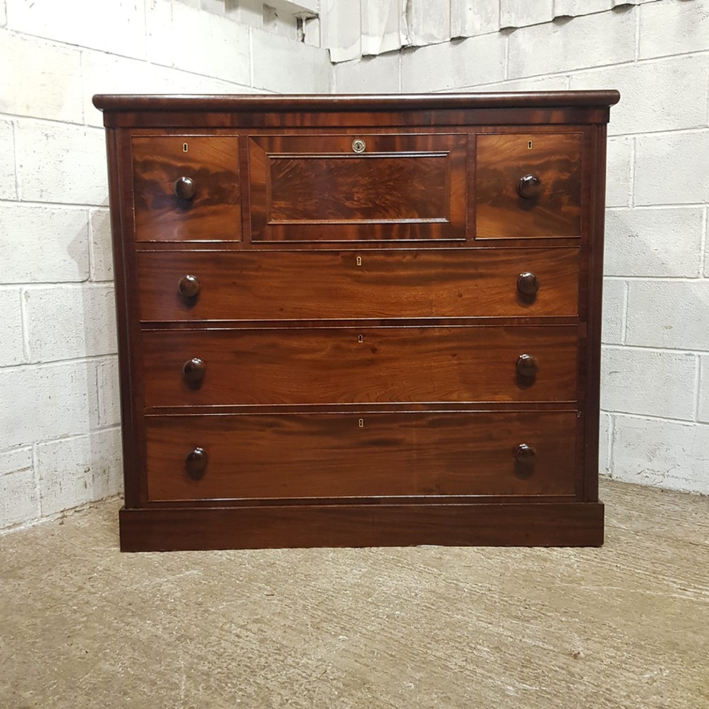 A large Victorian Mahogany chest of drawers and dating from around 1880. This chest of drawers has a rounded edge to the top with a lip underneath. The front at the top has three hat box drawers with the central one being longer with a moulded panel to the front. Underneath these are three long graduating drawers all of which are Oak lined with original nob handles. The chest is moulded down each side and stands on a plinth base.