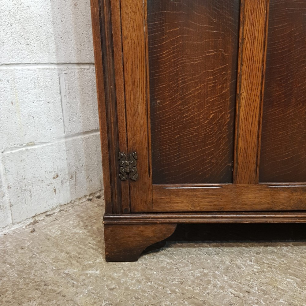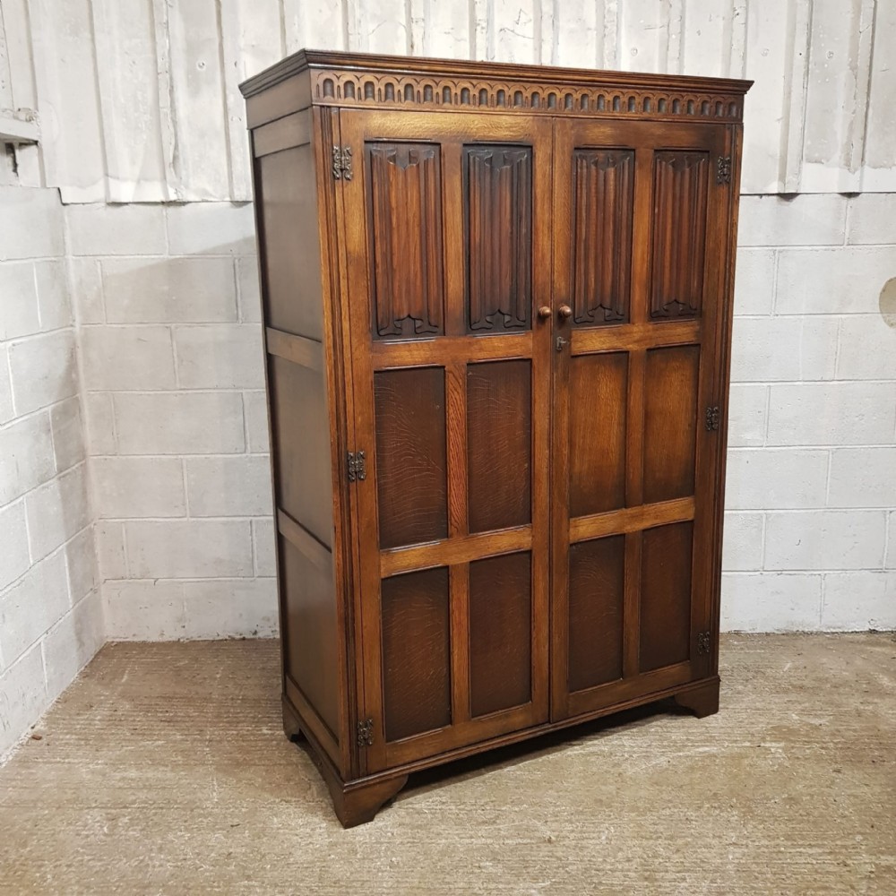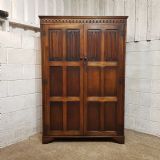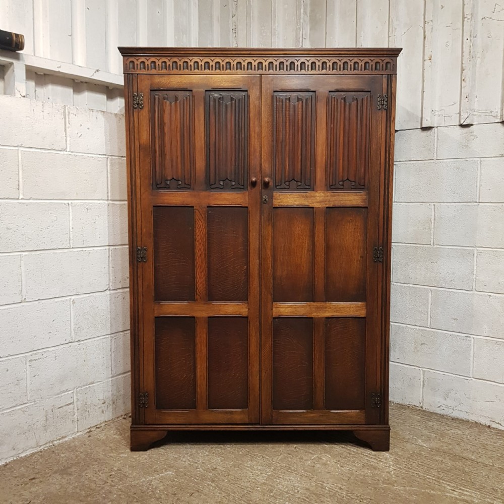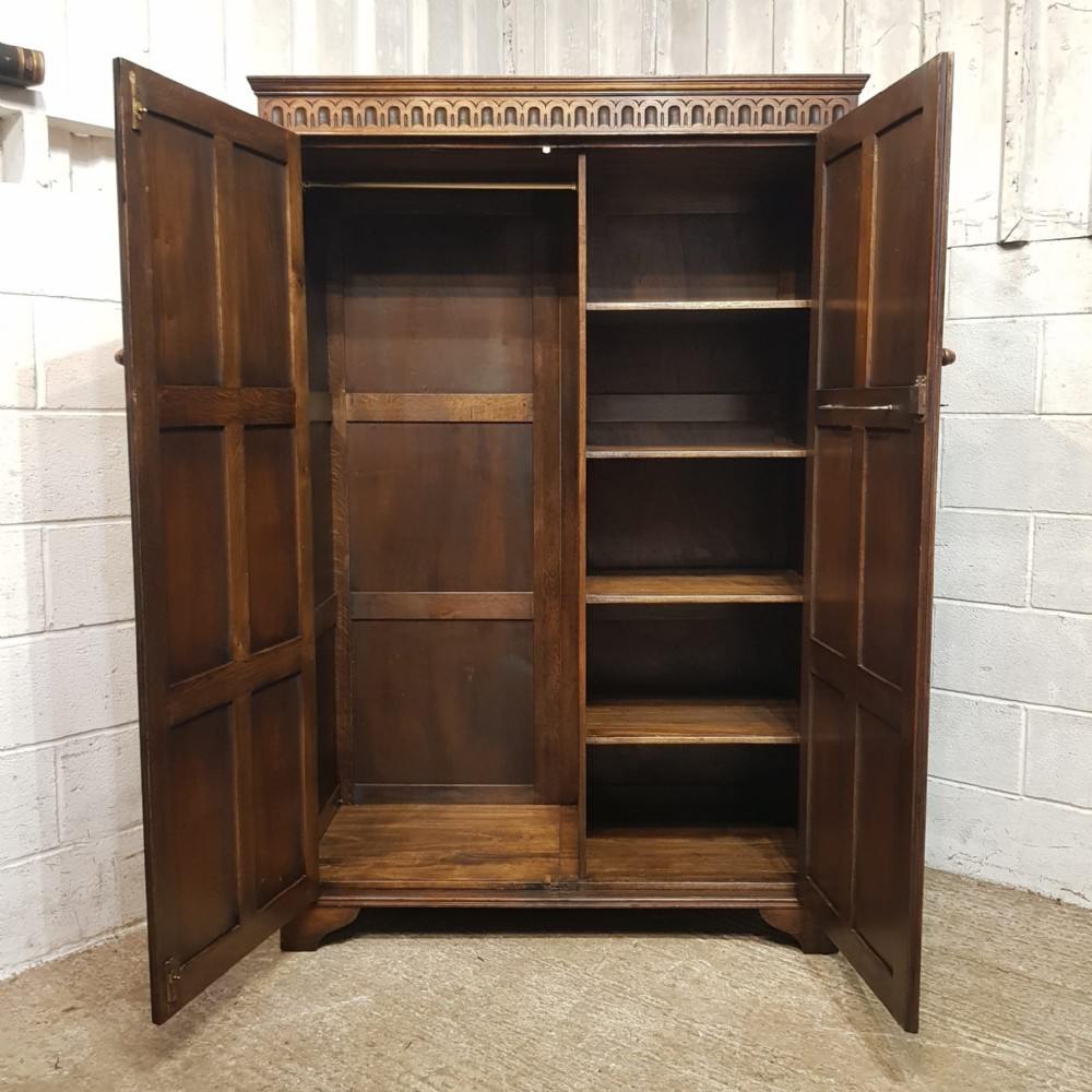 An antique Oak double wardrobe and dating from around 1920. This double wardrobe has a moulded cornice with a carved lip underneath. It has two doors to the front with both doors having two carved linen fold panels to the top with four moulded panels underneath, original nob handles and a key. Inside on the left is a hanging rail and on the right are four shelves. It is moulded around the bottom and stands on bracket feet and it separates for ease of movement.