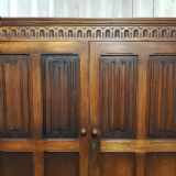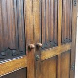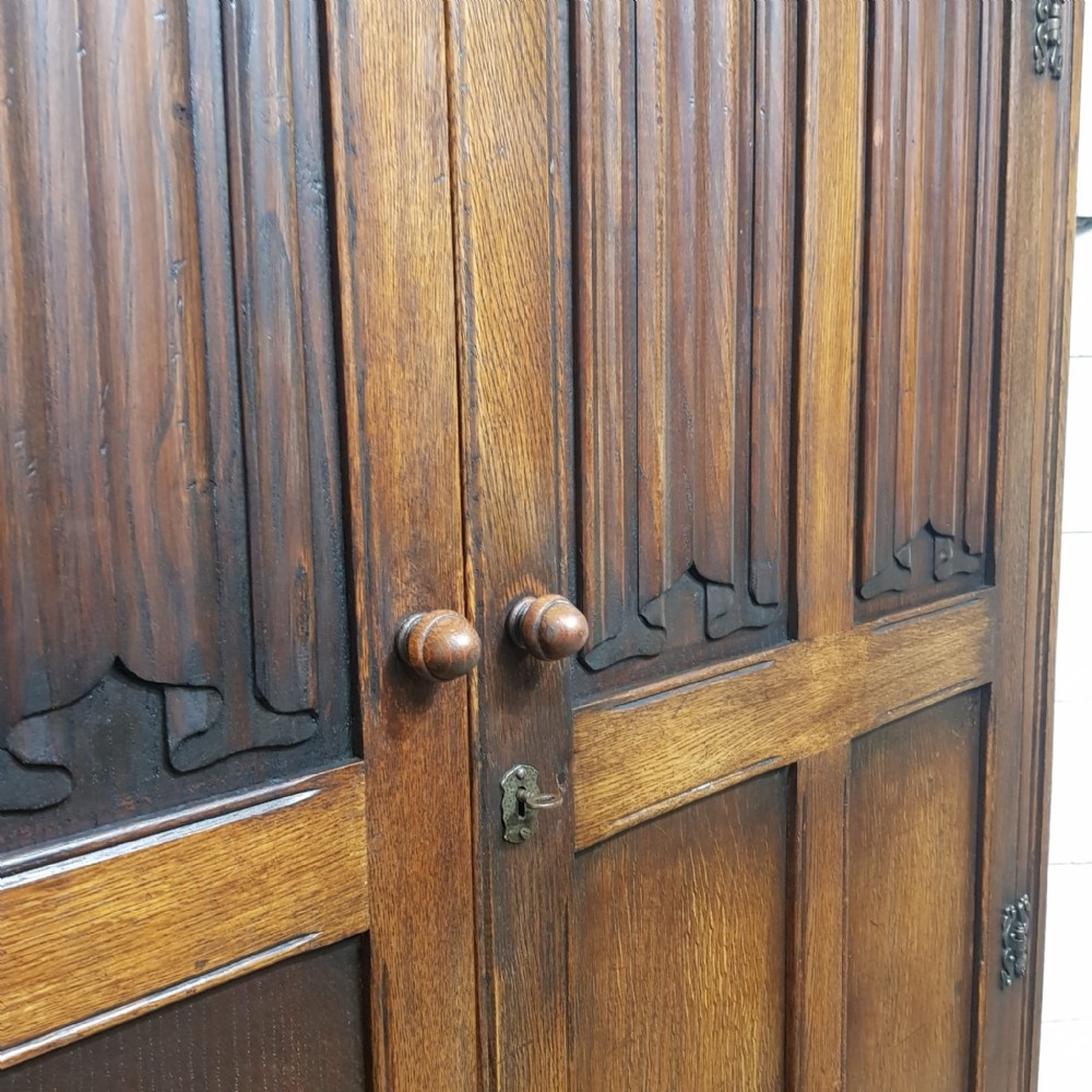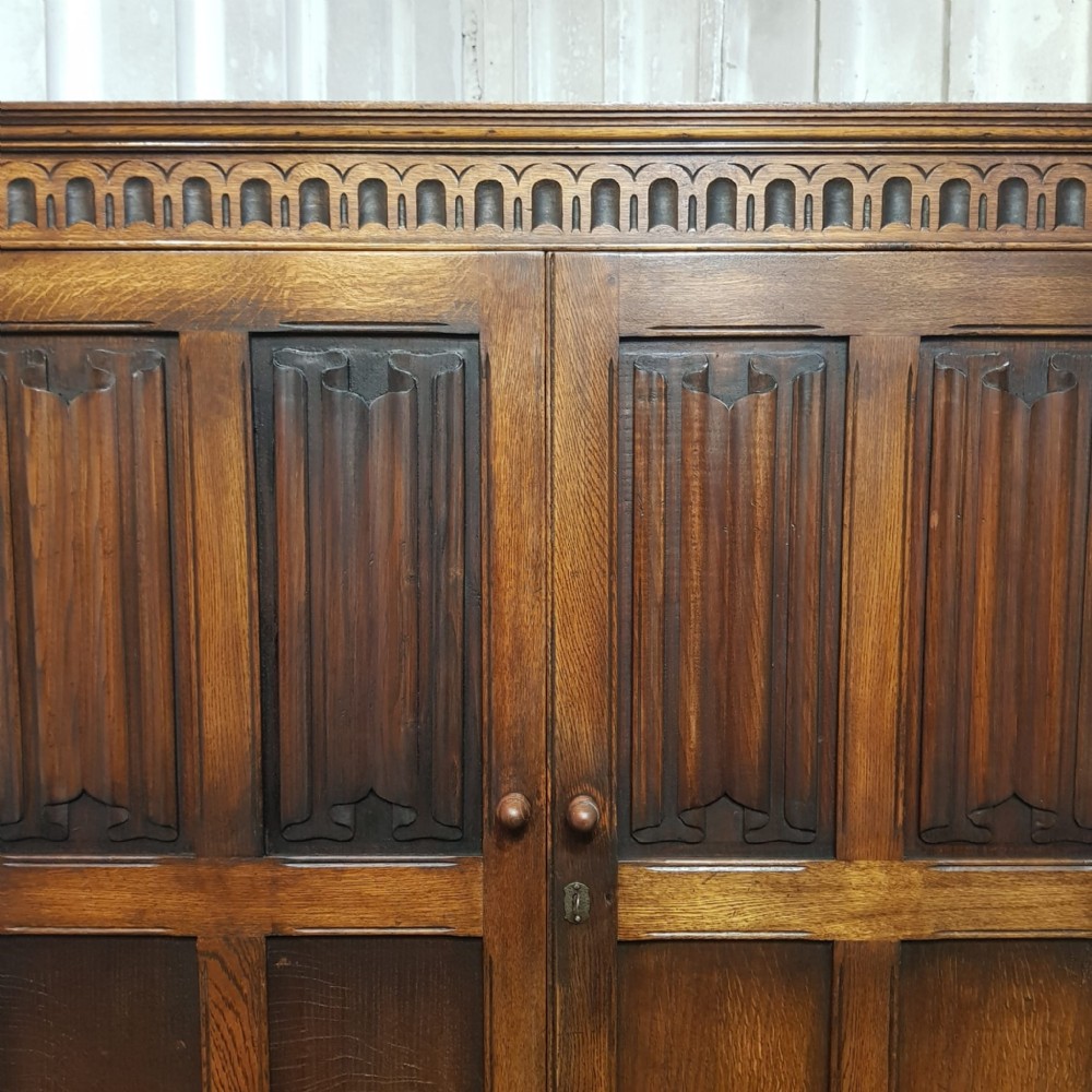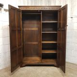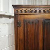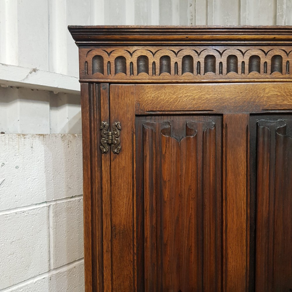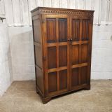 An antique Oak double wardrobe and dating from around 1920. This double wardrobe has a moulded cornice with a carved lip underneath. It has two doors to the front with both doors having two carved linen fold panels to the top with four moulded panels underneath, original nob handles and a key. Inside on the left is a hanging rail and on the right are four shelves. It is moulded around the bottom and stands on bracket feet and it separates for ease of movement.