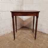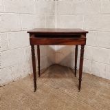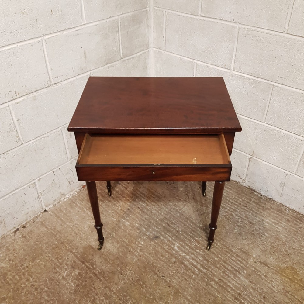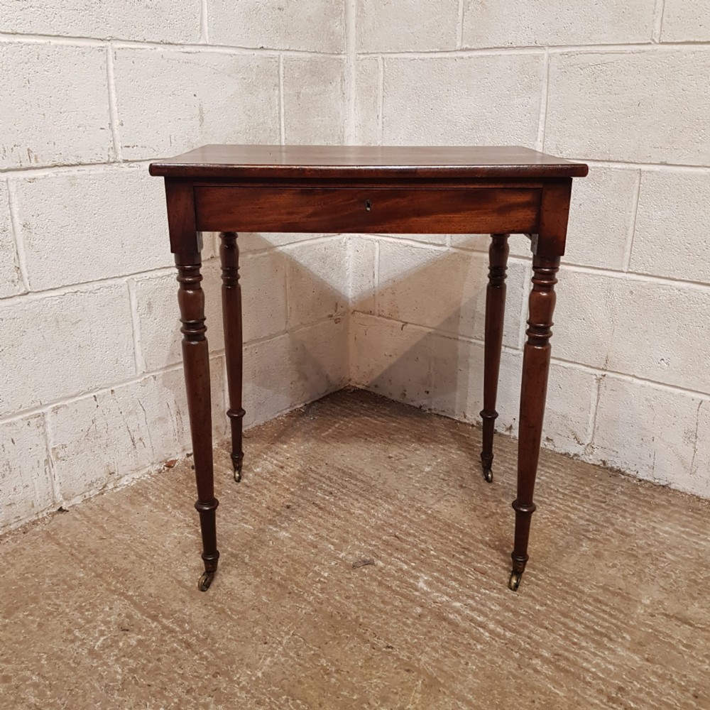 A Regency Mahogany small side table and dating from around 1810. This side table has a rounded edge to the top with a long frieze drawer underneath which is Mahogany lined. The table stands on ring turned legs on castors.