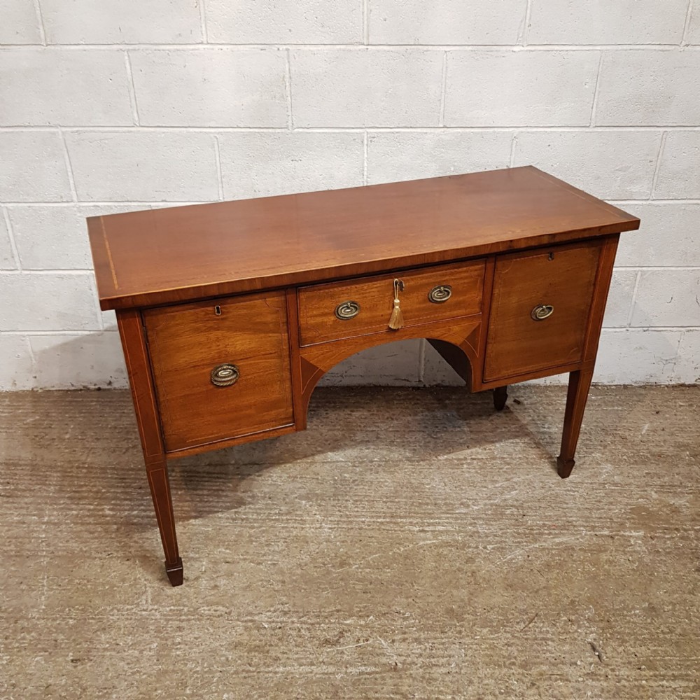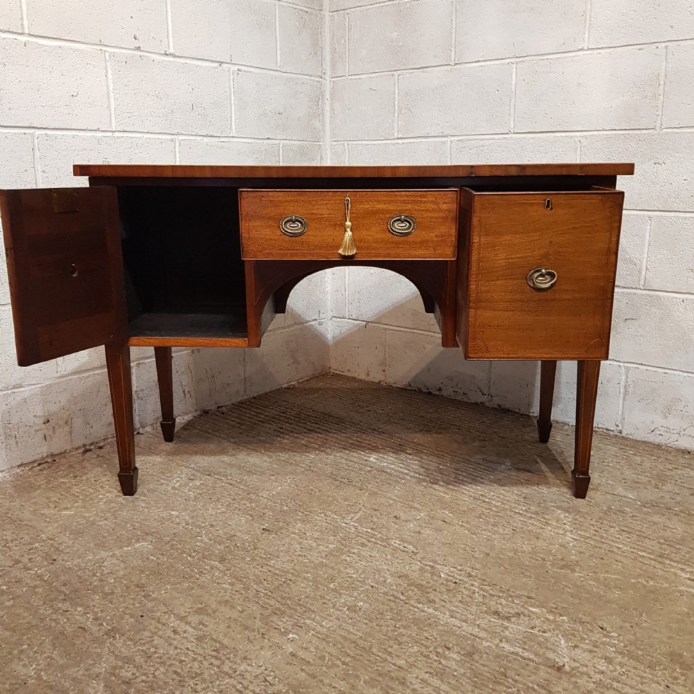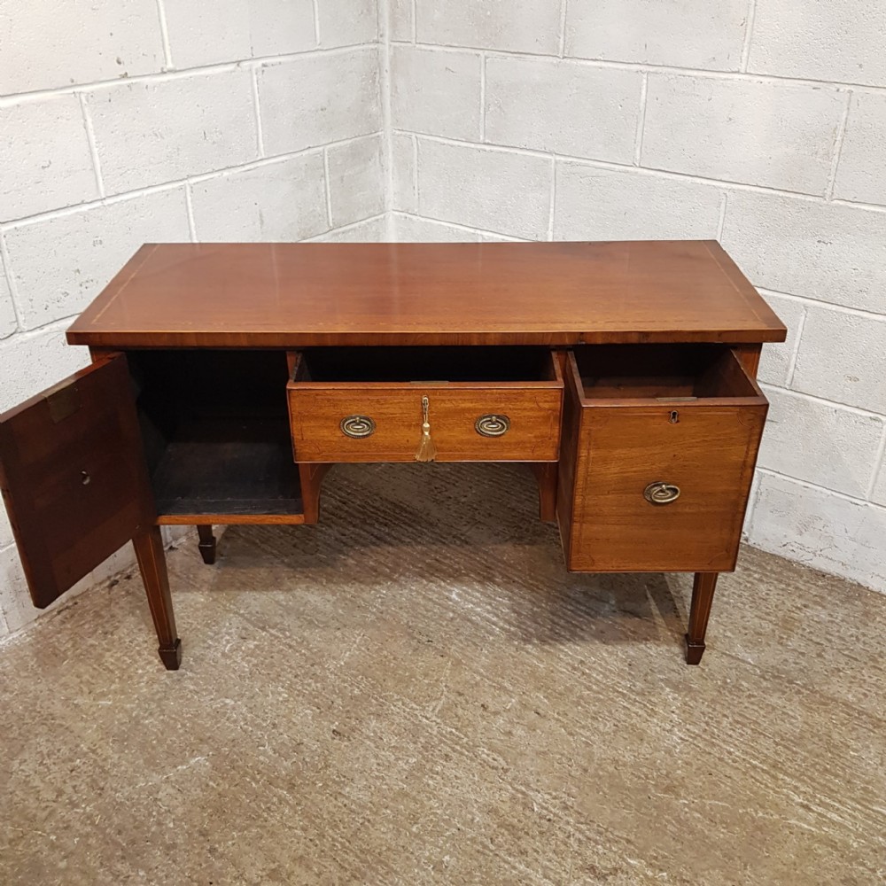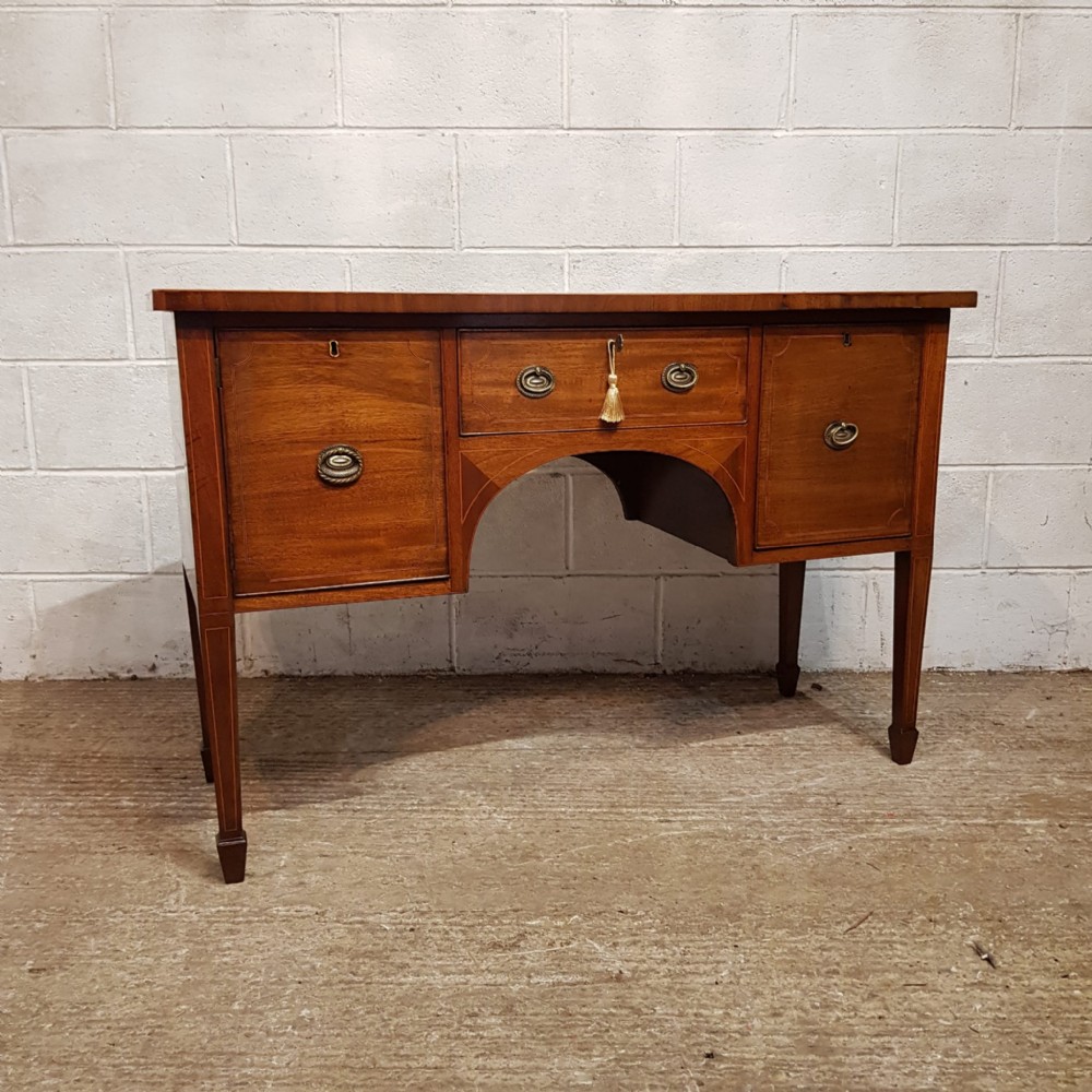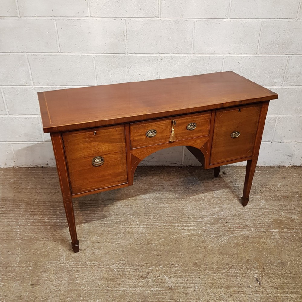 A Regency Mahogany small sideboard and dating from around 1810. This sideboard has a cross banded and Satin wood strung edge to the top with a strung drawer to the centre of the front and a strung frieze underneath. On the right side is a deep drawer with a strung front. On the right is a cupboard door with a strung front. It has its original Brass handles with a key and it stands on strung square tapered legs on a spade foot.