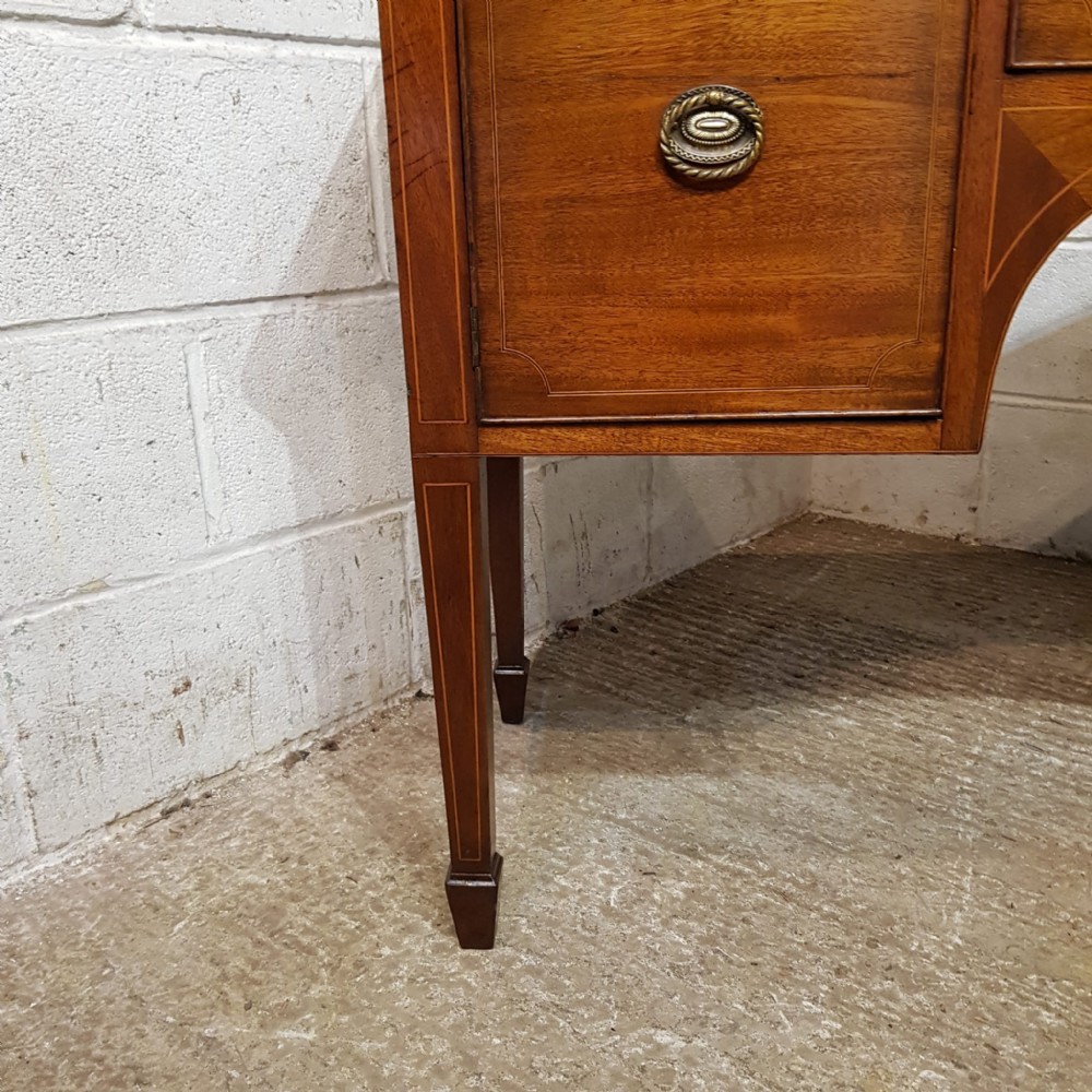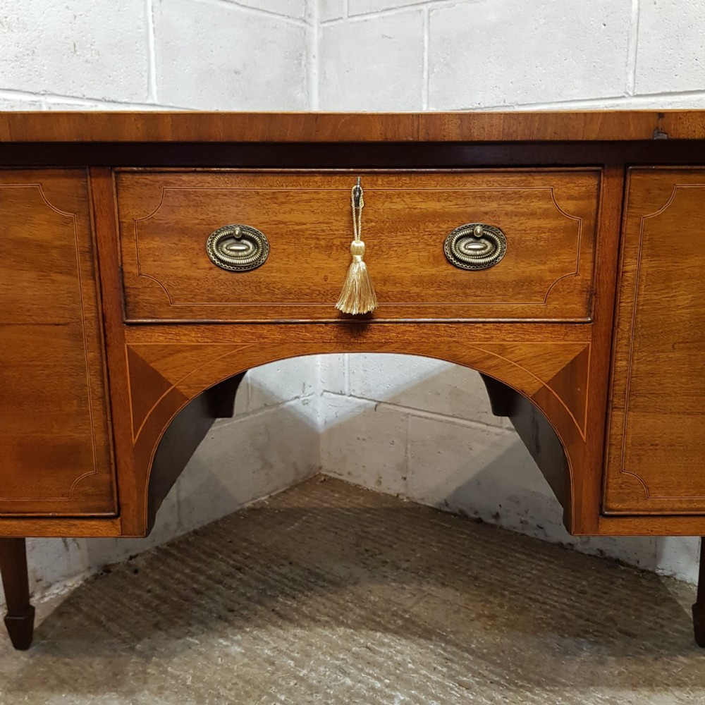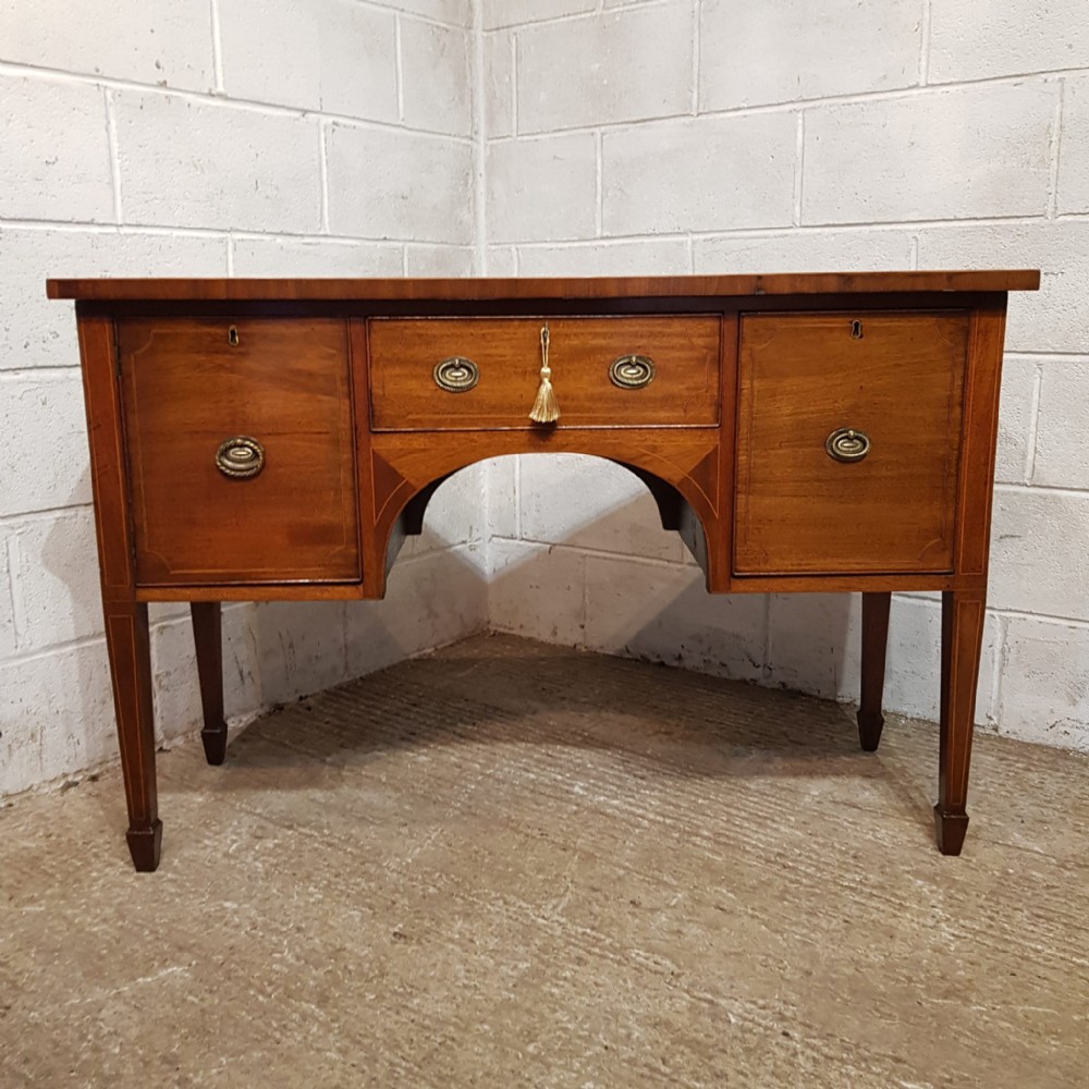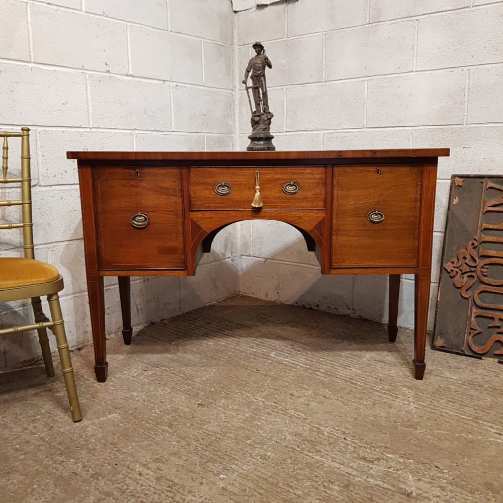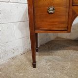 A Regency Mahogany small sideboard and dating from around 1810. This sideboard has a cross banded and Satin wood strung edge to the top with a strung drawer to the centre of the front and a strung frieze underneath. On the right side is a deep drawer with a strung front. On the right is a cupboard door with a strung front. It has its original Brass handles with a key and it stands on strung square tapered legs on a spade foot.
