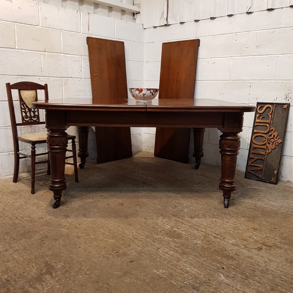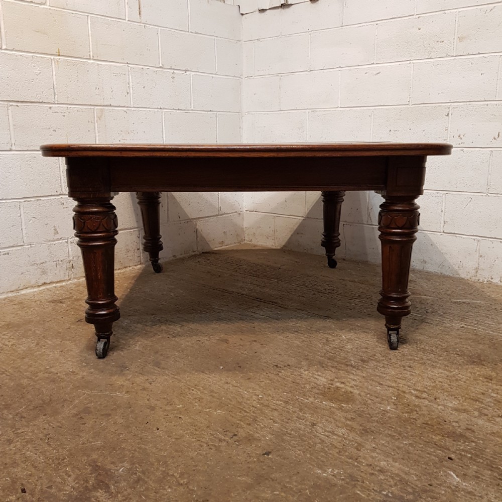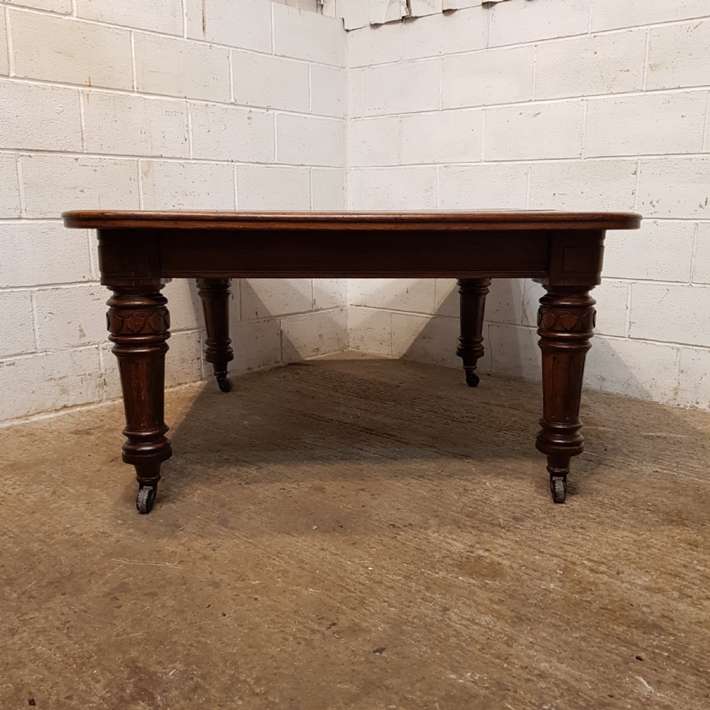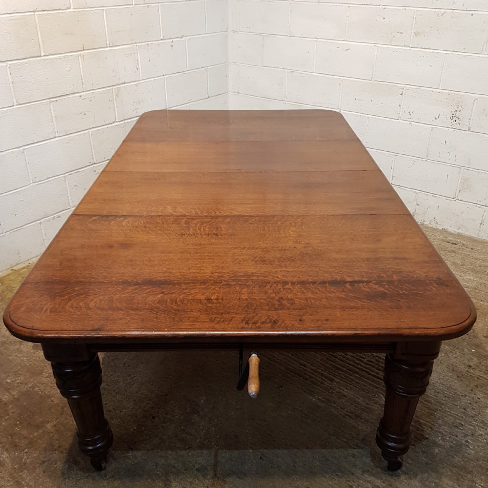 Antique Victorian Oak Extending Dining Table that can seat up to twelve people when extended. Constructed from quality oak it has a moulded edge to the top above a deep skirt and is raised on carved and fluted legs on castors. It extends by means of a Joseph Fitter winding mechanism and handle in very good working order and with the insertion of either one or two extra leaves.