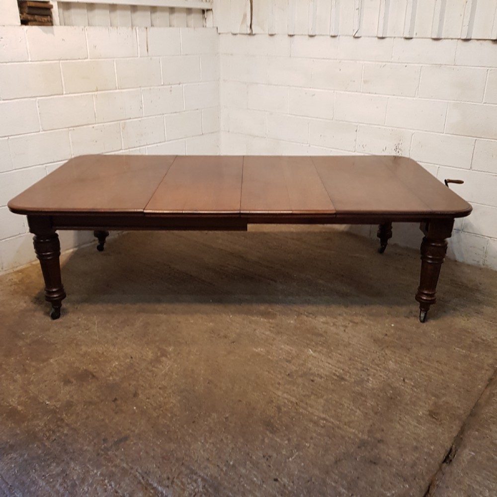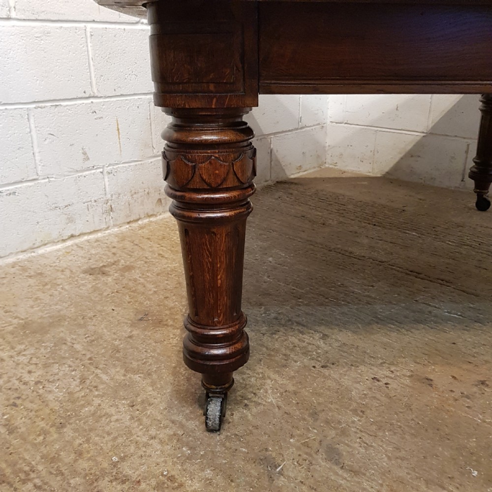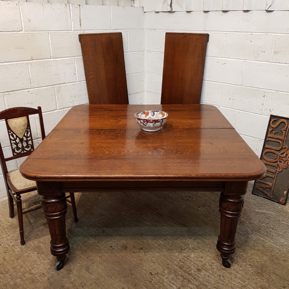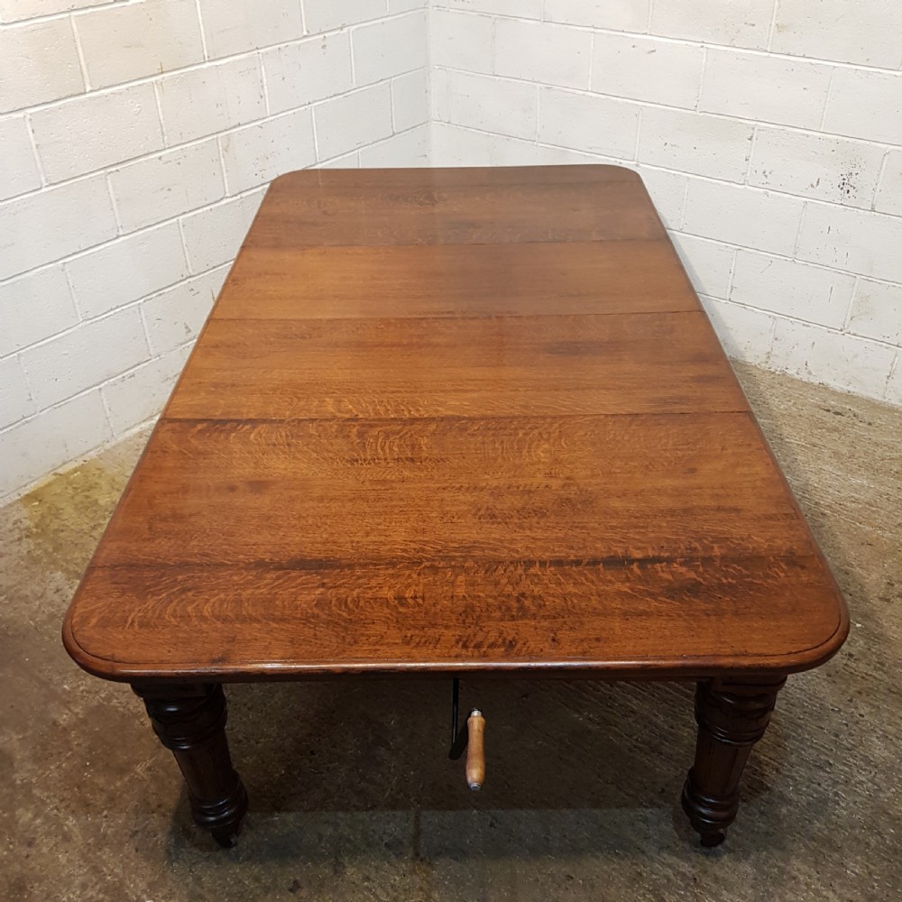 Antique Victorian Oak Extending Dining Table that can seat up to twelve people when extended. Constructed from quality oak it has a moulded edge to the top above a deep skirt and is raised on carved and fluted legs on castors. It extends by means of a Joseph Fitter winding mechanism and handle in very good working order and with the insertion of either one or two extra leaves.