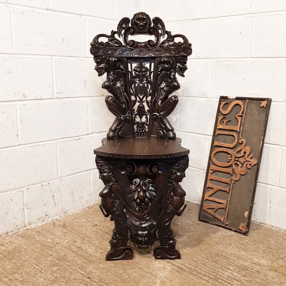 Antique ITALIAN Carved walnut Sgabello Hall Chair of Renaissance Revival and dating from around 1850. Constructed from solid walnut it is profusely carved with full length figurines , masks and fruits with a crested plank seat.