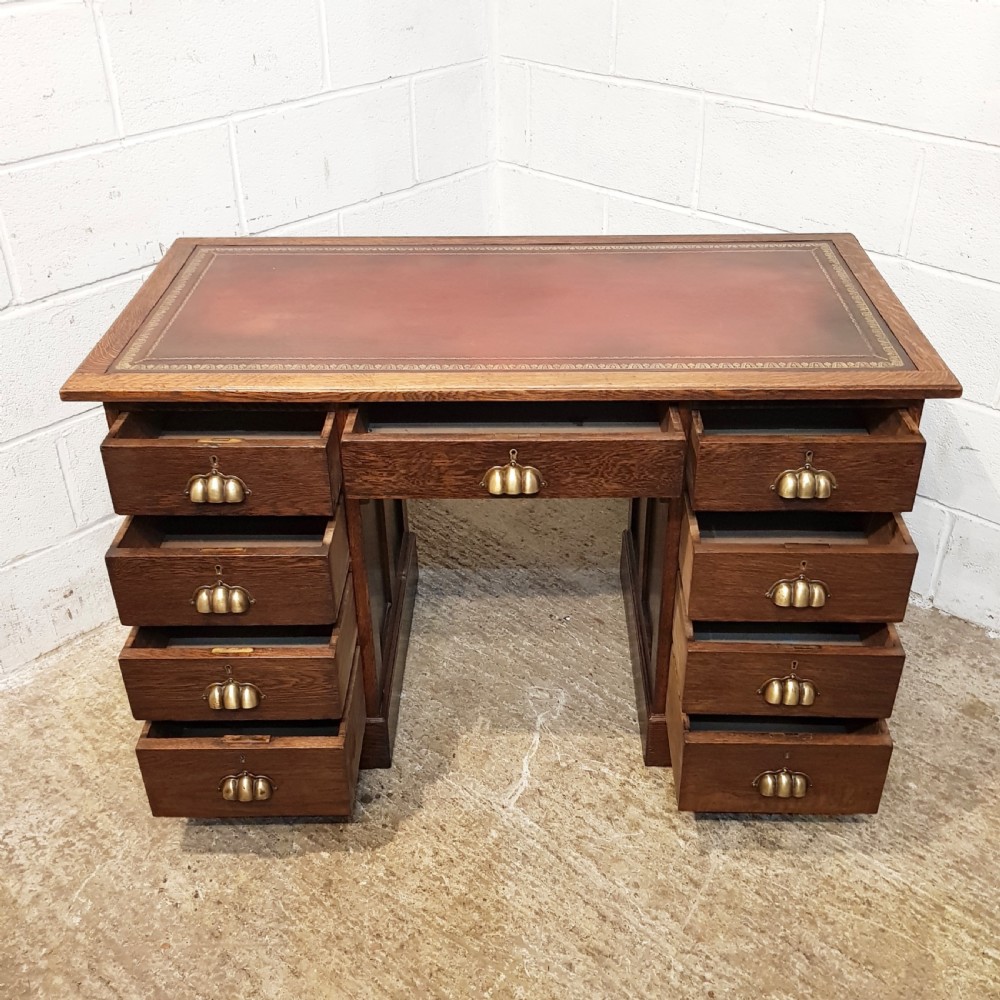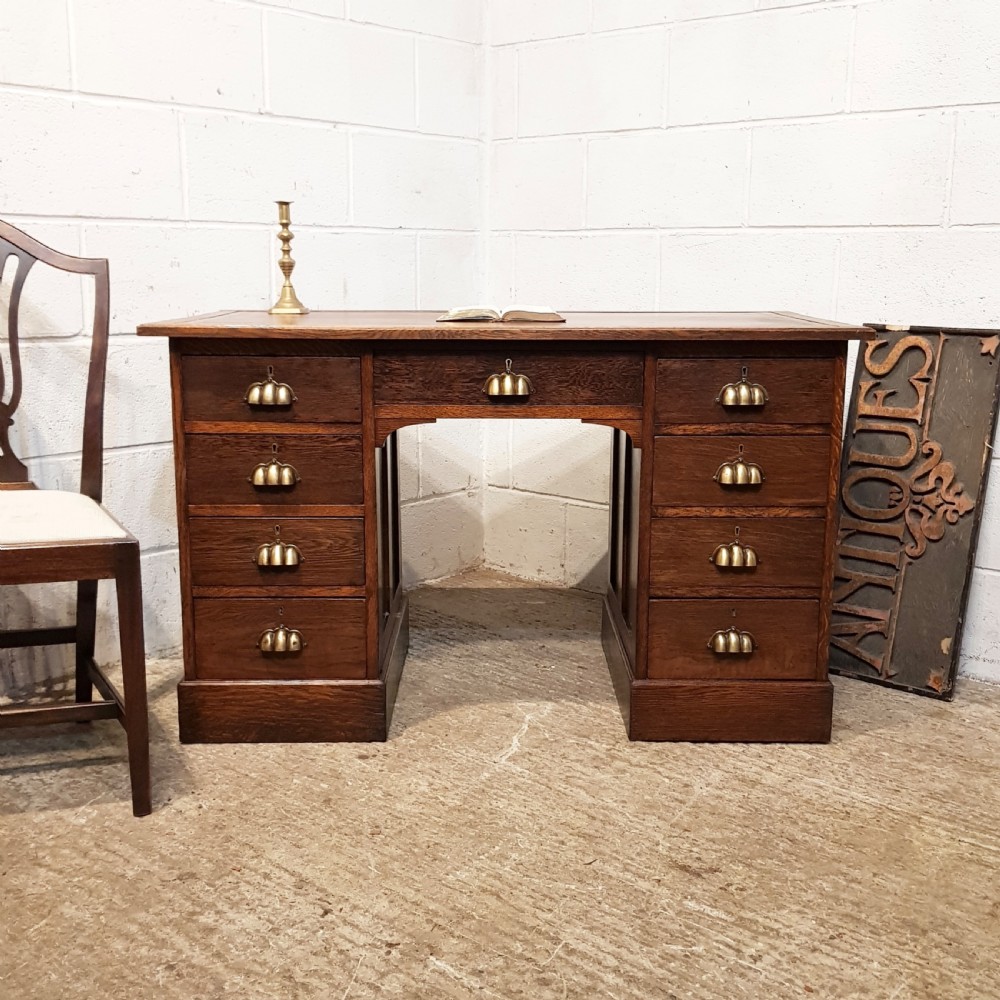 Antique Late Victorian OAK Twin Pedestal Desk and dating from around 1890. Constructed from quality oak it has a leather embossed skiver set within a moulded edge. This is above a central drawer flanked on either side by four pine lined graduating drawers all of which have original brass cup handles. It has panelled sides and is raised on a plinth base.
