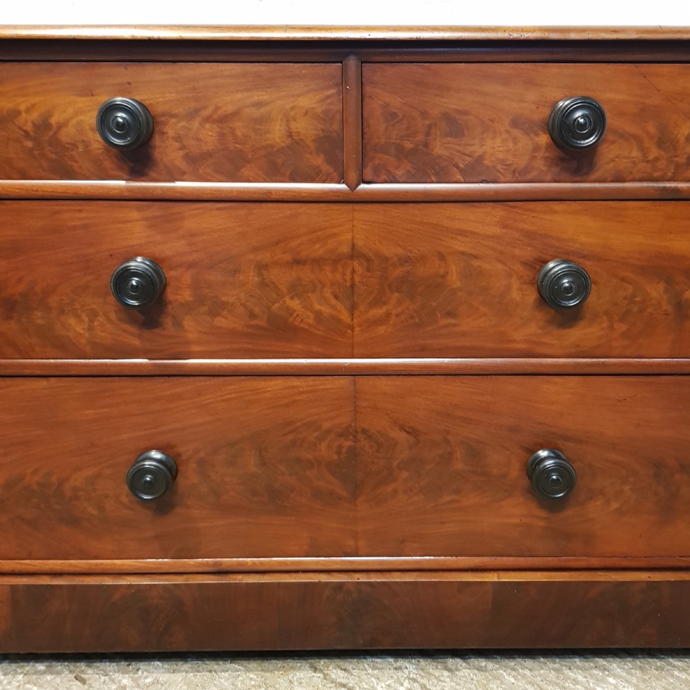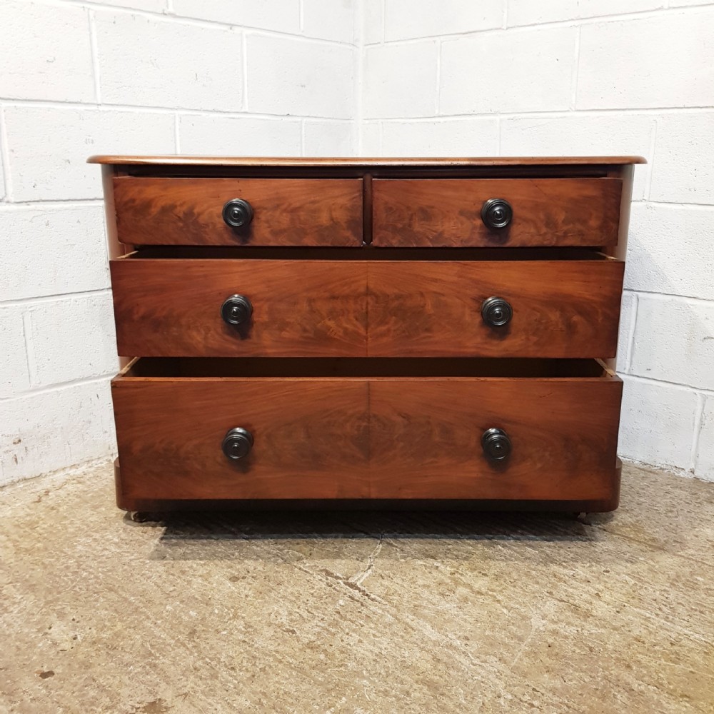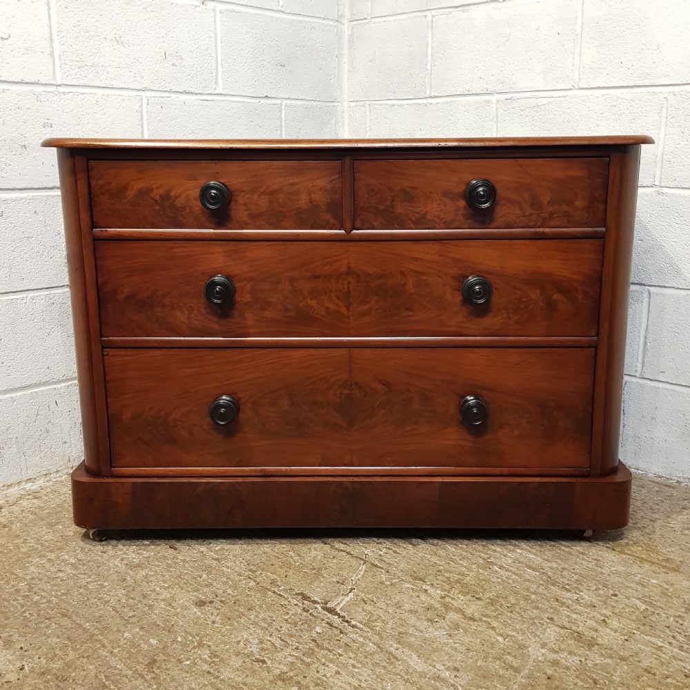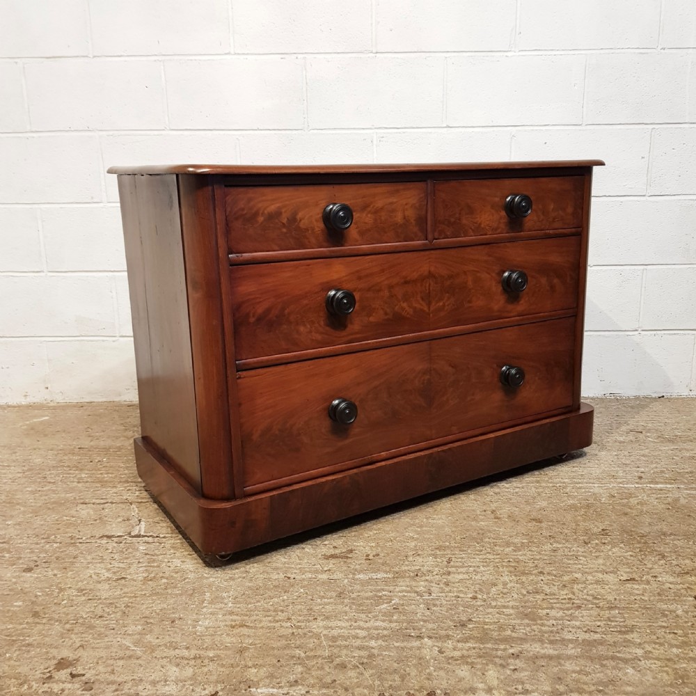 Antique Victorian mahogany chest of drawers and dating from around 1880. Constructed from quality mahogany it has a rounded edge to the top above two short drawers over two long graduating drawers all of which are oak lined with ebony turned knob handles. It has moulded corners and is raised on a deep plinth base on casters.