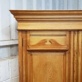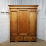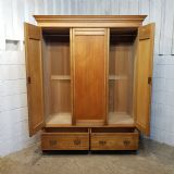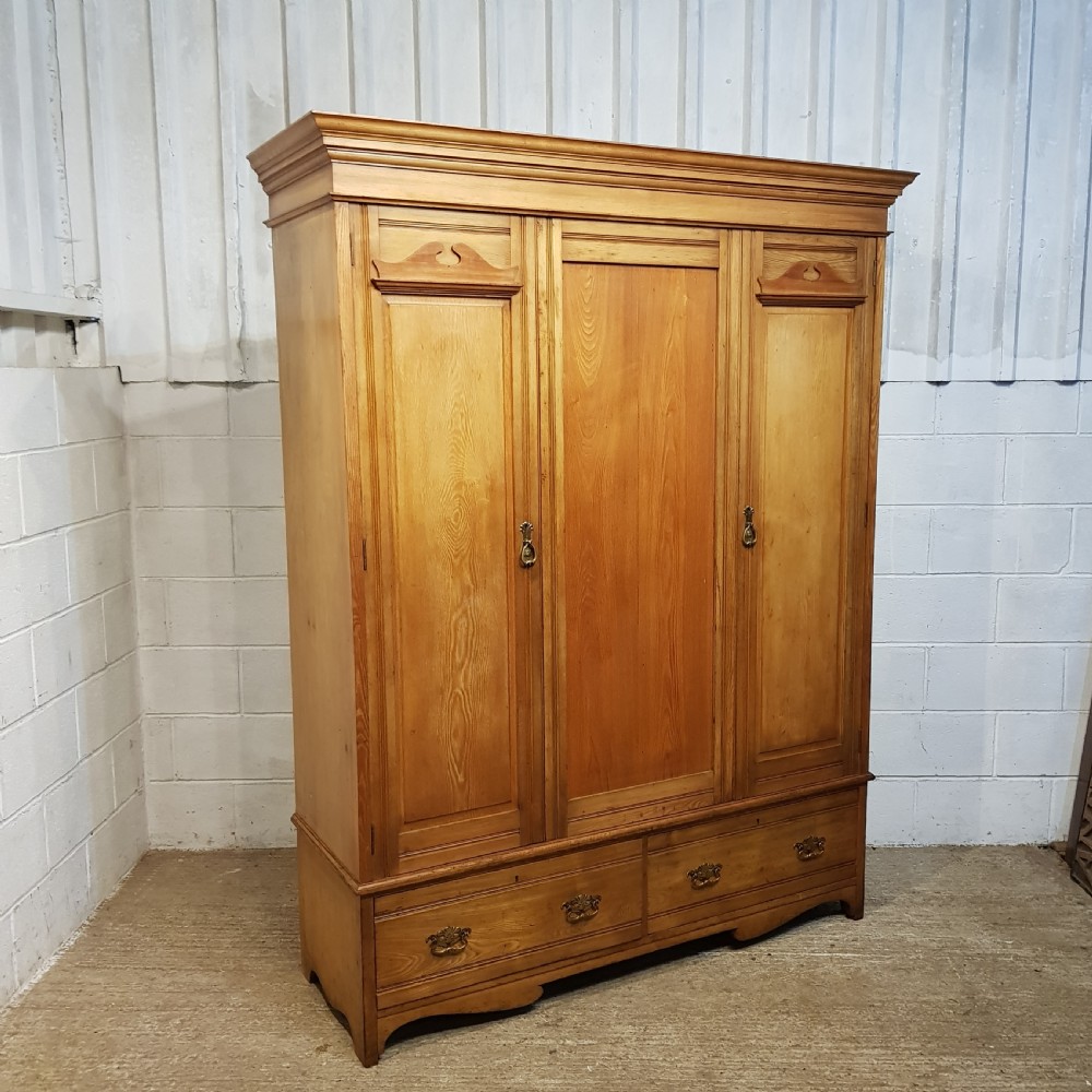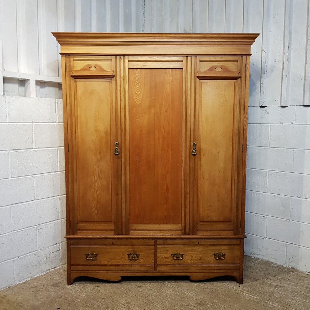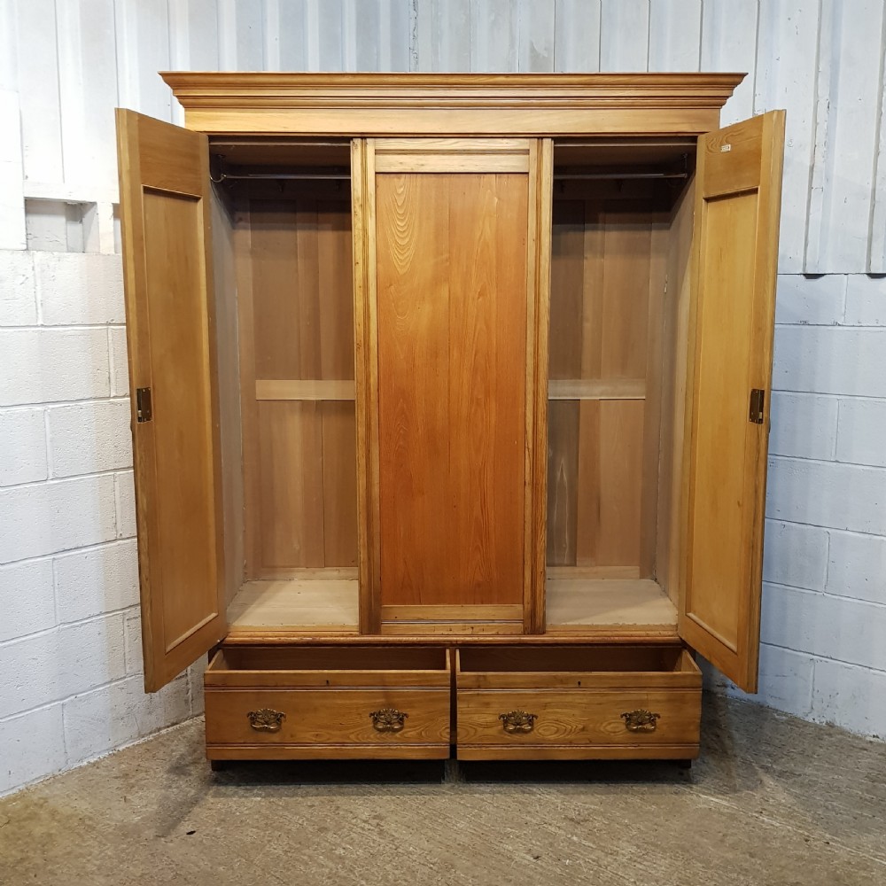 An antique Edwardian Ash double wardrobe and dating from around 1900. This double wardrobe has a moulded cornice with a lip under. It features a central moulded panel to the front with a door to each side. Each door has a long fielded panel with shaped frieze above. Both doors have original brass handles and inside is a hanging rail to each side. The base has two deep drawers and are oak lined with original brass handles. It stands on bracket feet with a shaped frieze between the feet. It separates into five pieces for ease of movement.