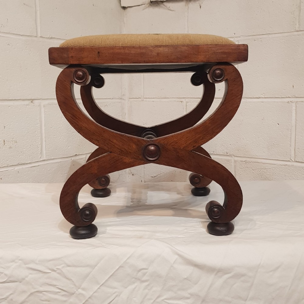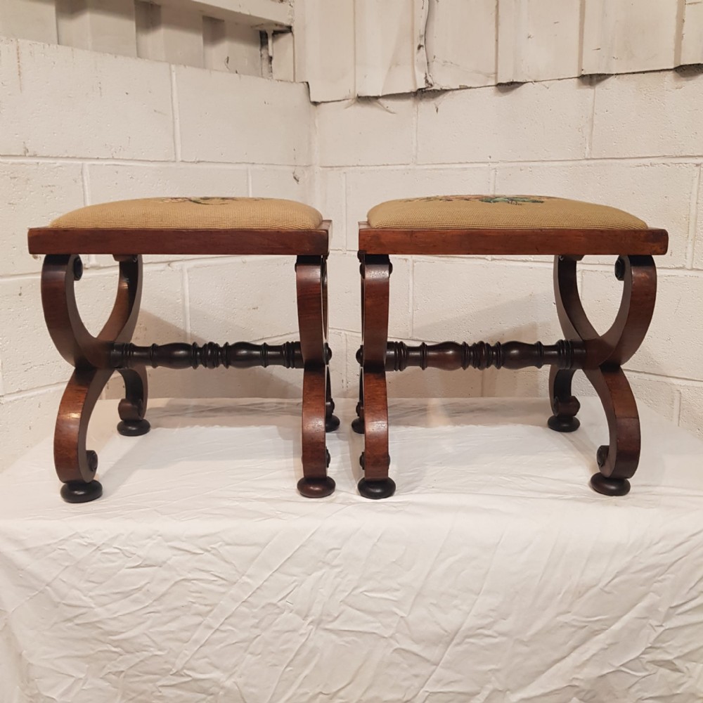 An antique pair of Walnut stools and dating from around 1880. These lovely pair of stools have a drop in needle point seat and the pads are in very good condition. They are on an X frame which ends on small bun feet with spandels to each corner with a turned stretcher between them.