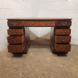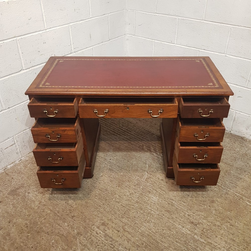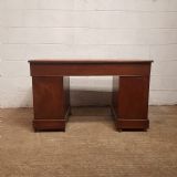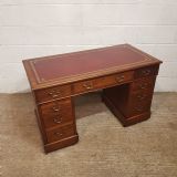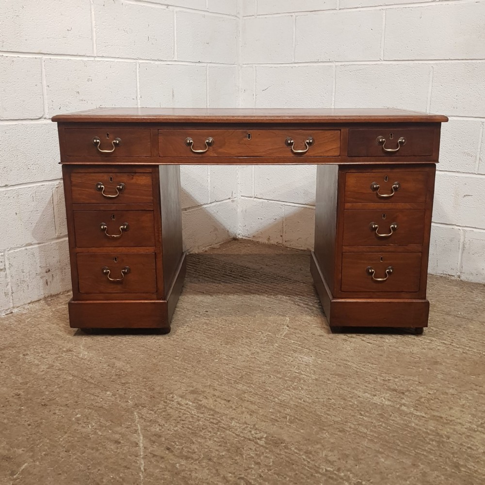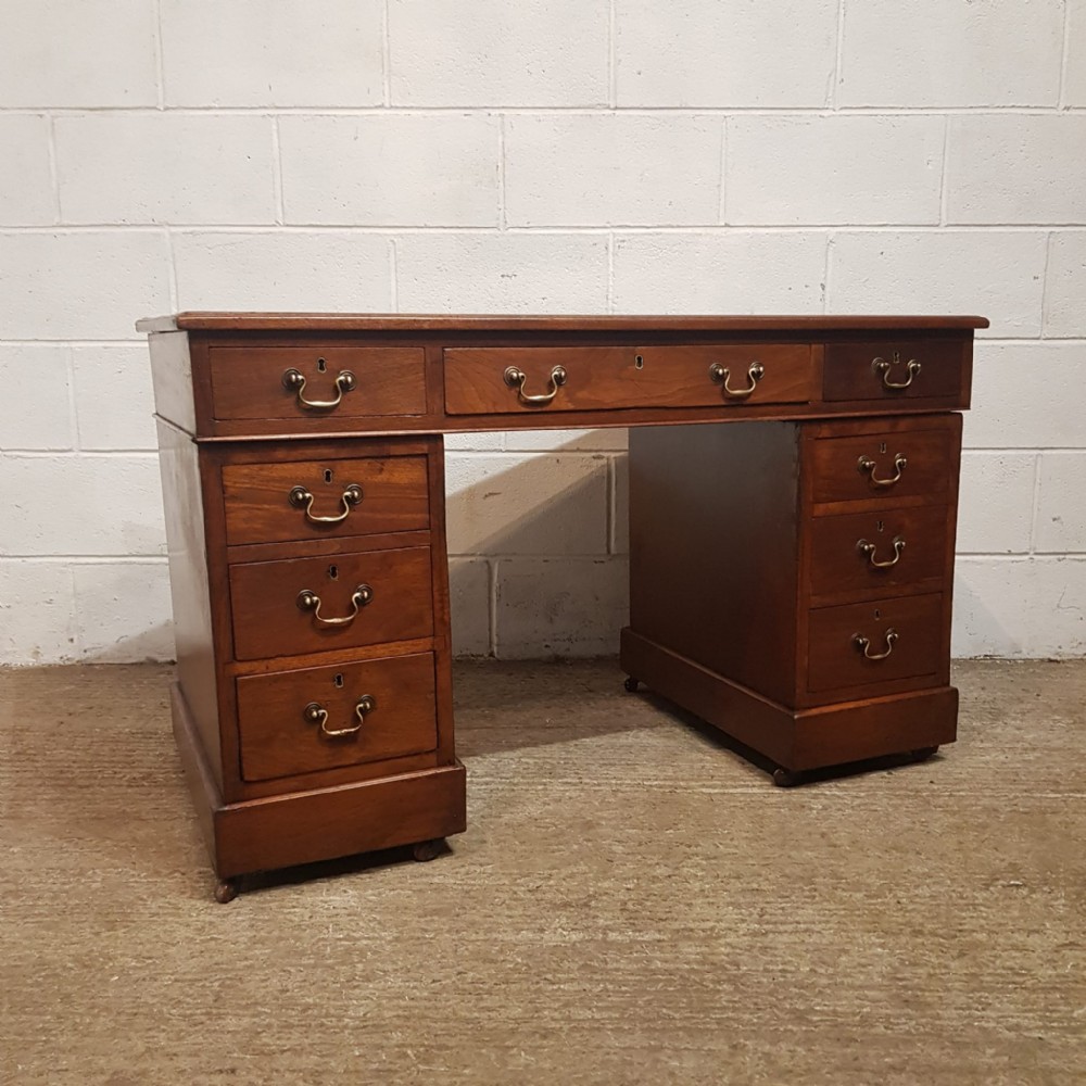 An Edwardian Mahogany twin pedestal desk and dating from around 1900. This pedestal desk has a gold embossed leather writing surface and a moulded edge to the top. It has three drawers across the front of the top and each pedestal has three graduating drawers. All drawers are pine lined with original brass handles. Pedestals stand on a plinth base on castors and the desk separates into three different pieces.