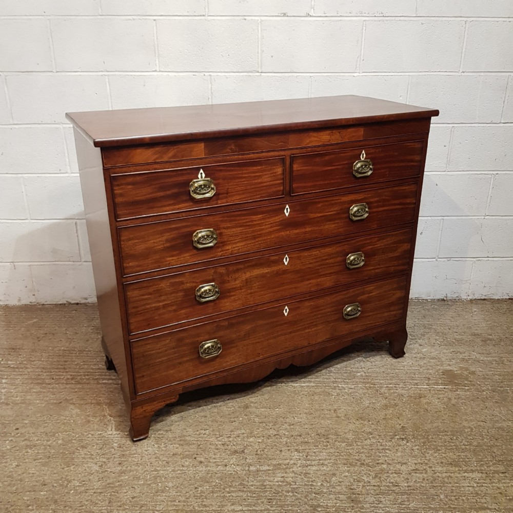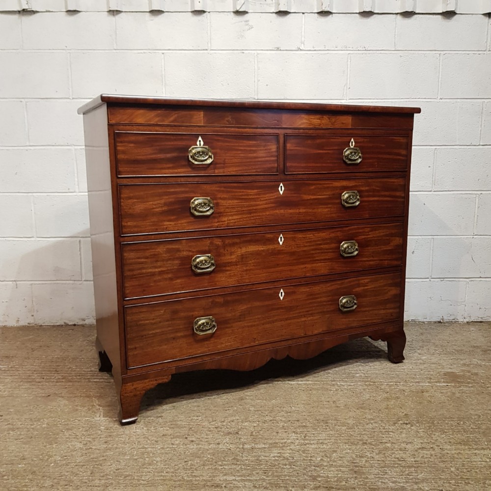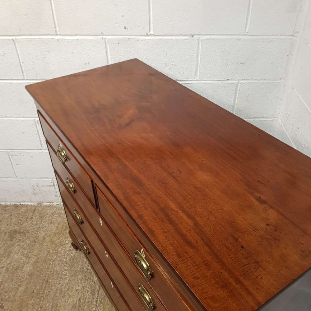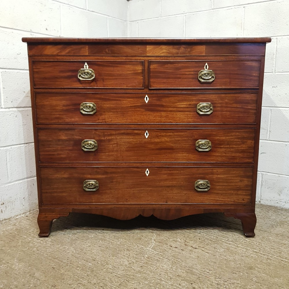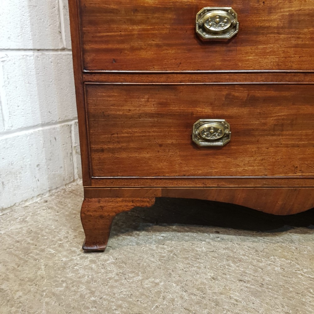 A George 3rd Mahogany Four height Chest of Drawers and dating from around 1780. This stunning chest of drawers has a rounded edge to the top with a crossbanded and strung lip under. It has two short over three long graduating drawers all of which are Oak lined with original brass handles and Ivoreen lock escutcheons. It stands on Ogee bracket feet with a shaped frieze in between.