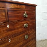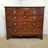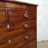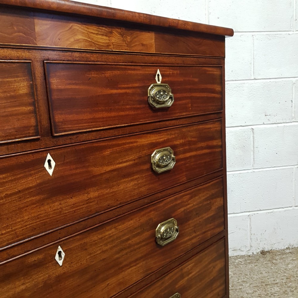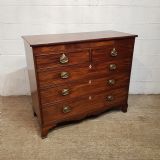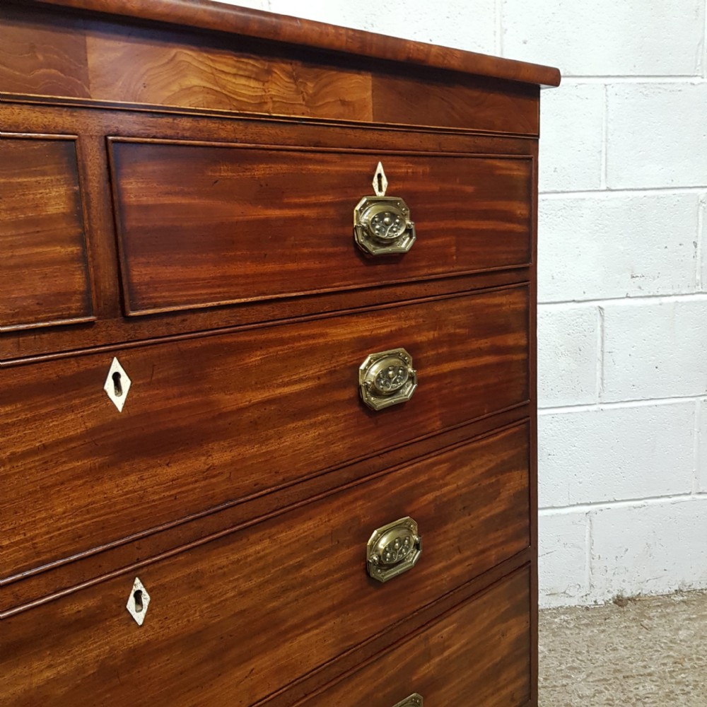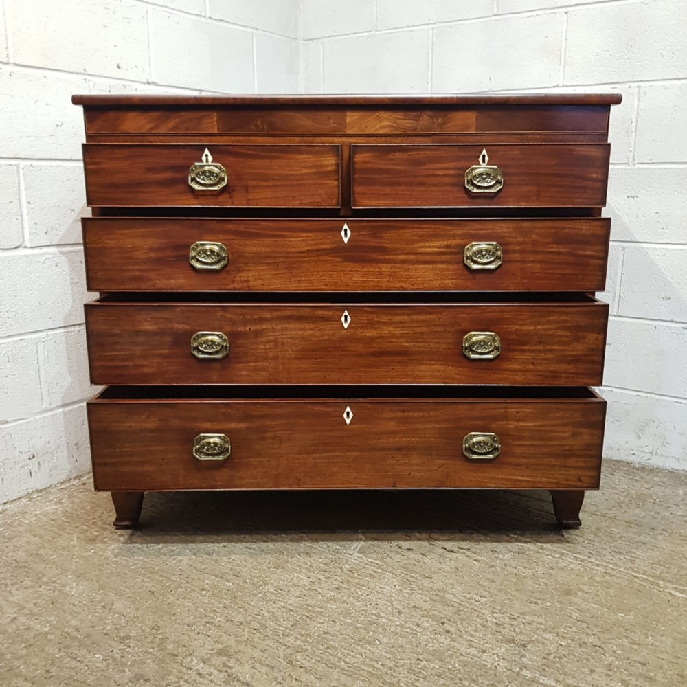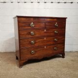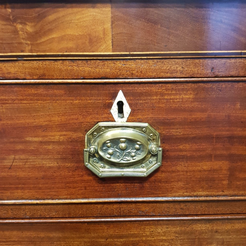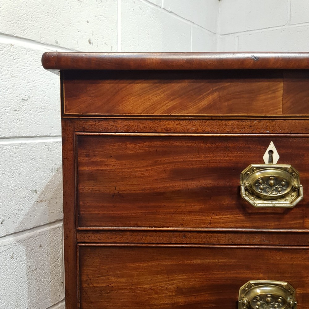 A George 3rd Mahogany Four height Chest of Drawers and dating from around 1780. This stunning chest of drawers has a rounded edge to the top with a crossbanded and strung lip under. It has two short over three long graduating drawers all of which are Oak lined with original brass handles and Ivoreen lock escutcheons. It stands on Ogee bracket feet with a shaped frieze in between.