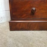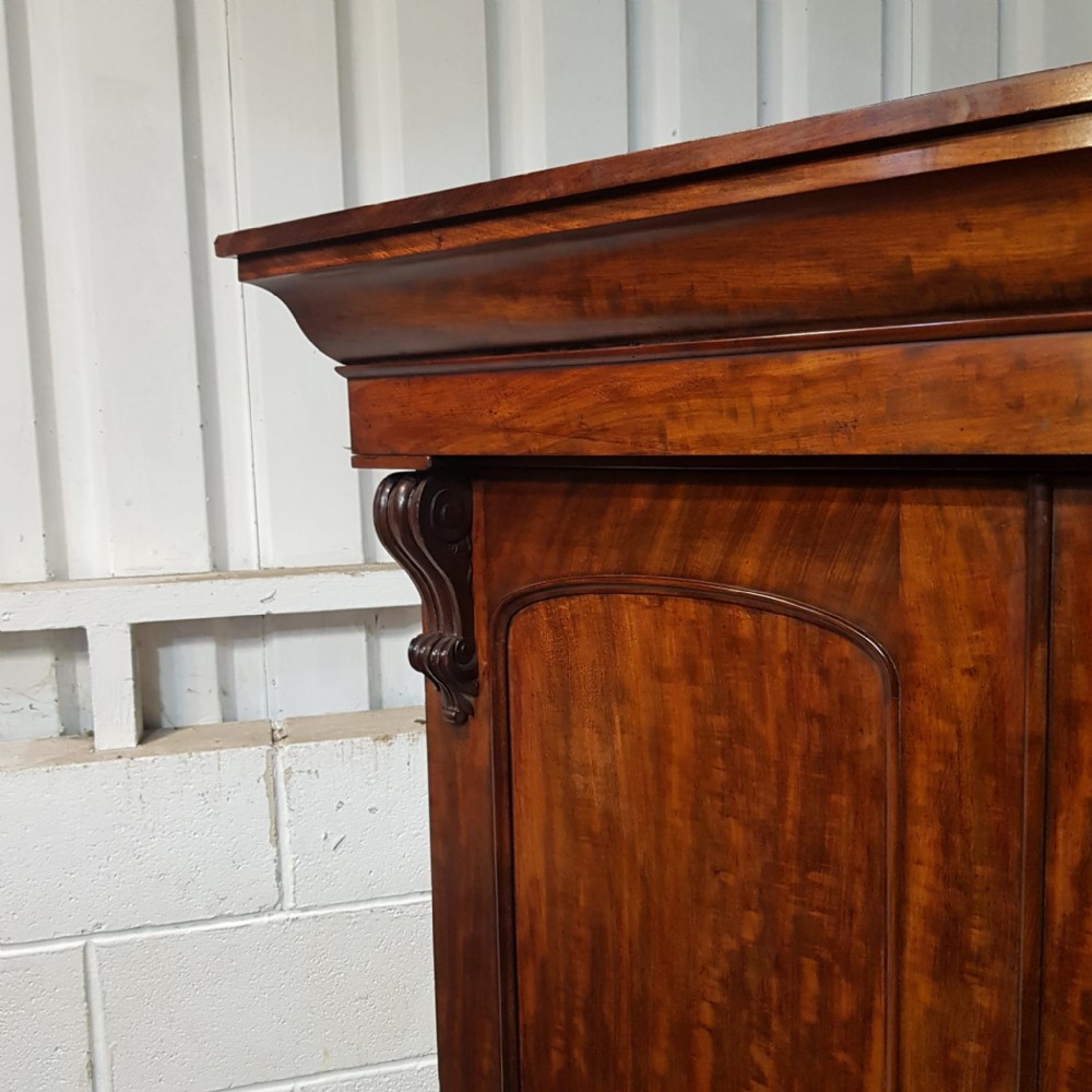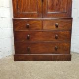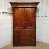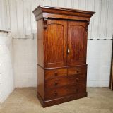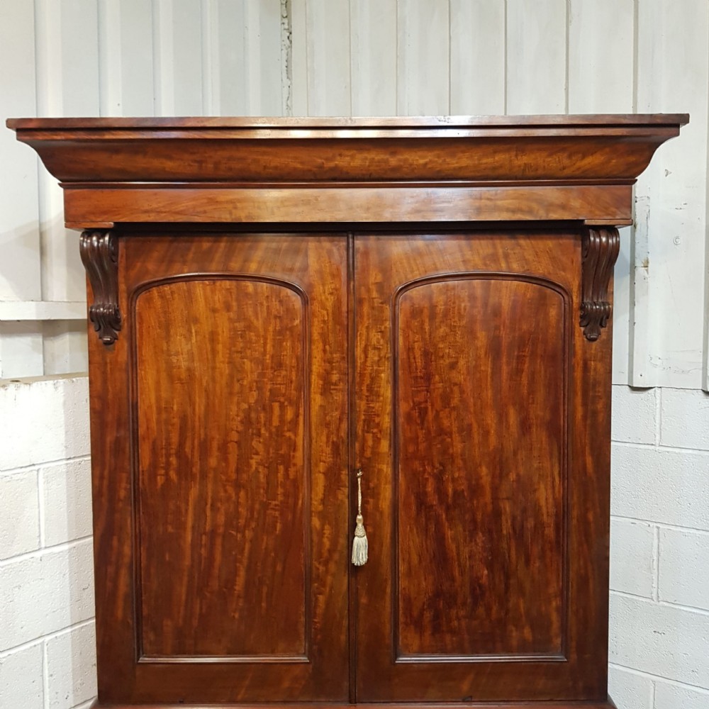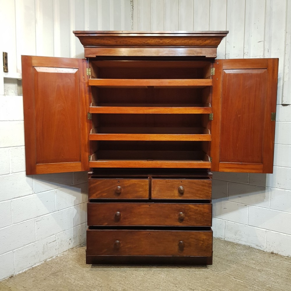 A William 4th Mahogany linen press and dating from around 1830. This original linen press has a flared moulded cornice with a wide lip underneath and a carved corbal to each side under the cornice. It has two doors, both of which have an arched moulded panel and a key. Inside, behind the doors are four slide trays. The base has two short drawers over two long graduating drawers all of which are Oak lined with original knob handles. It stands on a plinth base and separates into three pieces for ease of movement.