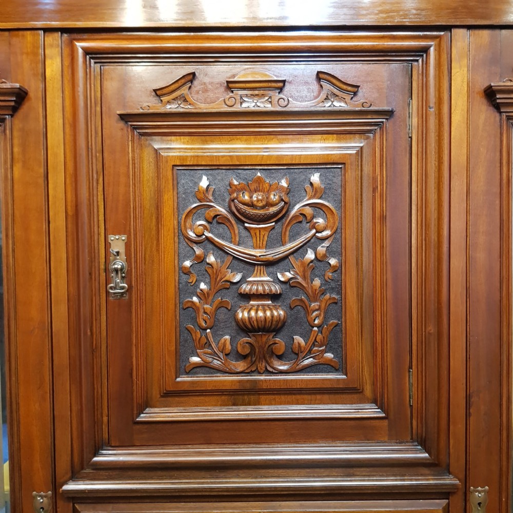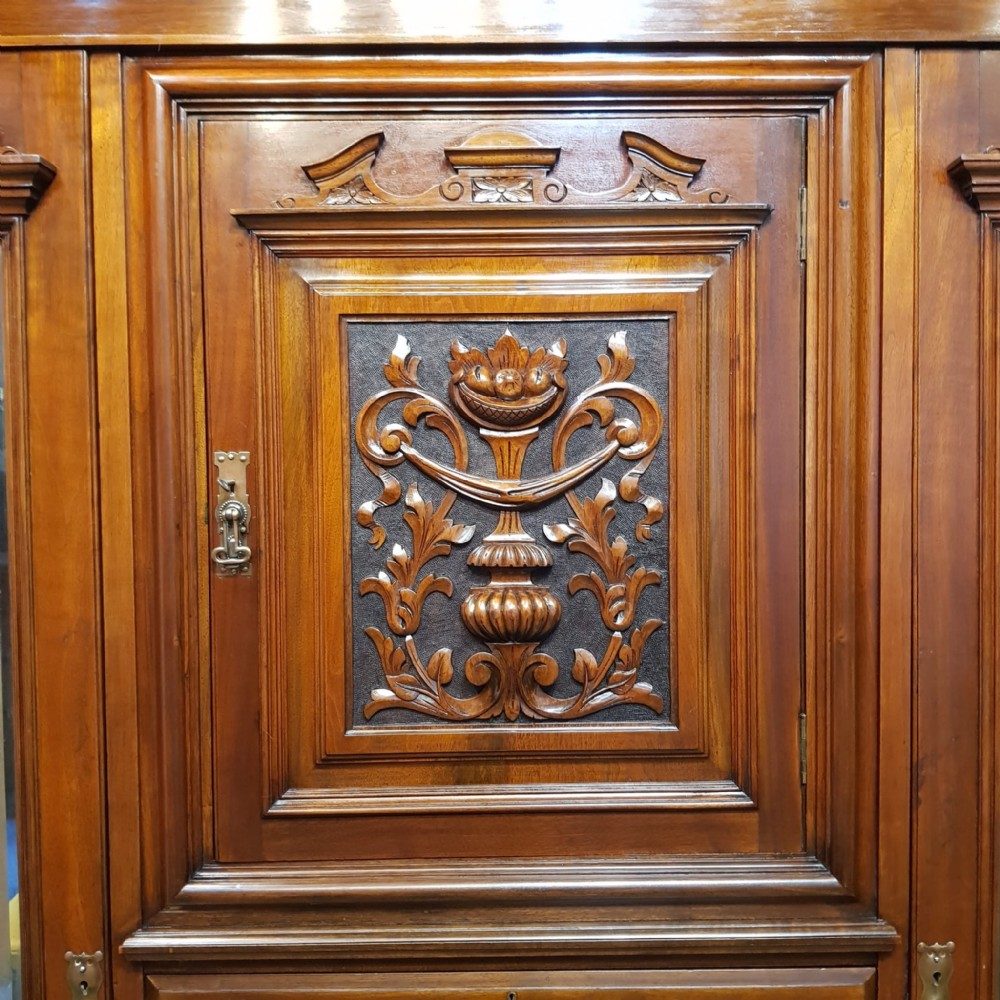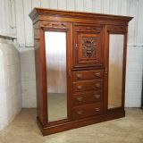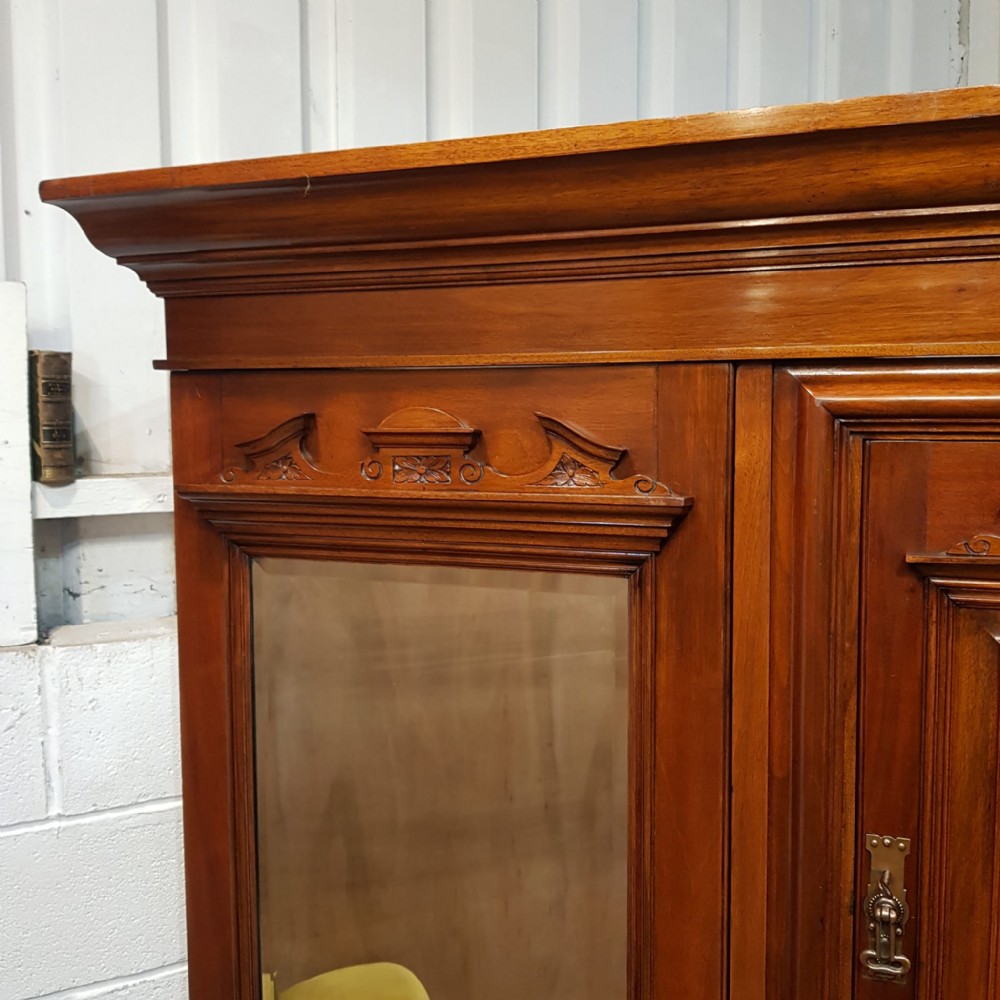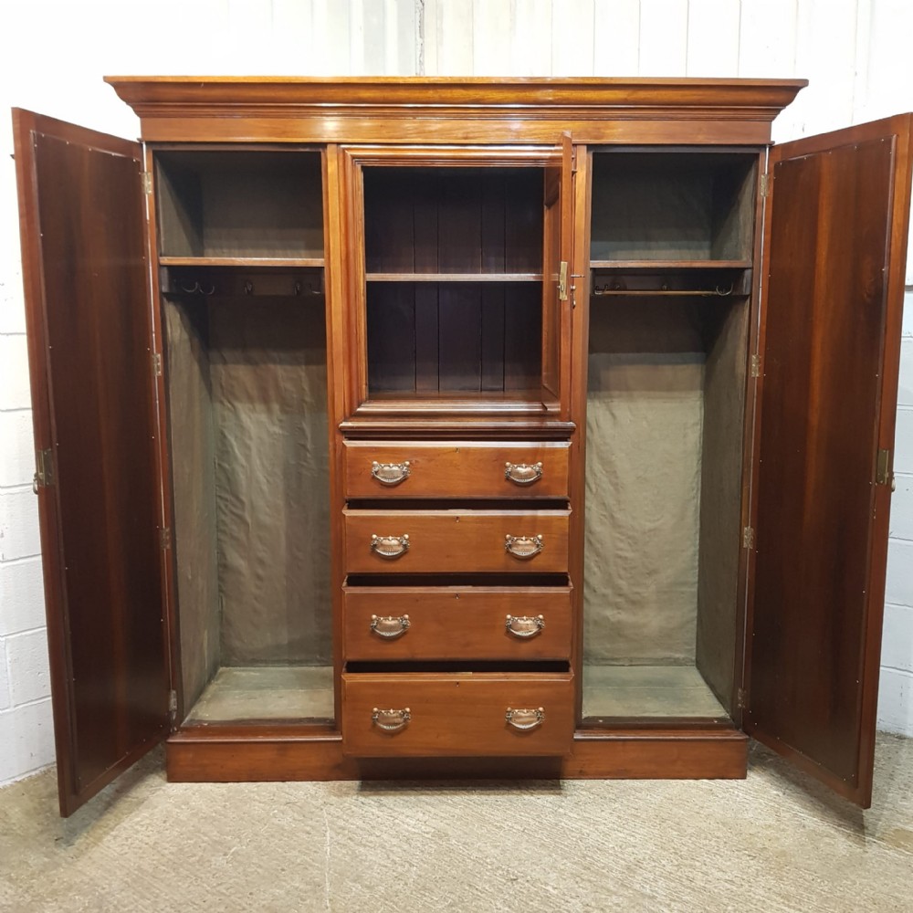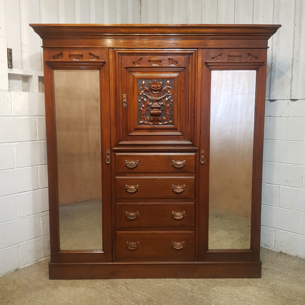An antique Edwardian Walnut triple wardrobe and dating from around 1900. This stunning wardrobe has a moulded cornice with a lip underneath. It has bevelled mirrored doors to both ends with original brass and copper handles. It features a carved pediment to the top of the mirrors. Inside both doors is a shelf with a rail underneath. To the centre of the wardrobe is a door with a carved panel and pediment to the top. It has original brass and copper handles and a shelf inside. Under the cupboard is four long graduating drawers all of which are Mahogany lined with original brass and copper handles. The wardrobe stands on a plinth base and separates into seven pieces for ease of movement.