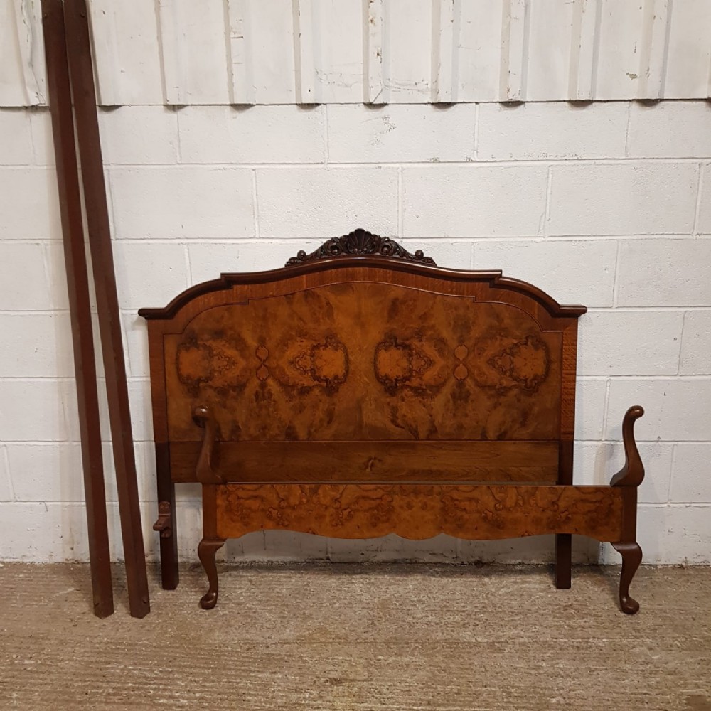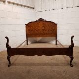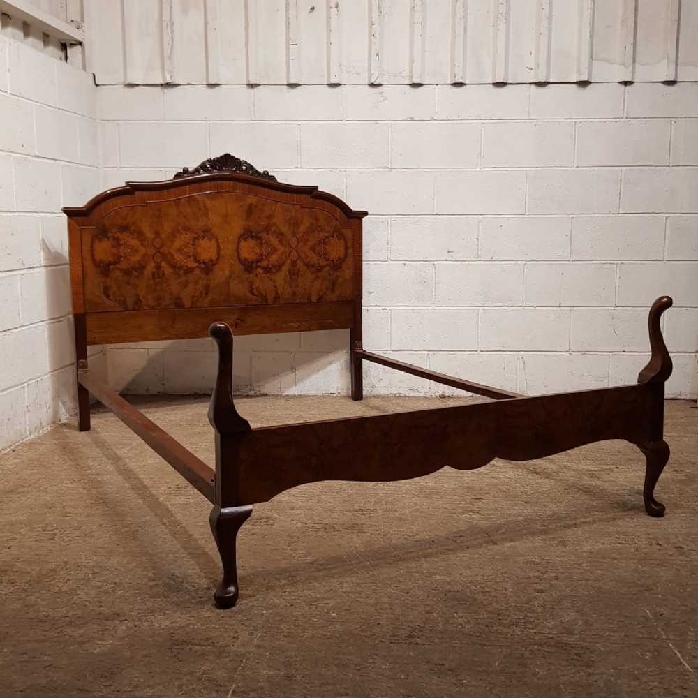An antique Burr Walnut double bed and dating from around 1920. This beautiful bed has a serpentine shaped moulded top rail with a carved cartouche above. It has a Burr Walnut panel underneath with a wide cross banded edge. The foot board has a low panel with a shaped frieze under with a cabriole shaped post to each end. It stands on cabriole legs on bun feet. It has its original Iron screw in side rails and takes a standard double mattress.
