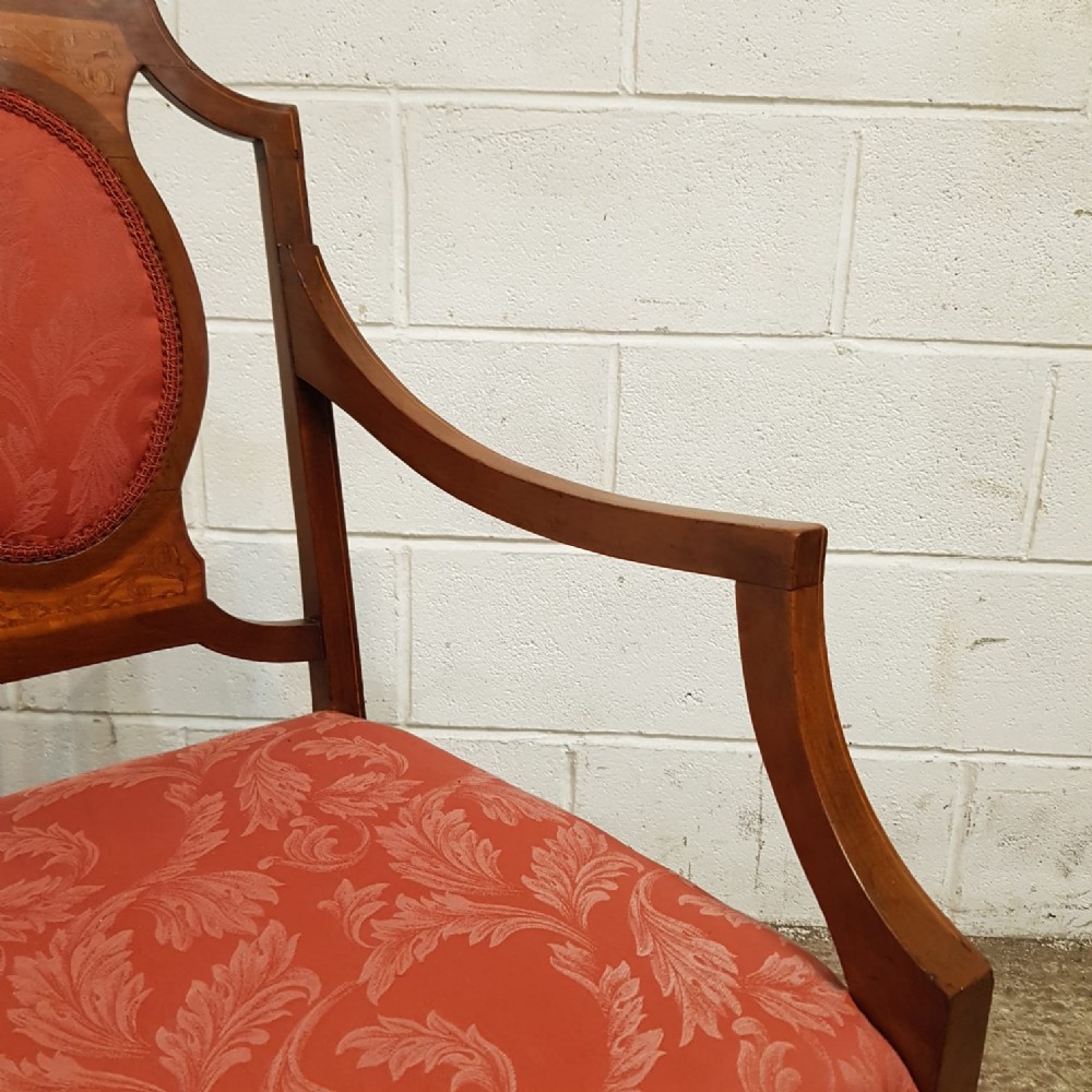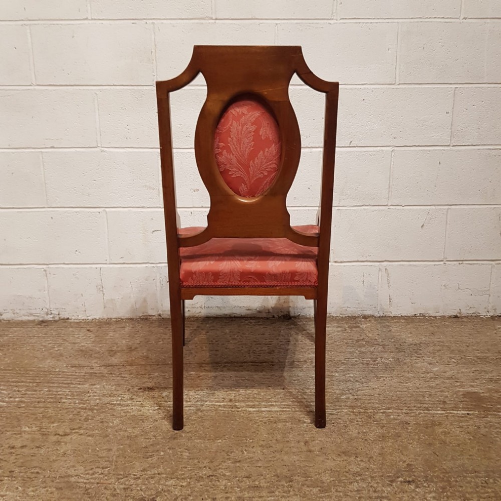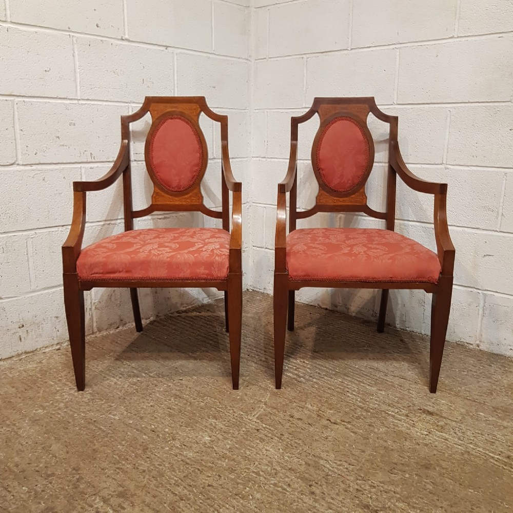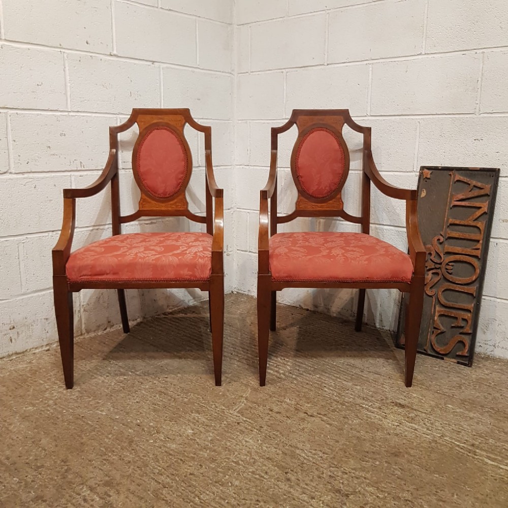 An antique pair of Walnut library chairs and dating from around 1920. These lovely pair of chairs have a shaped top rail with a padded central splat. They have shepherd crook arms and a stuffed padded seat. Under the seat is a rail to the front and the satin material is in very good condition. They stand on square tapered legs.