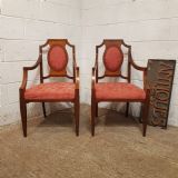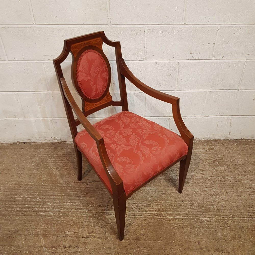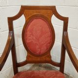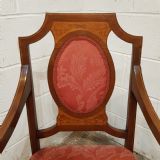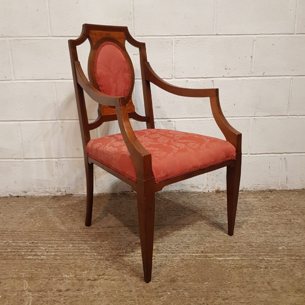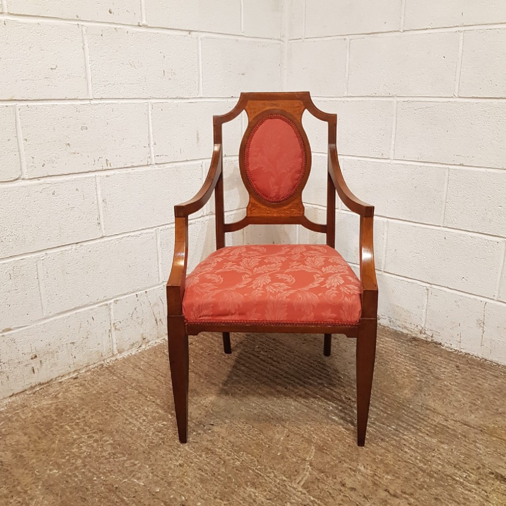 An antique pair of Walnut library chairs and dating from around 1920. These lovely pair of chairs have a shaped top rail with a padded central splat. They have shepherd crook arms and a stuffed padded seat. Under the seat is a rail to the front and the satin material is in very good condition. They stand on square tapered legs.