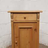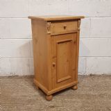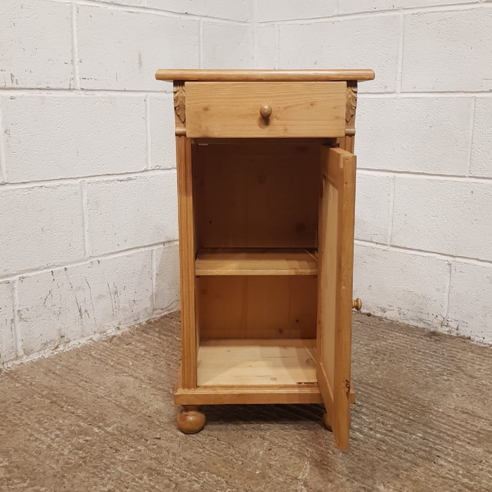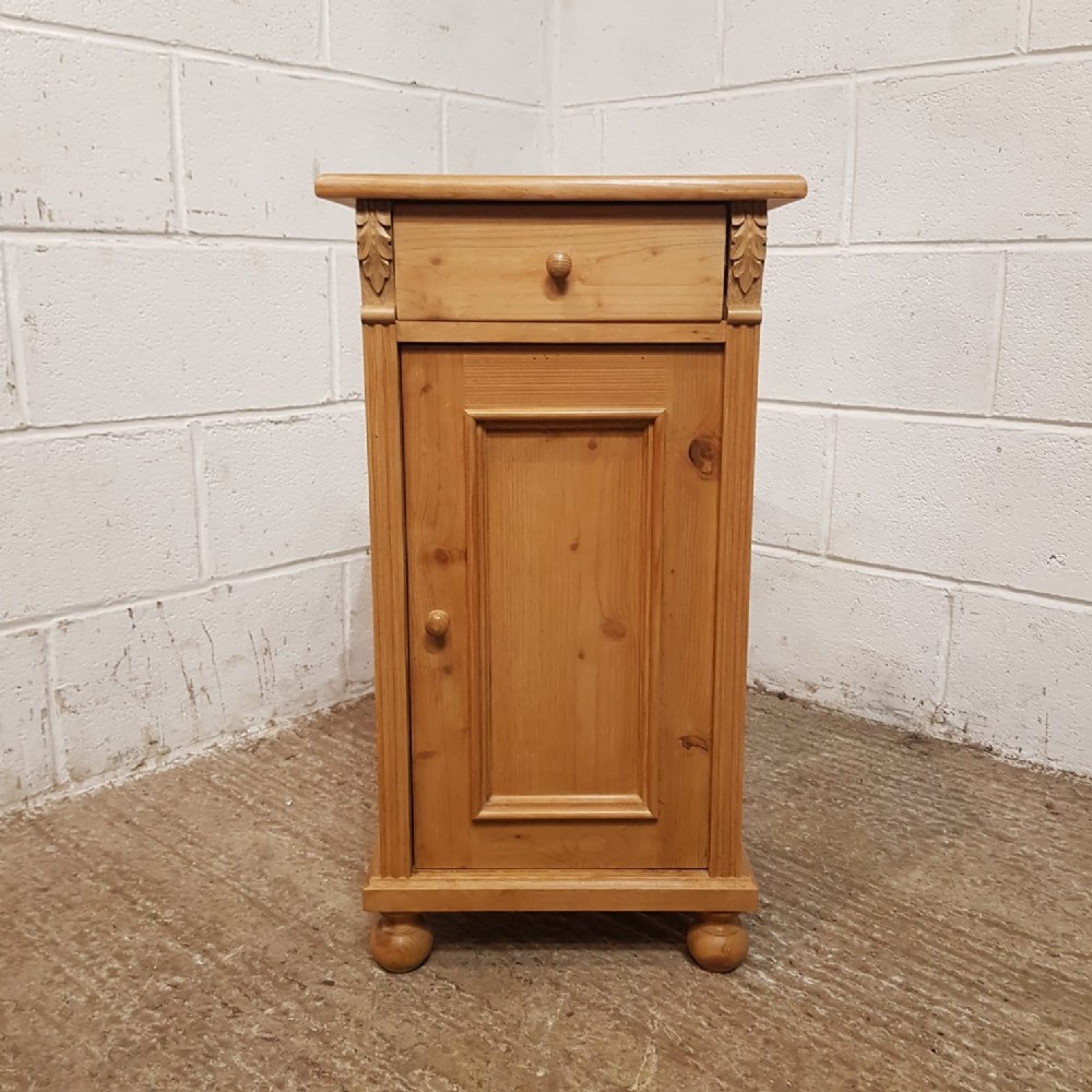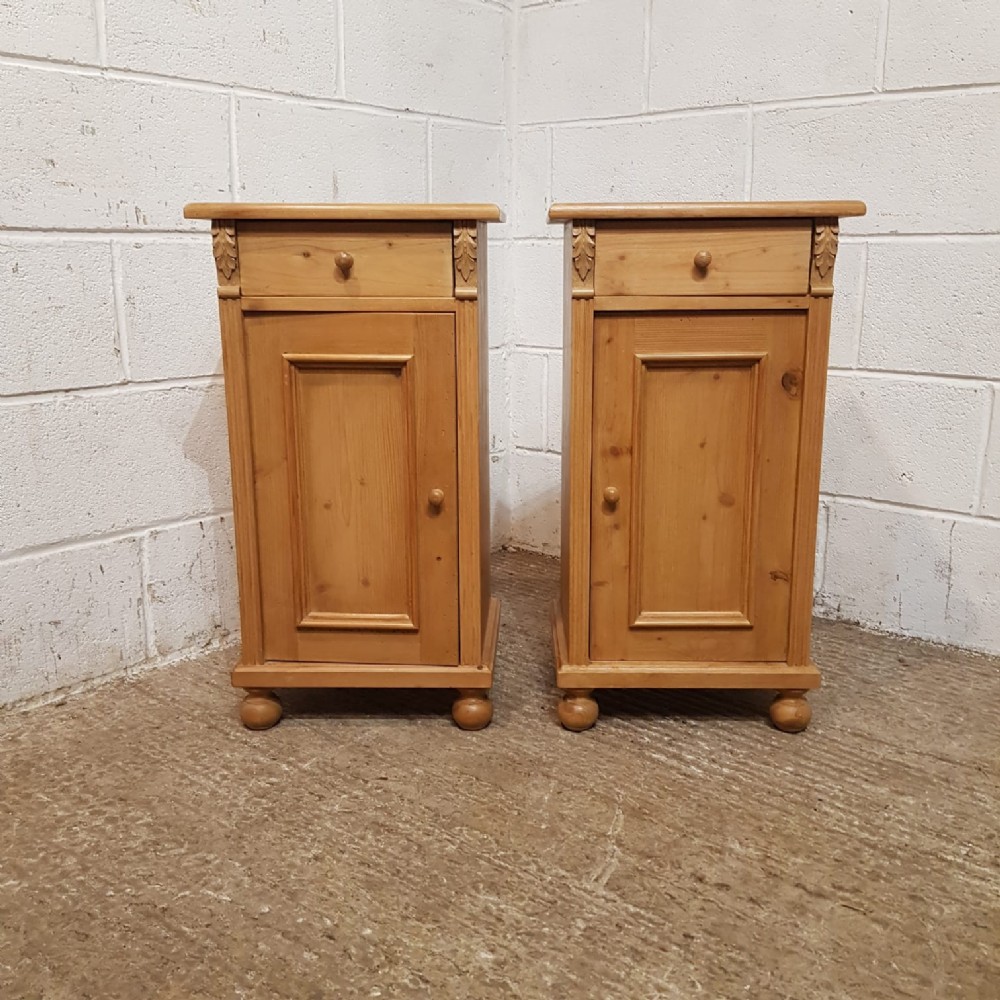 An antique pair of continental Pine bedside cabinets and dating from around 1910. This lovely pair of cabinets have a moulded edge to the top with a drawer underneath. The drawers have knob handles which there is a door under and this has a moulded panel in the centre, both again with knob handles and a shelf inside. To each side of the drawer is a small carved corbal. They are moulded around the bottom and stand on bun feet.