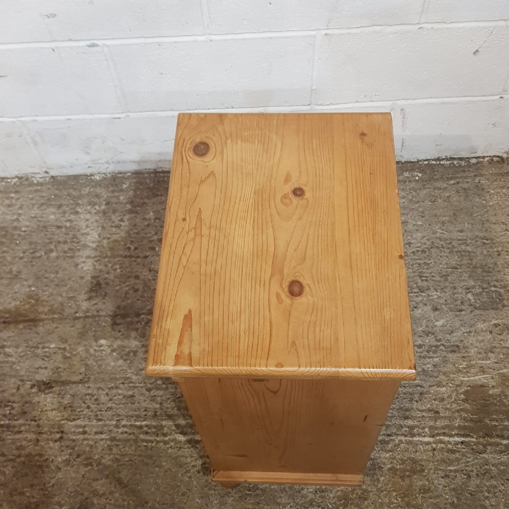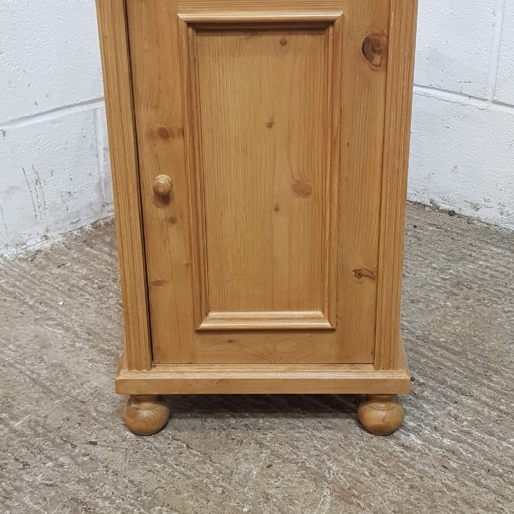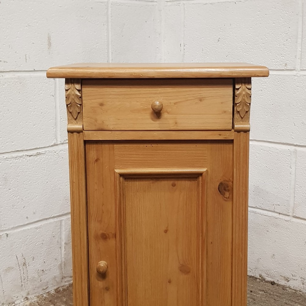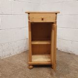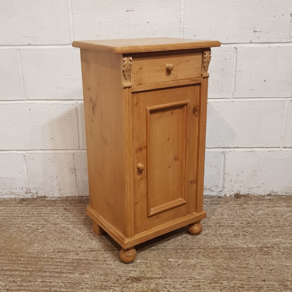An antique pair of continental Pine bedside cabinets and dating from around 1910. This lovely pair of cabinets have a moulded edge to the top with a drawer underneath. The drawers have knob handles which there is a door under and this has a moulded panel in the centre, both again with knob handles and a shelf inside. To each side of the drawer is a small carved corbal. They are moulded around the bottom and stand on bun feet.