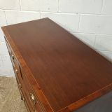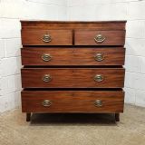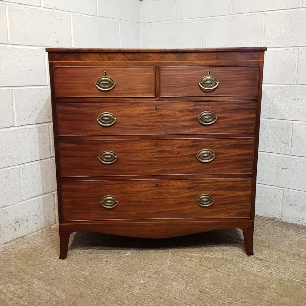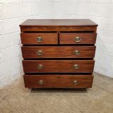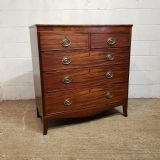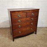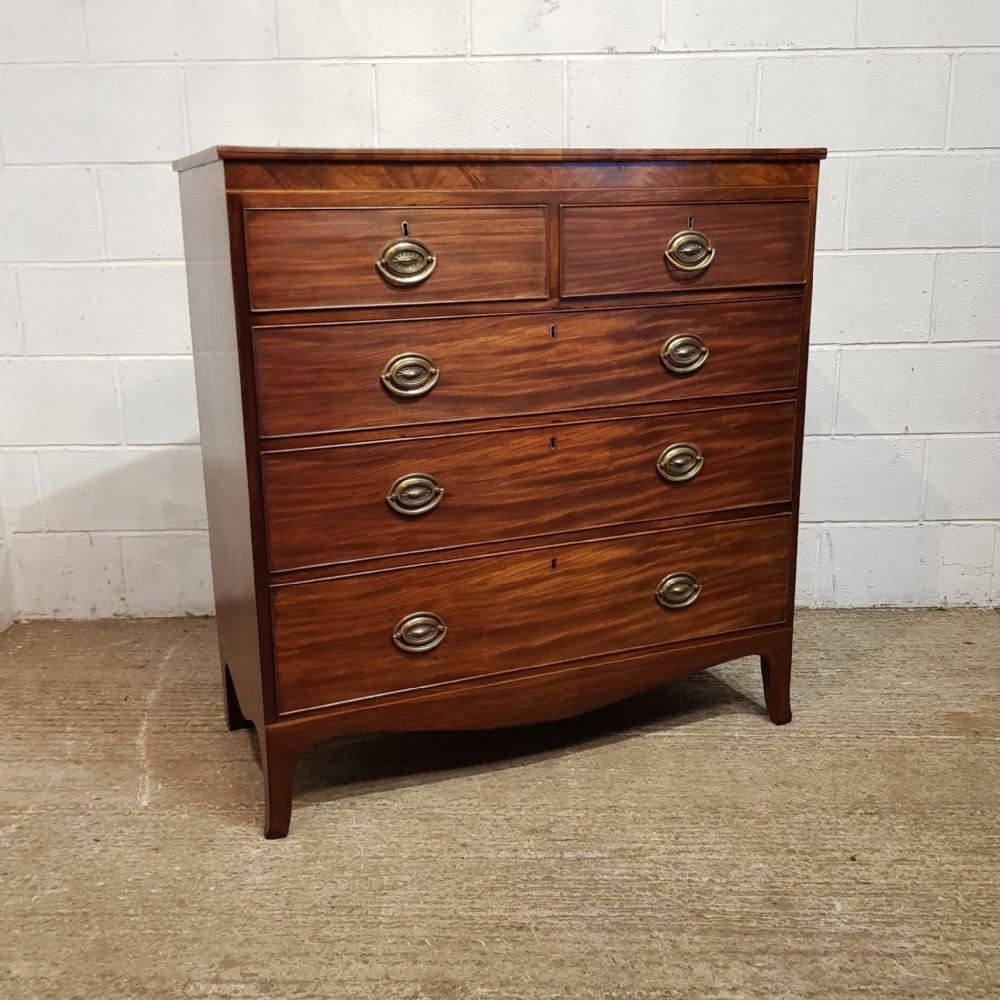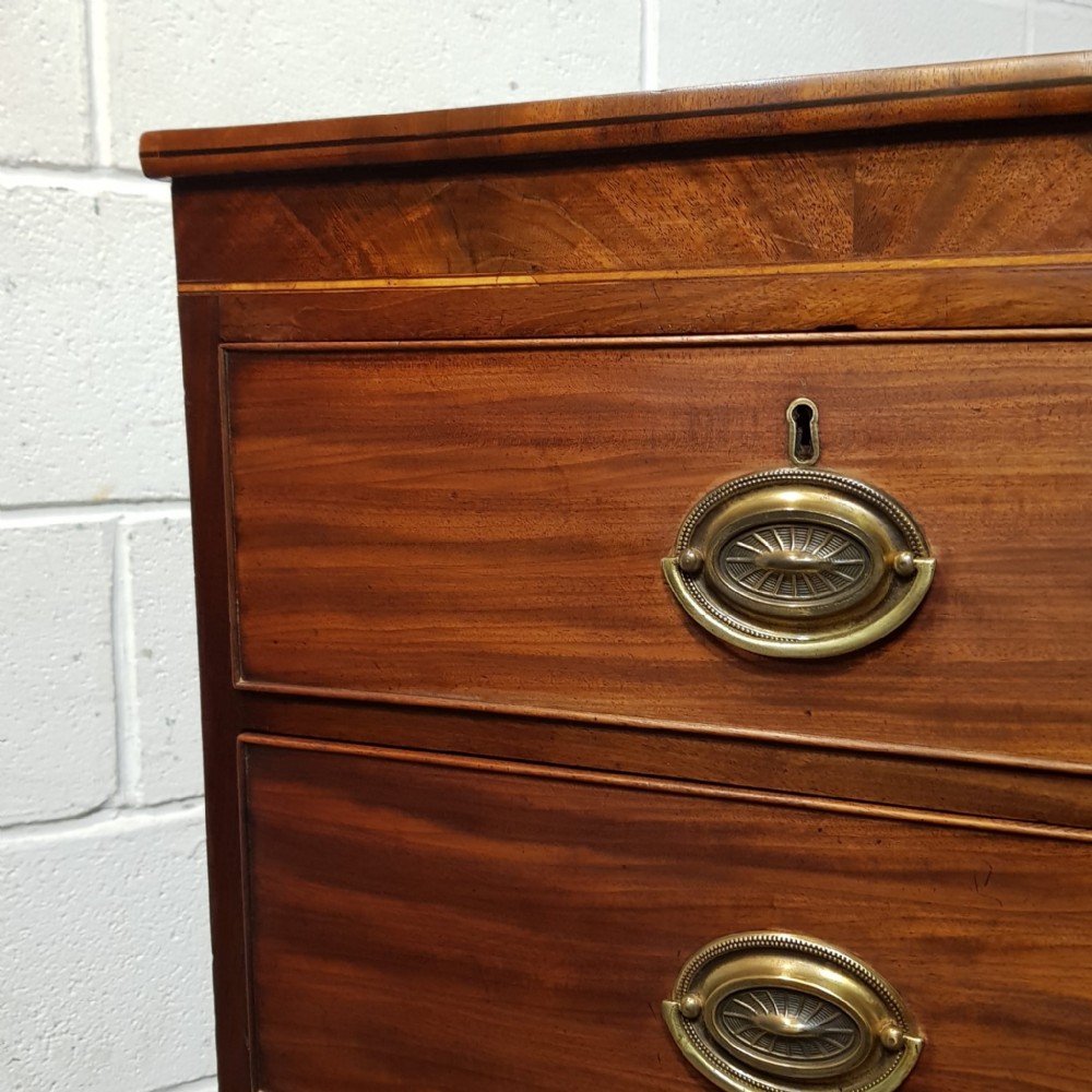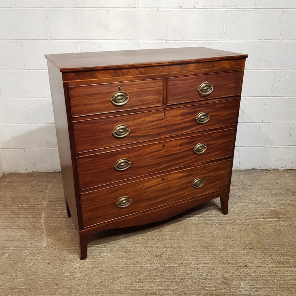 A George 3rd Mahogany chest of drawers and dating from around 1800. This stunning chest of drawers has a satinwood strung and cross banded edge to the top with a satinwood and cross banded lip underneath. It has two short drawers over three long graduating drawers all of which are pine lined with oval brass handles. It stands on bracket feet with a shaped frieze in between.