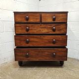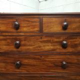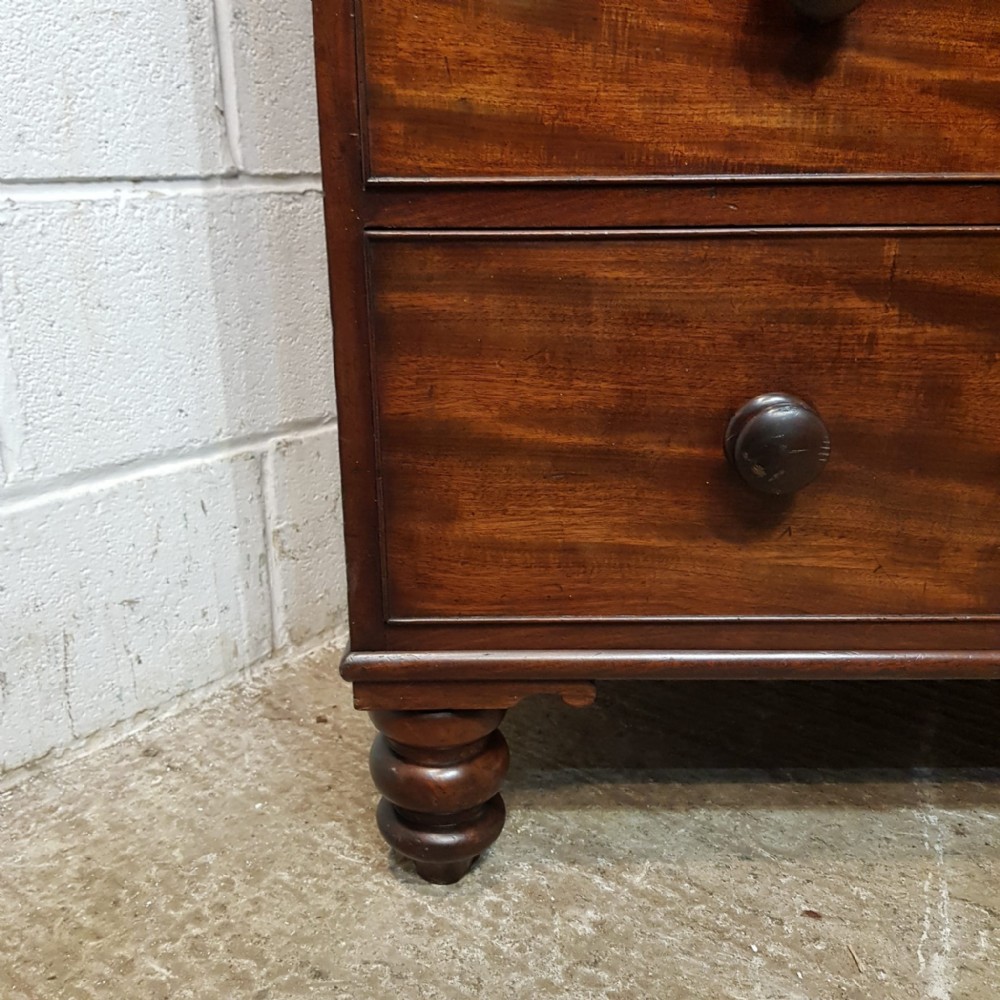 A Victorian Mahogany 4 height chest of drawers and dating from around 1880. This chest of drawers has a moulded edge to the top, with two short drawers over three long graduating drawers all of which are Oak lined with original knob handles. It is moulded around the bottom and stands on turned bun feet.