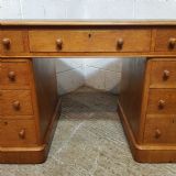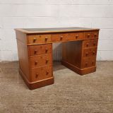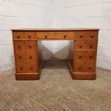 A Victorian golden Oak twin pedestal writing desk and dating from around 1880. This writing desk has an embossed leather writing surface and moulded edge to the top. It has a long drawer above the knee hole with a drawer to each side. Each pedestal has three graduating drawers, all of which are mahogany lined. The pedestals have a plinth base on castors and the top lifts of for ease of movement,