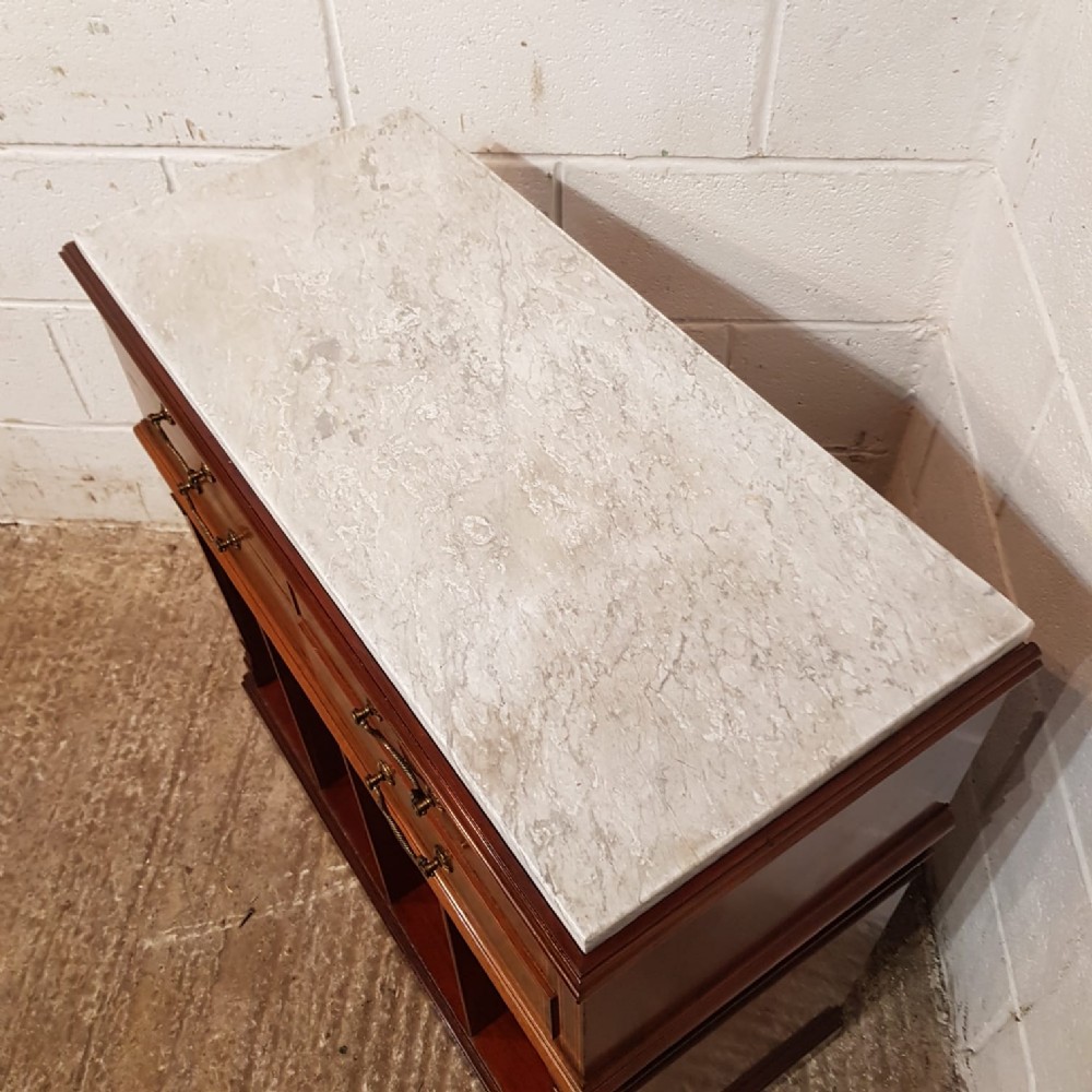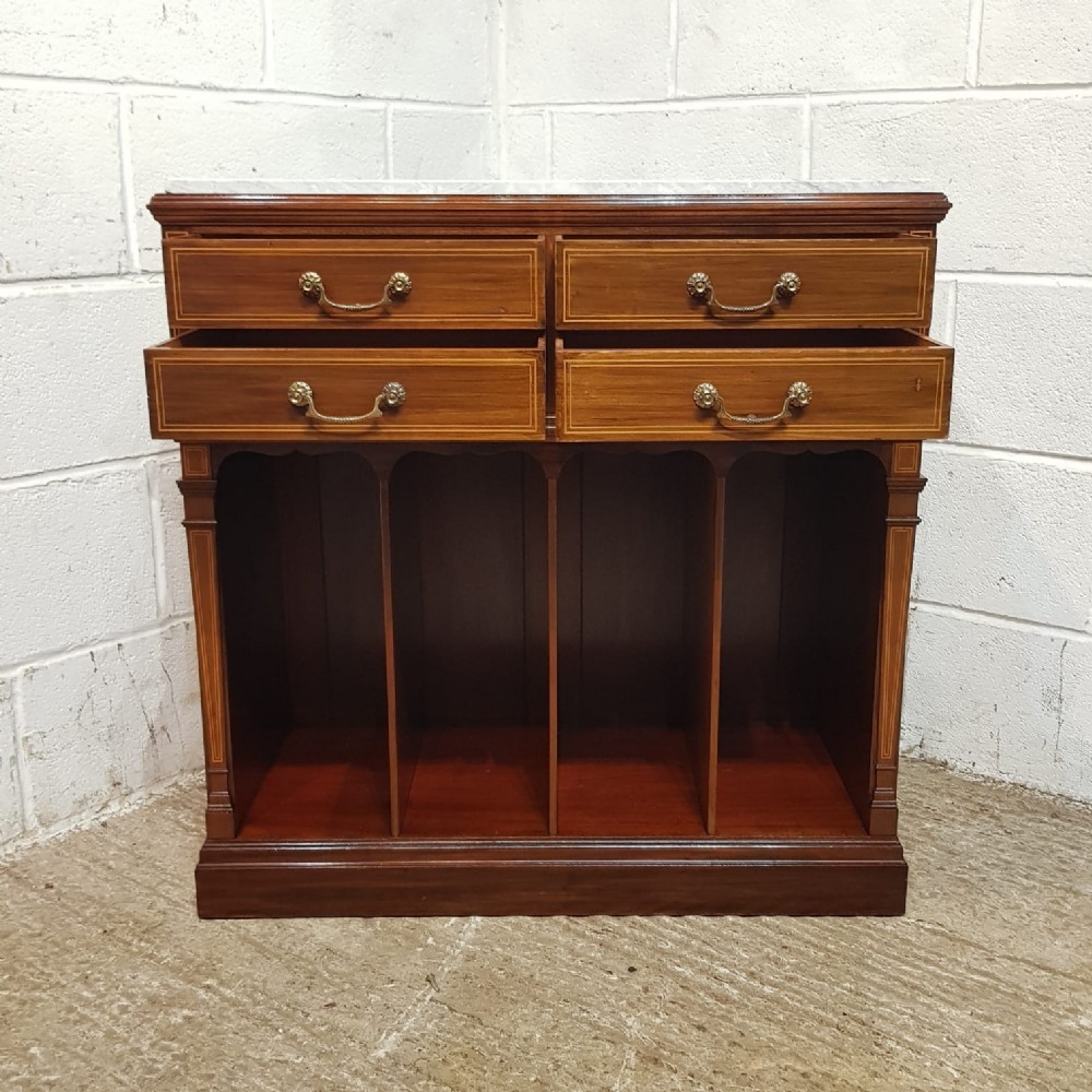 An Edwardian Mahogany side cabinet by Collinson and Lock of London and dating from around 1900. This beautiful side cabinet has an inset marble top and moulded edge to the top. It has two small drawers above a further two small drawers all of which are mahogany lined with original brass handles and satinwood strung drawer fronts. It is moulded underneath the drawers and then four open compartments. Down the side of the front is a tapered strung column. Its moulded around the bottom and stands on a plinth base.
