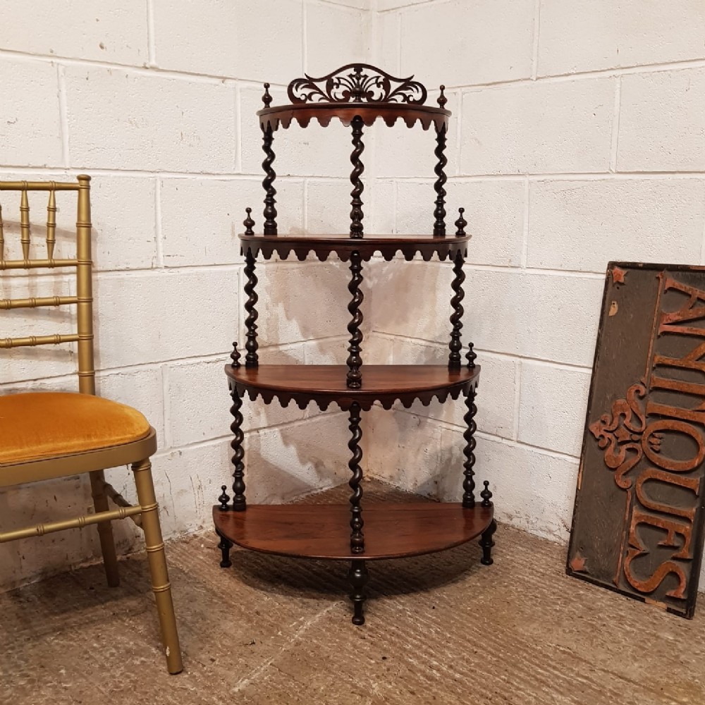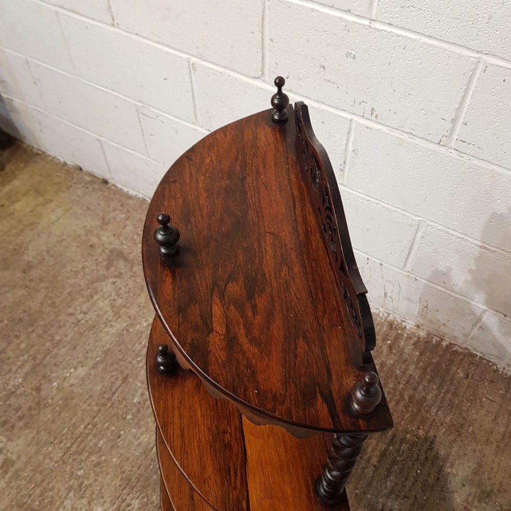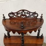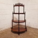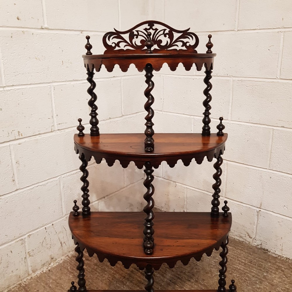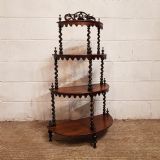 A Victorian Rosewood Demi Lune shaped Wot Not and dating from around 1880. This lovely Rosewood Wot Not has four graduating shelves on turned supports with finials above. There is a shaped frieze under each shelf, the top shelf has a carved and pierced raised back and it stands on turned feet.