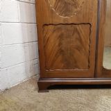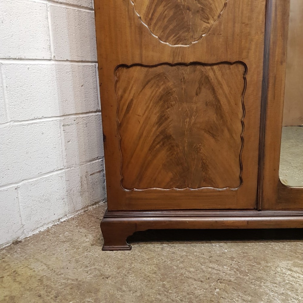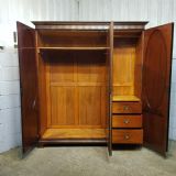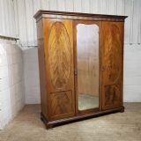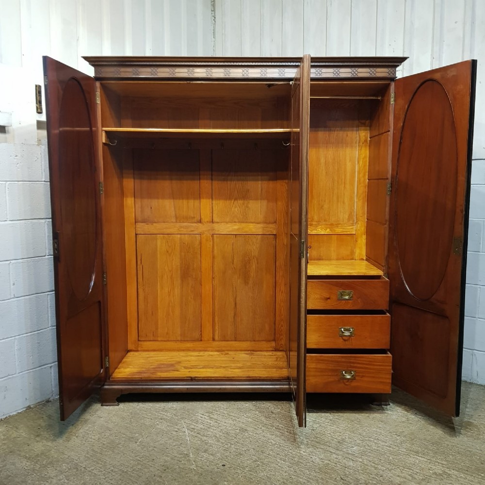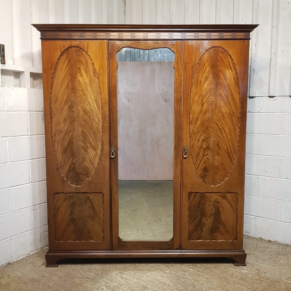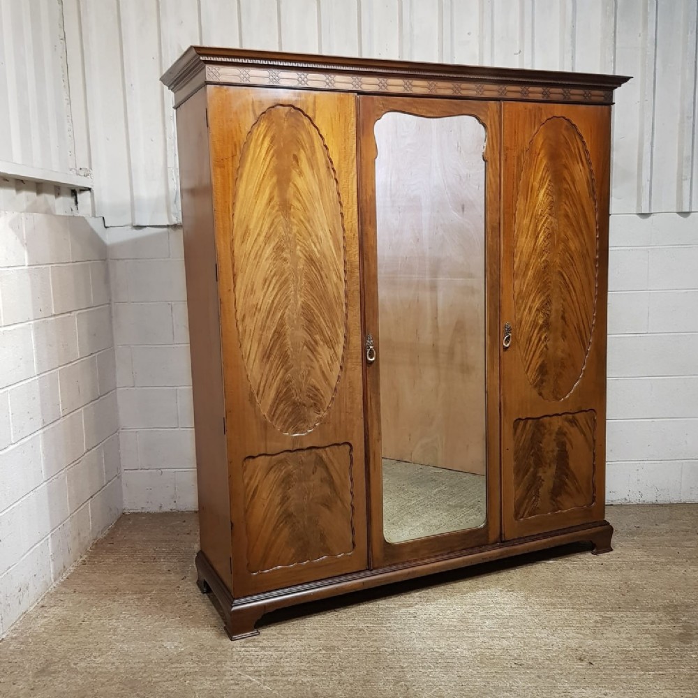 An Edwardian Mahogany triple wardrobe and dating from around 1900. This wardrobe has a moulded cornice with Greek key moulding, with a wide fret carved lip underneath. It features a central mirrored door. The doors to both ends have a large moulded oval panel over a square moulded panel and both have original brass handles with key. Inside on the left and centre is a shelf with a rail underneath. On the right is a rail with three drawers to the bottom. It stands on a plinth on bracket feet. The wardrobe dismantles into six pieces for ease of movement.