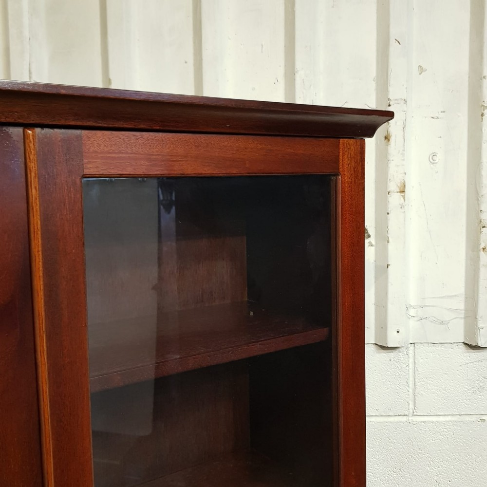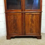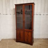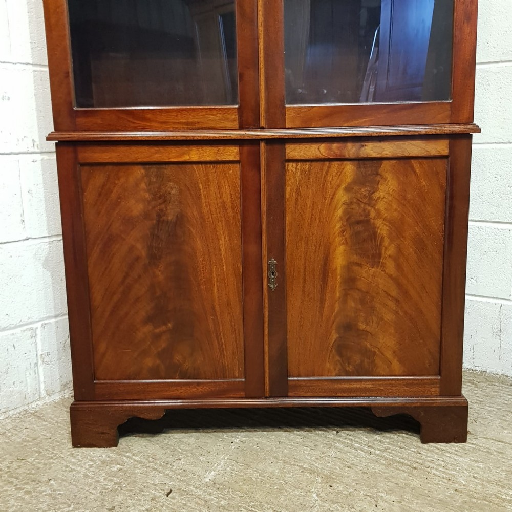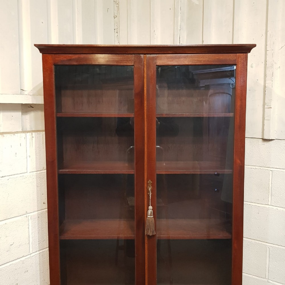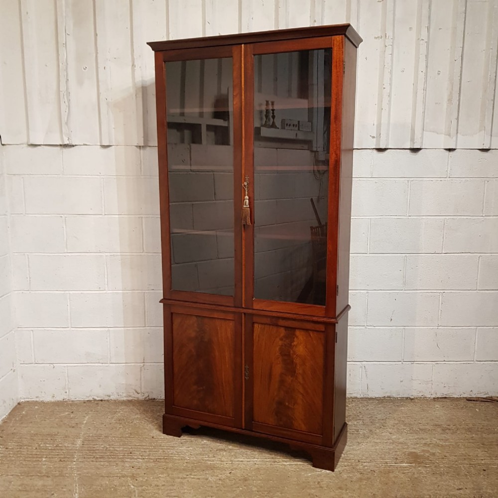 An antique tall glazed Mahogany bookcase and dating from around 1900. This bookcase has a moulded cornice with two glazed doors with brass escutcheons and key. Inside are three fixed shelves. The base has two doors both with a moulded panel and brass escutcheons and a shelf inside. It is moulded around the bottom and stands on bracket feet.