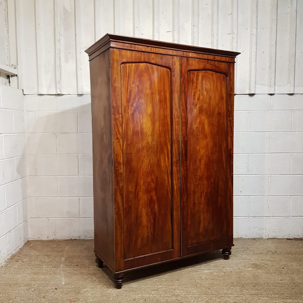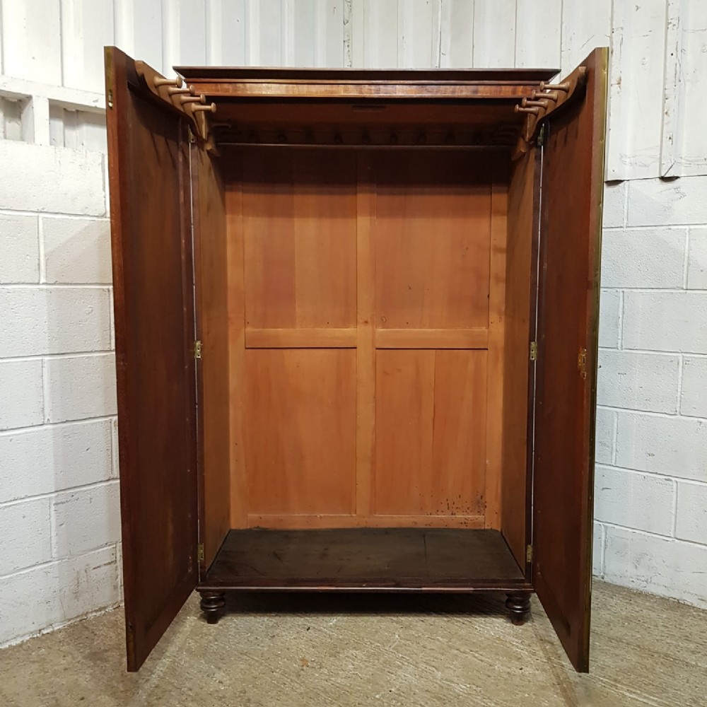 A Regency Mahogany double wardrobe and dating from around 1810. This original piece has a moulded cornice with a lip underneath. Two large doors to the front and each has a long arched top, moulded panel and original brass handles and door divider with a key. Inside is a brass rail and original wooden hanging pegs inside. It is moulded around the bottom and stands on turned feet.