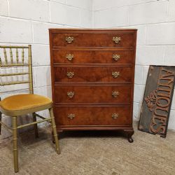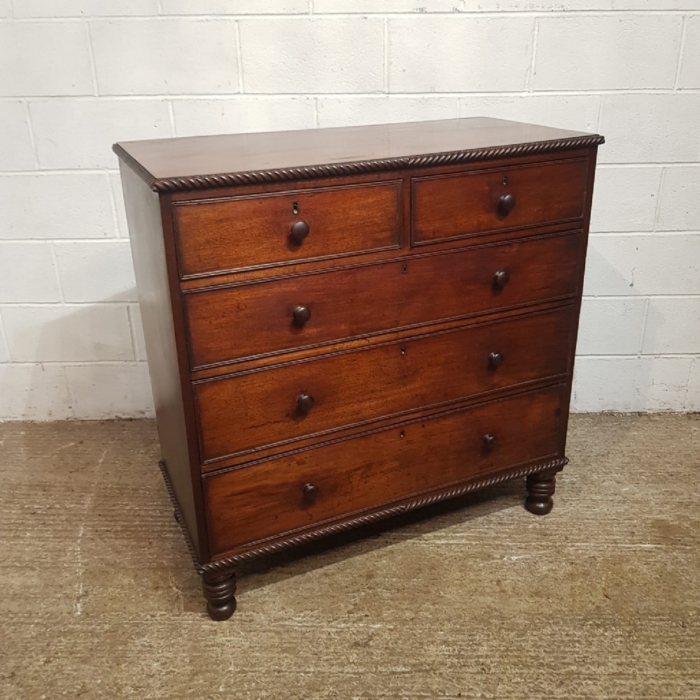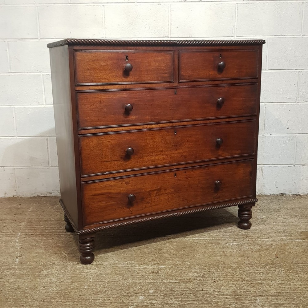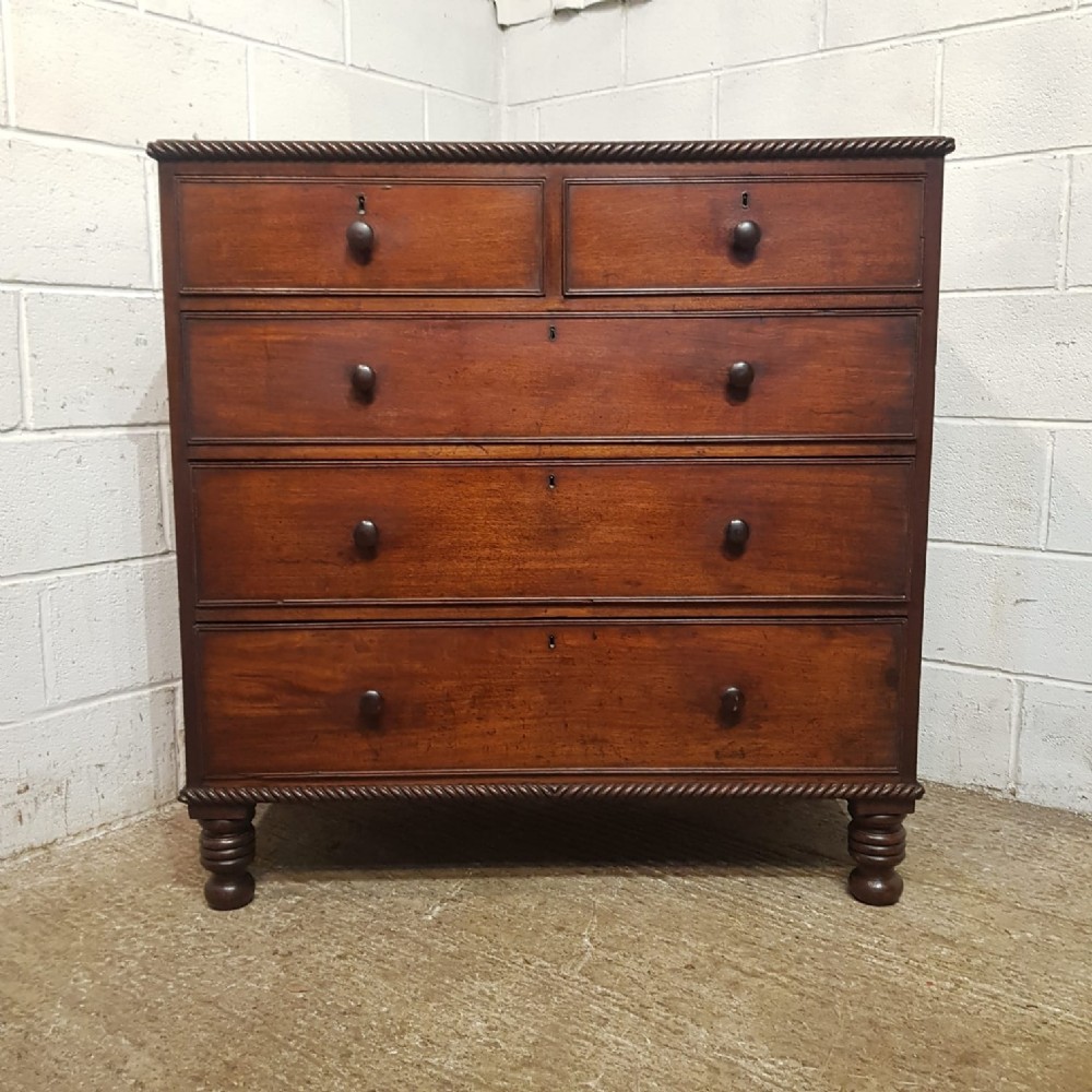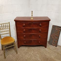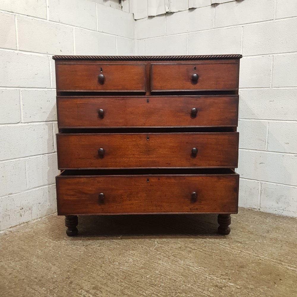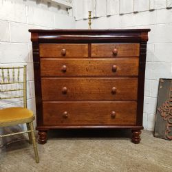 A Victorian Mahogany 4 height chest of drawers and dating from around 1880. This original Victorian chest of drawers has a carved edge to the top, with two short drawers over three long graduating drawers, all of which are Oak lined with original knob handles. It is carved around the bottom and stands on ring turned legs.