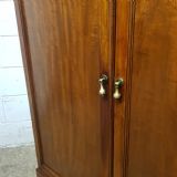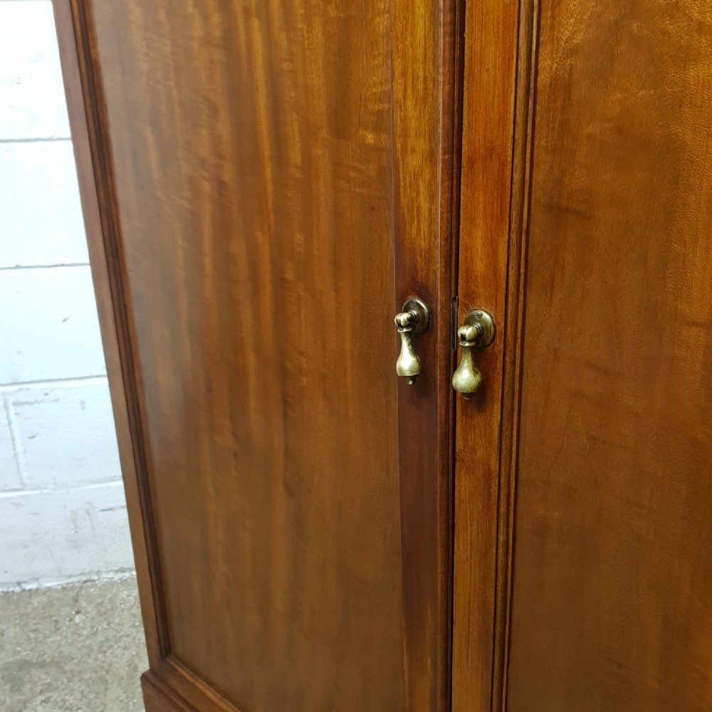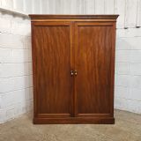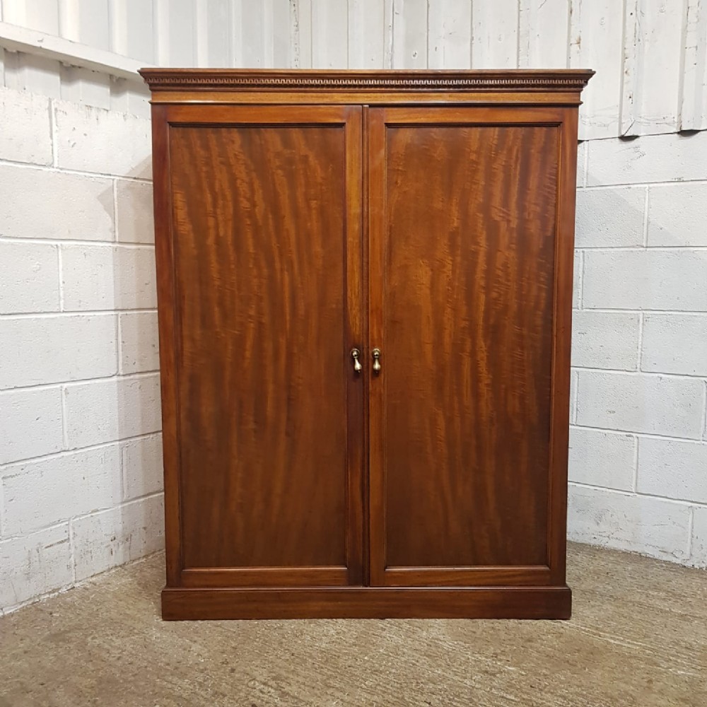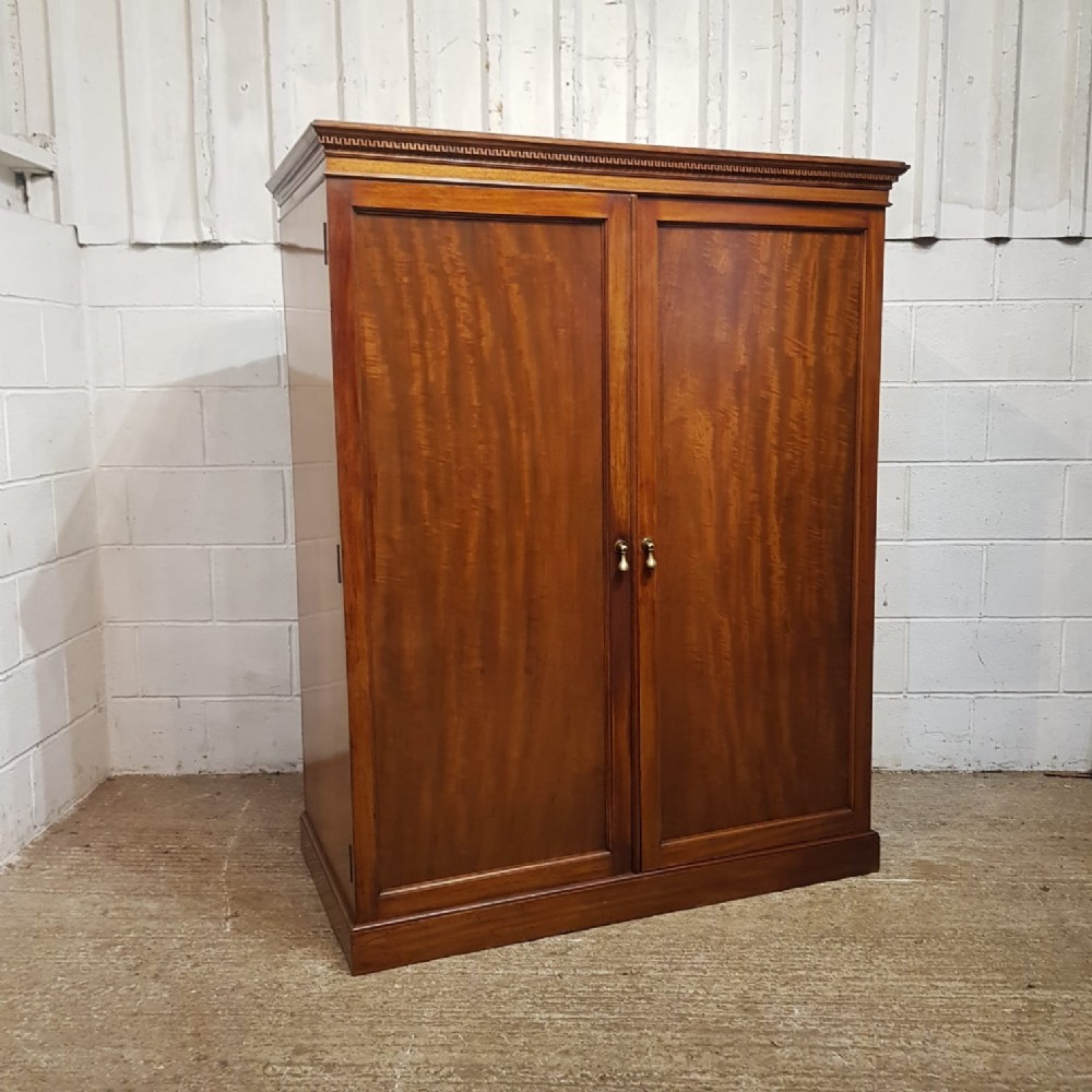A Regency Mahogany three quarter height double wardrobe and dating from around 1810. This original wardrobe has a moulded cornice with dental moulding and a lip underneath. It has two doors to the front and each door has a long moulded panel with Brass handles. Inside is a Brass hanging rail to each side of a central divide. It has an unusually deep internal depth. It is moulded around the bottom and stands on a plinth base.