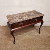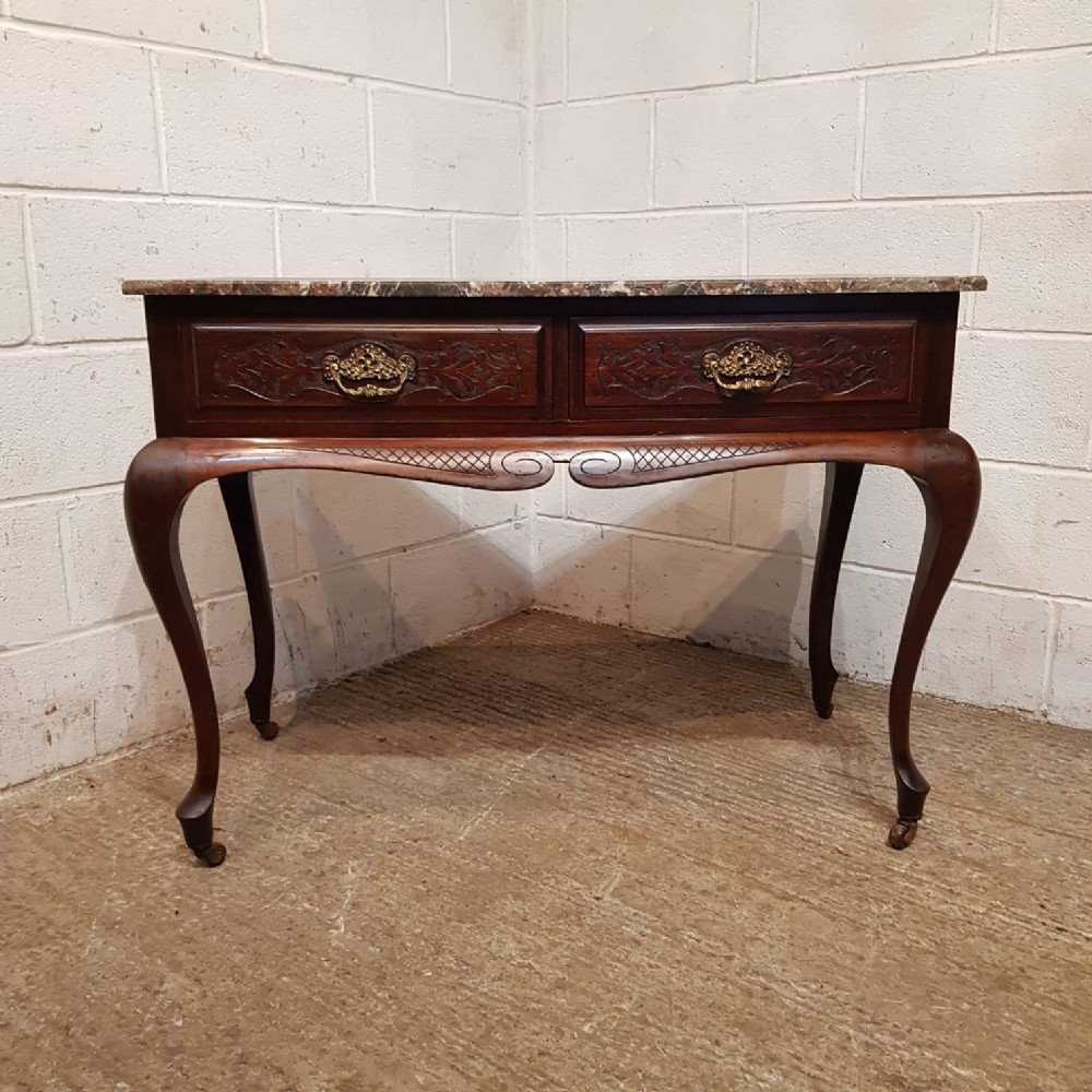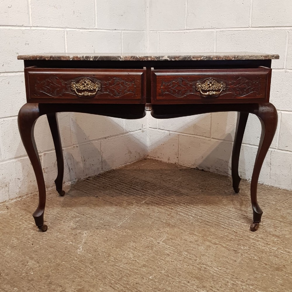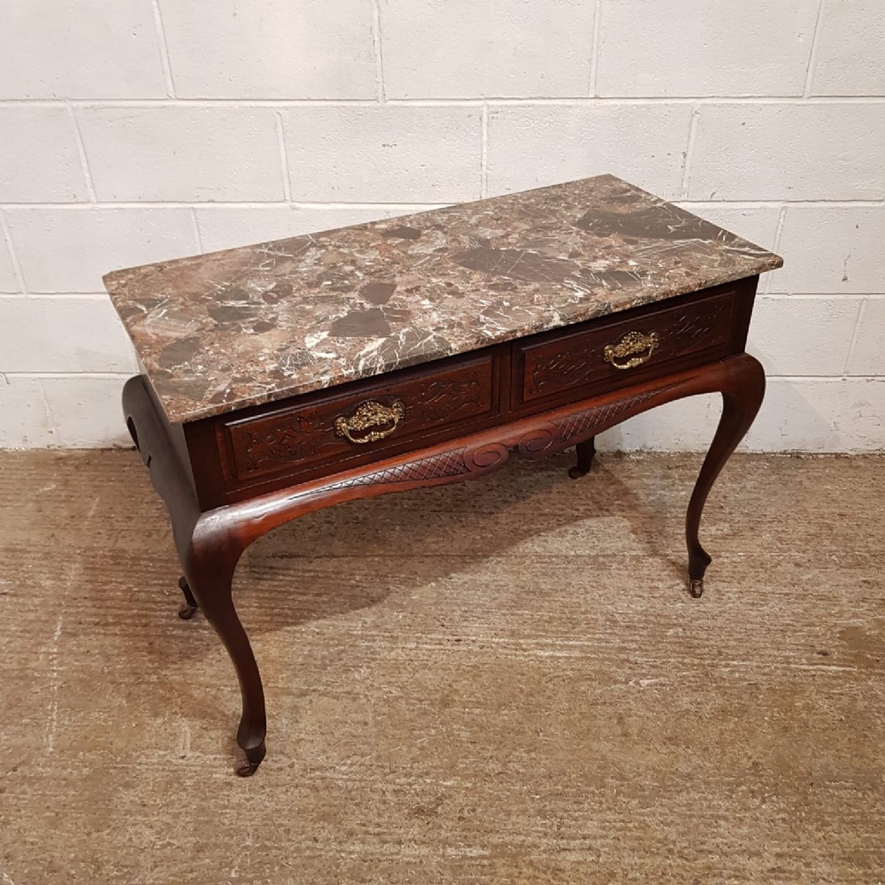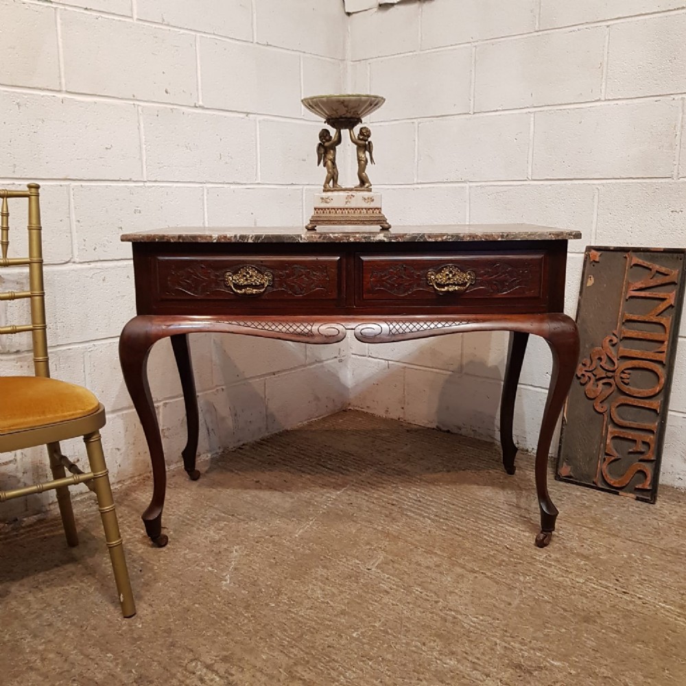 An Art Noveau Marble topped console table and dating from around 1890. The marble is in very good condition for the age and it has two drawer to the front, both of which are Mahogany lined with Gilt metal handles and carved drawer fronts, with a carved frieze underneath the drawers. It stands on long cabriole legs on castors.