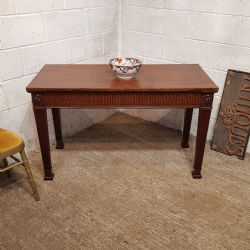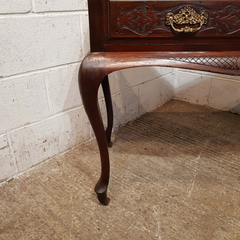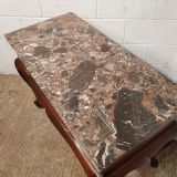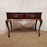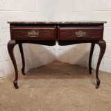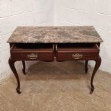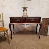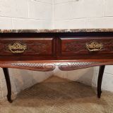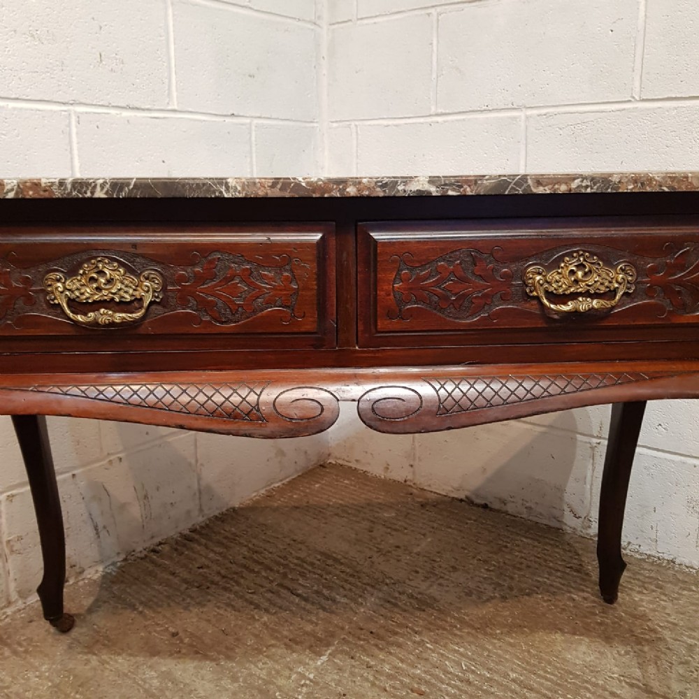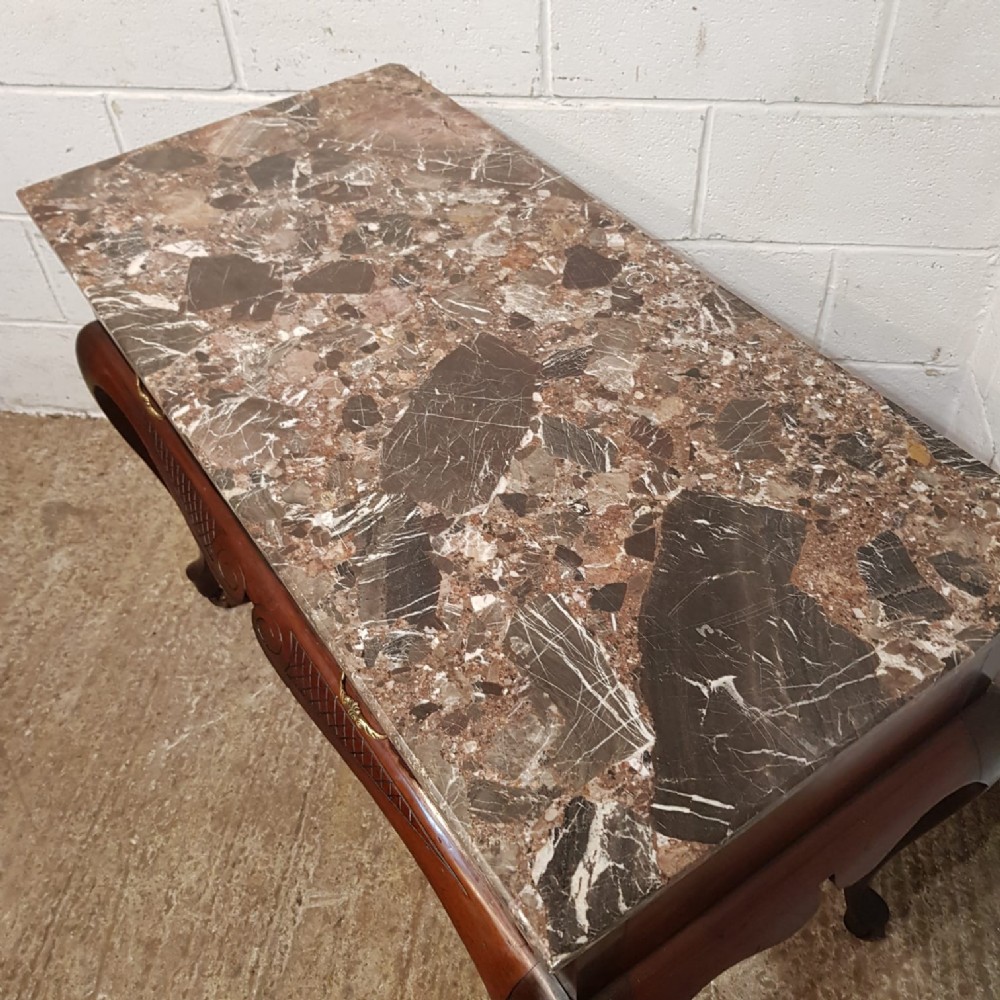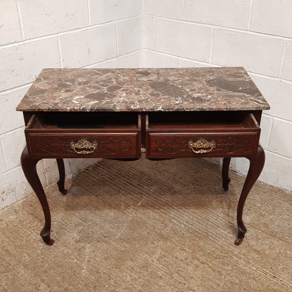 An Art Noveau Marble topped console table and dating from around 1890. The marble is in very good condition for the age and it has two drawer to the front, both of which are Mahogany lined with Gilt metal handles and carved drawer fronts, with a carved frieze underneath the drawers. It stands on long cabriole legs on castors.