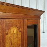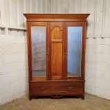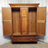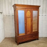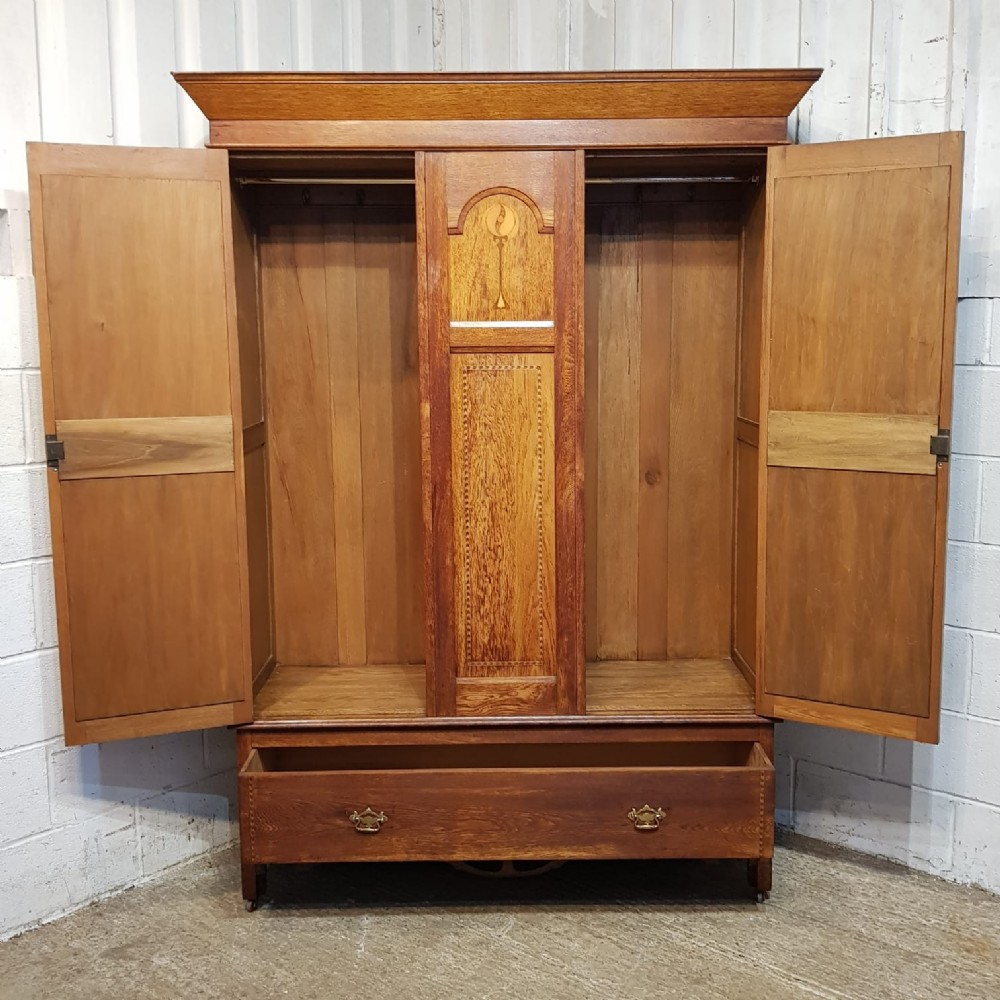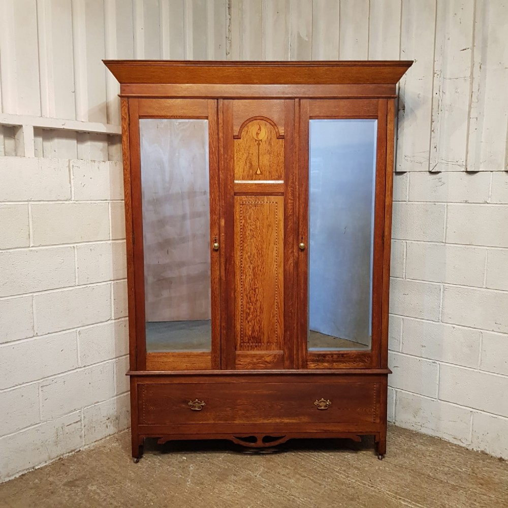 An Antique Oak double wardrobe and dating from around 1910. This double wardrobe has a flared cornice with a wide lip underneath. It features a mirrored door to each side both with a brass handle. Between the doors is a central panel, with a small arched top inlaid panel which sits above a rectangular strung panel. There is a hanging rail inside which goes behind the panel. The base has a long deep drawer which is Oak lined with Brass handles and a strung edge to the drawer front. It stands on square legs on castors.