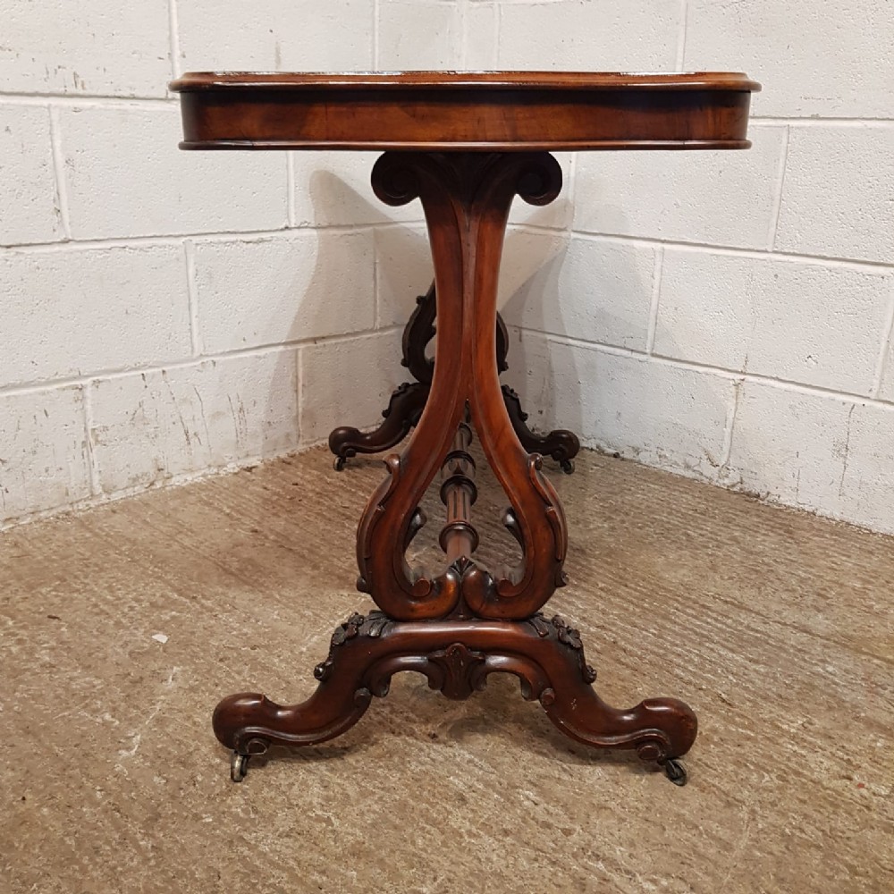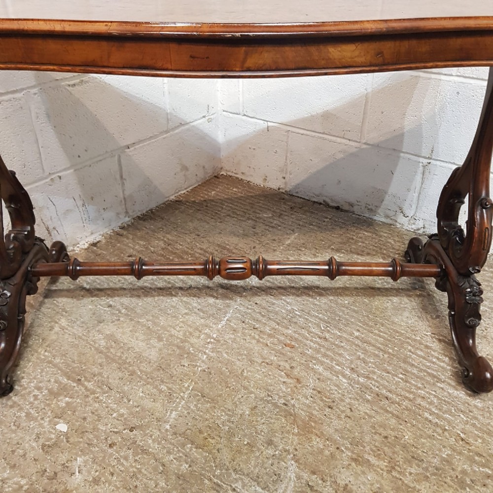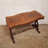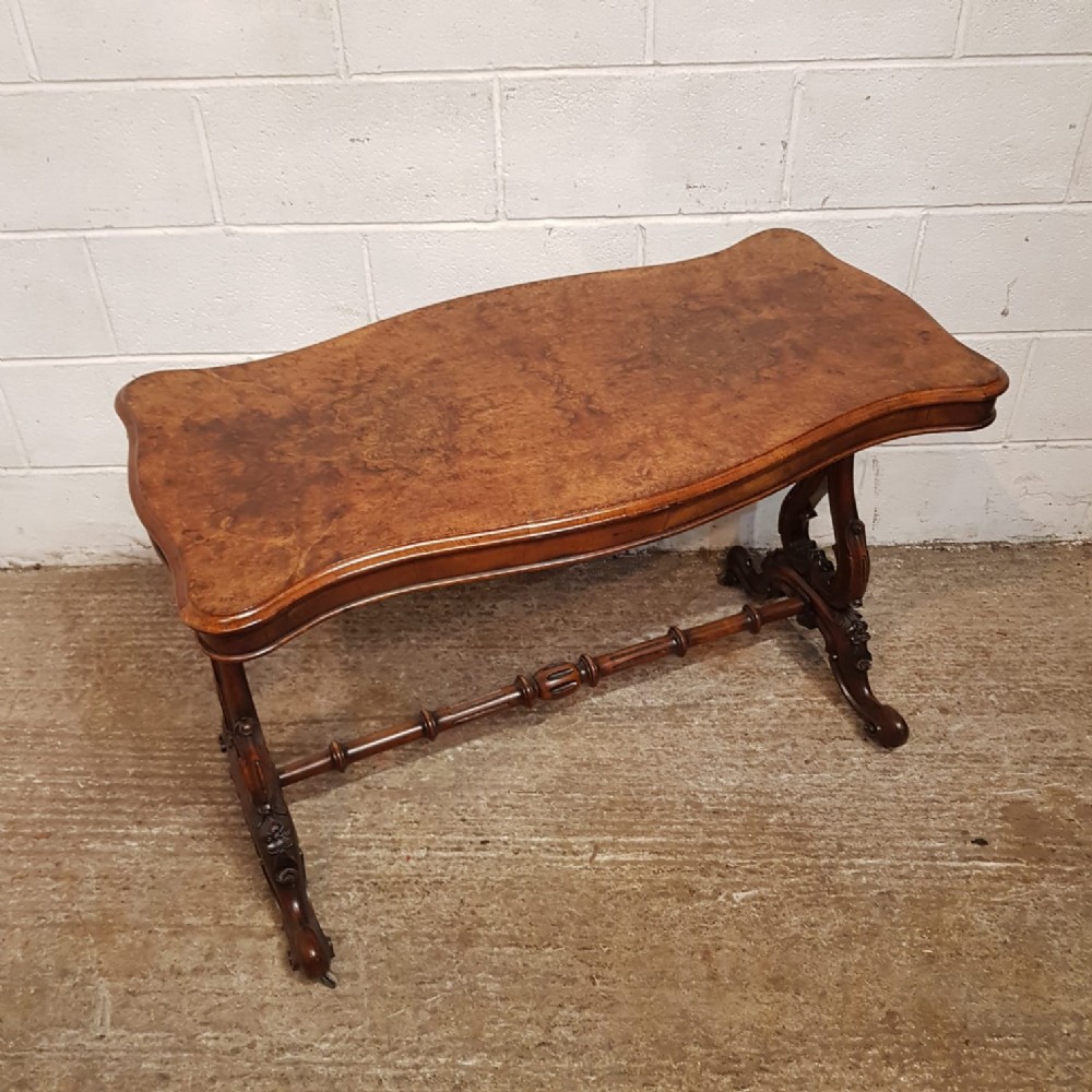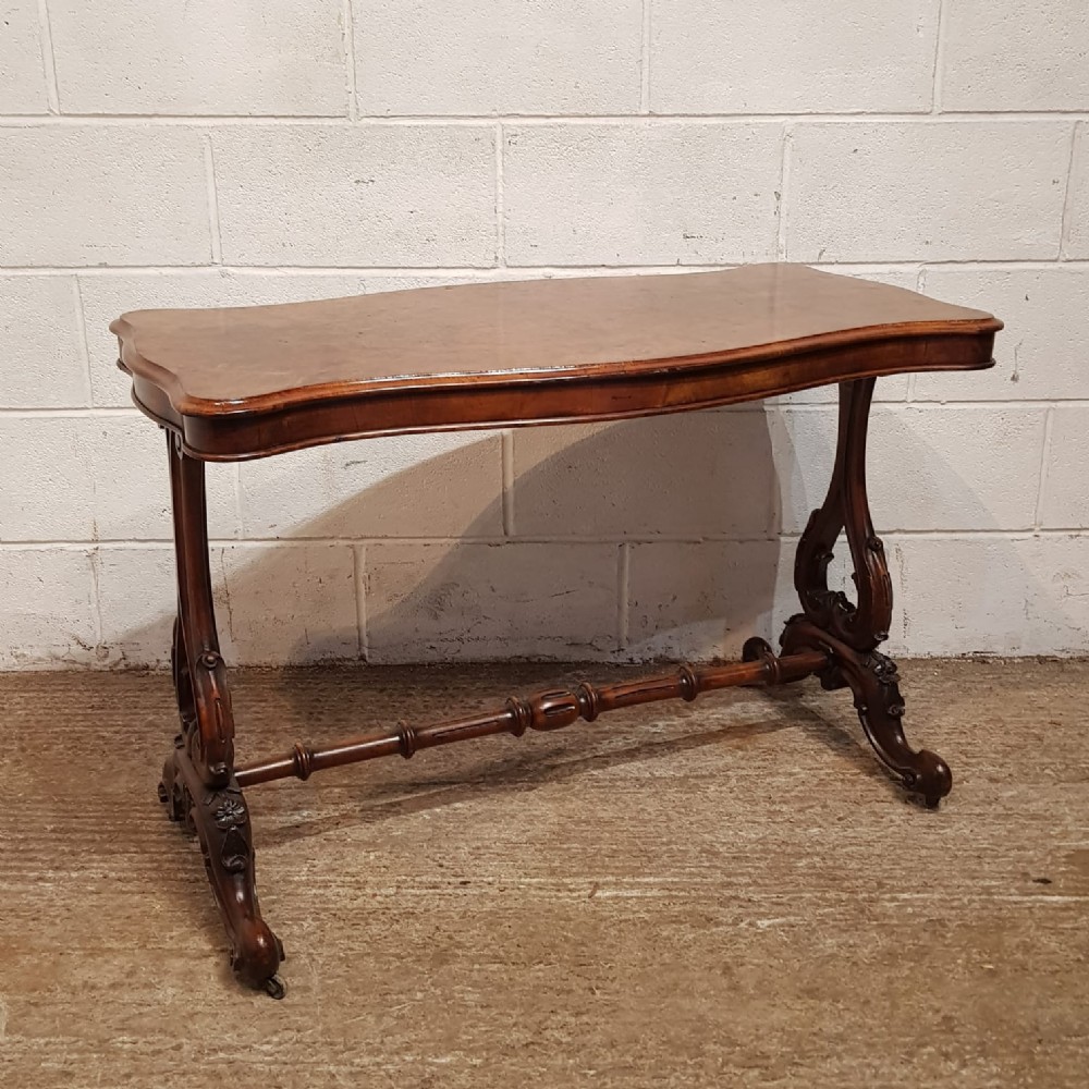 A Victorian Walnut and Burr Walnut side table and dating from around 1880. This original and beautiful side table has a shaped Burr Walnut top with a moulded edge and a Burr Walnut lip underneath with a moulded lip under this. It has a moulded carved and pierced support to each end on carved feet and castors with a turned stretcher between.