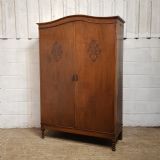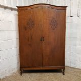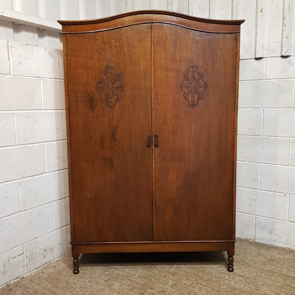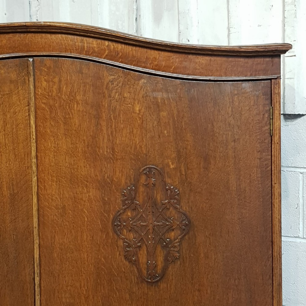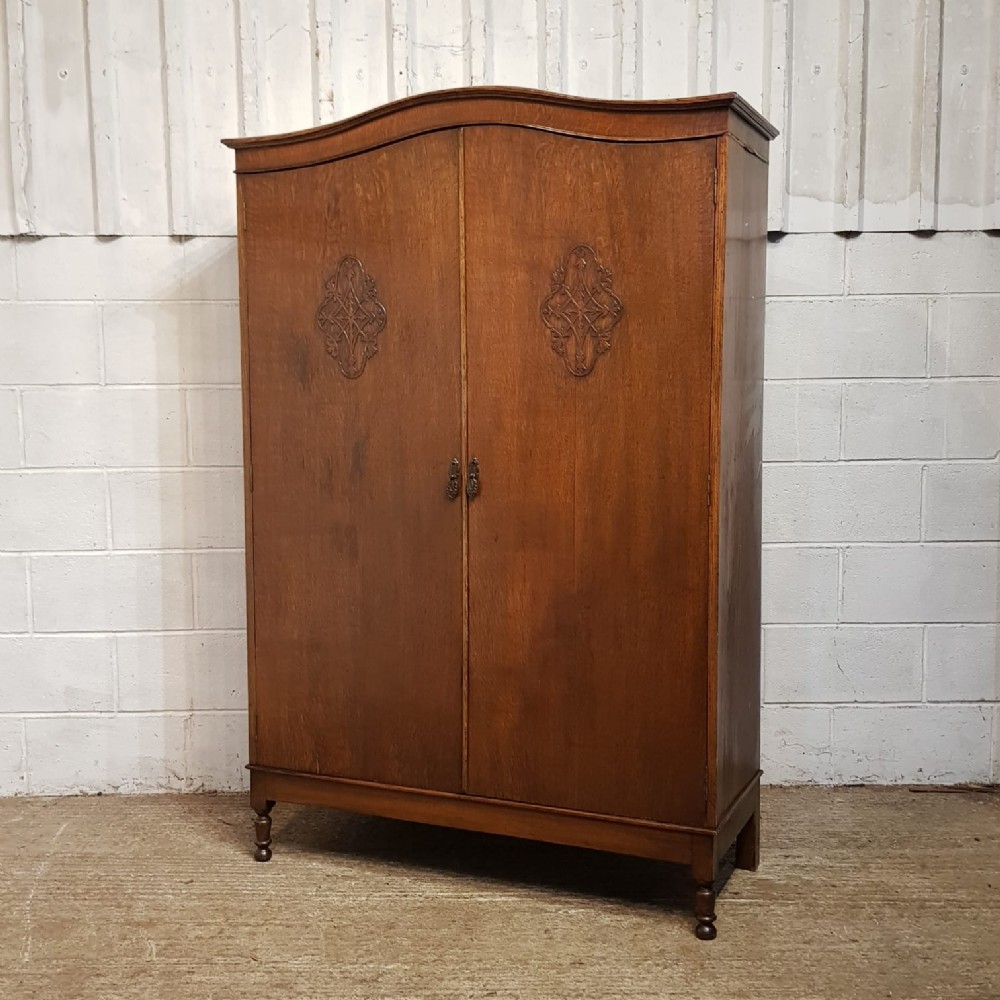 An antique Oak double wardrobe and dating from around 1920. This double wardrobe has a serpentine shaped moulded cornice with a lip underneath. It features two doors to the front both of which have carved fretwork panel to the centre and original handles with a hanging rail inside. It stands on a plinth base on turned legs.