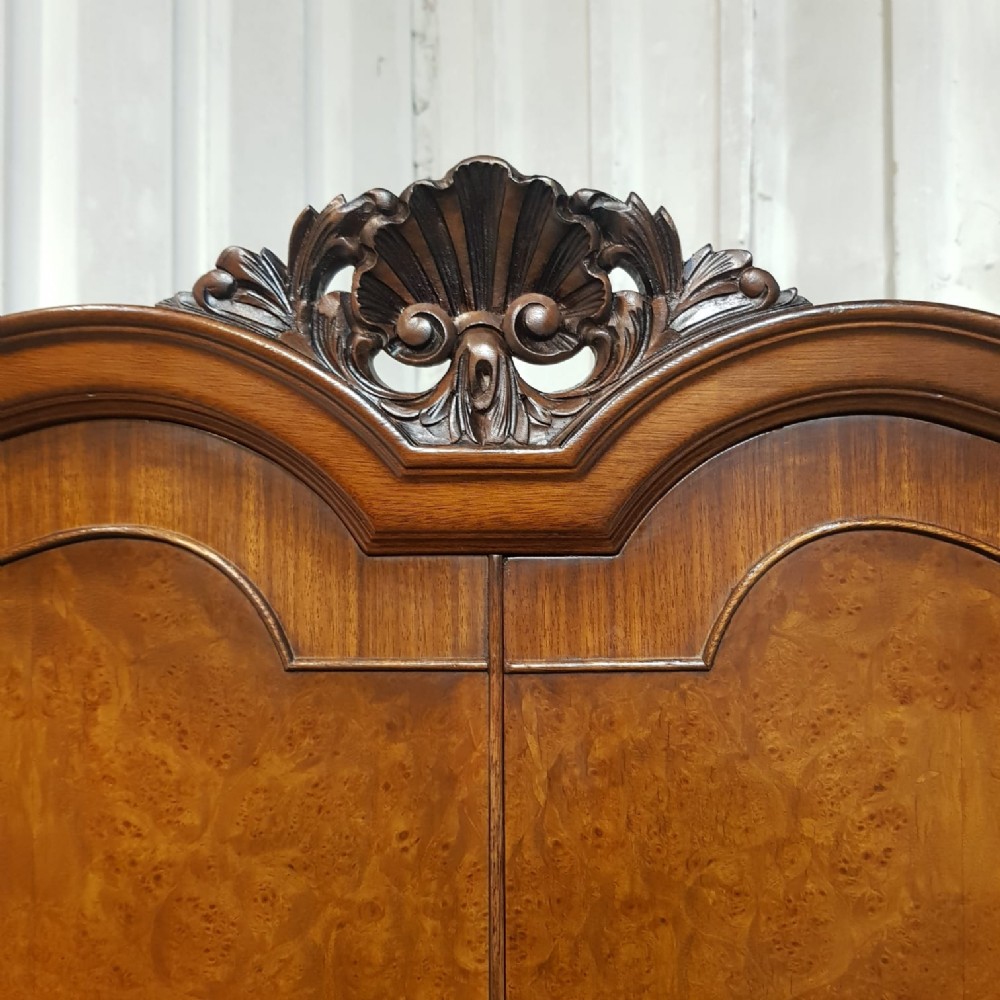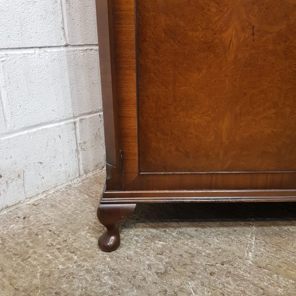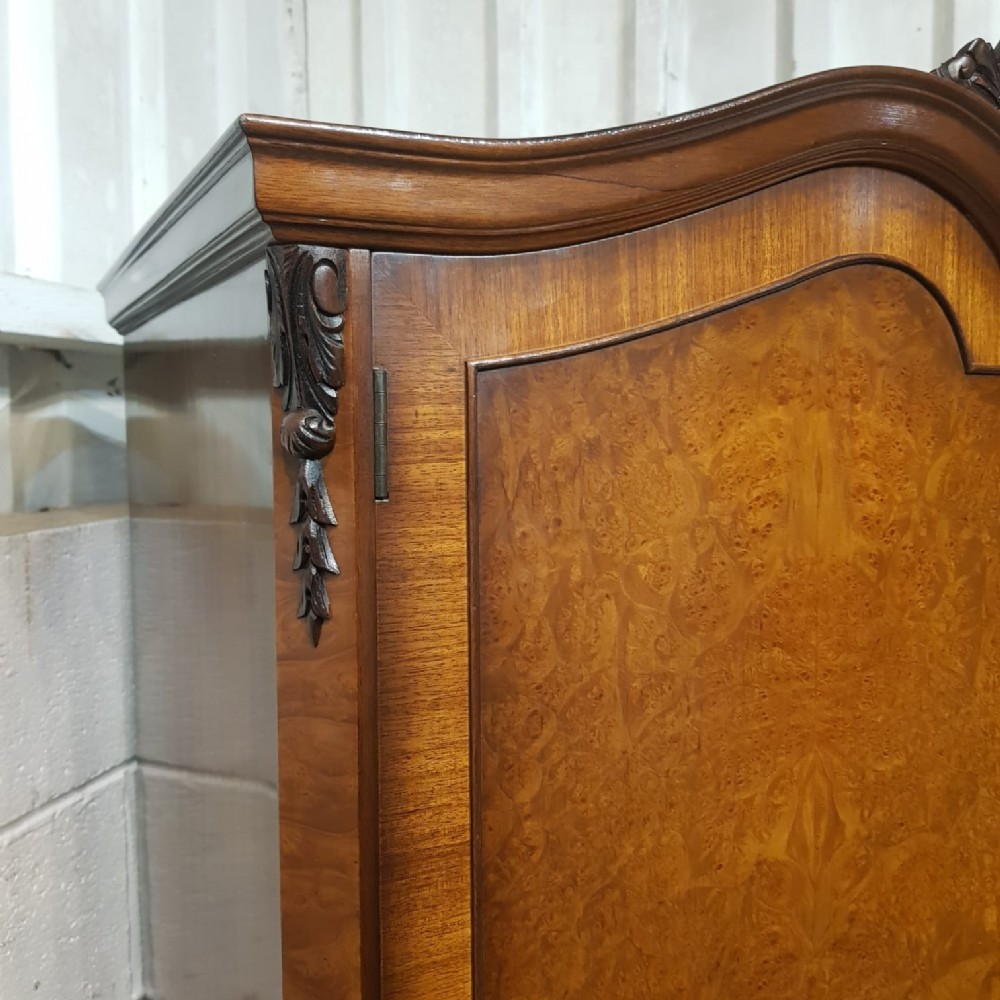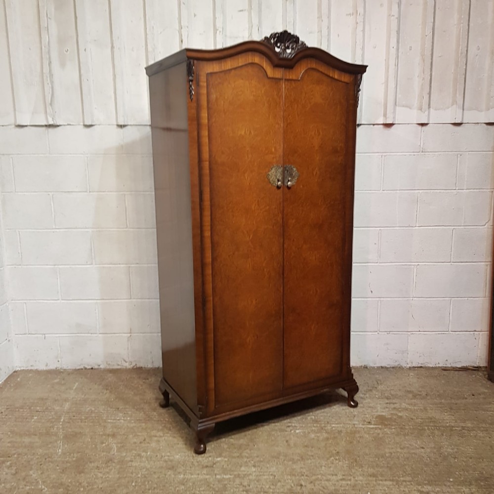 An antique Burr Walnut wardrobe and dating from around 1920. This wardrobe has a serpentine shaped moulded cornice with a carved cartouche to the centre. It has two doors, both have a wide cross banded edge with brass handles and large pierced escutcheons. Inside on the left is a hanging rail and on the right are shelves, a drawer and two glazed fronted cupboards. The wardrobe is moulded around the bottom and stands on short cabriole legs.