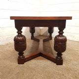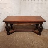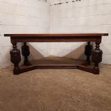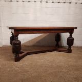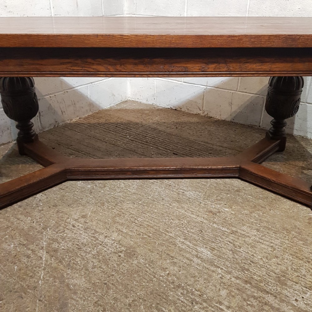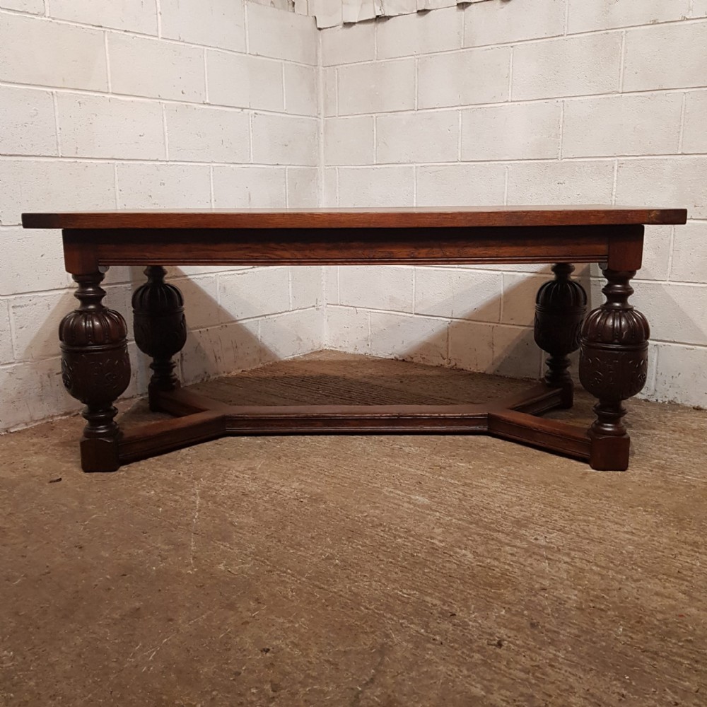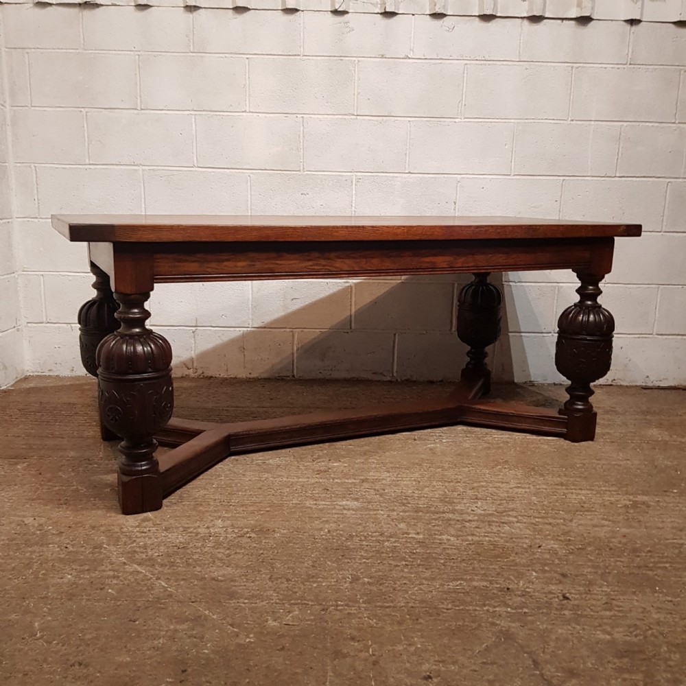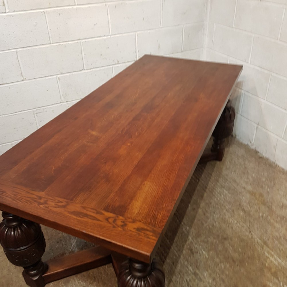 An antique Oak refectory dining table dating from around 1920 and seats up to 8 people. This wonderful piece has a solid Oak top with ceated ends a wide lip underneath with a moulded edge. It stands on carved baluster legs on a styled foot. It has a moulded X frame stretcher.