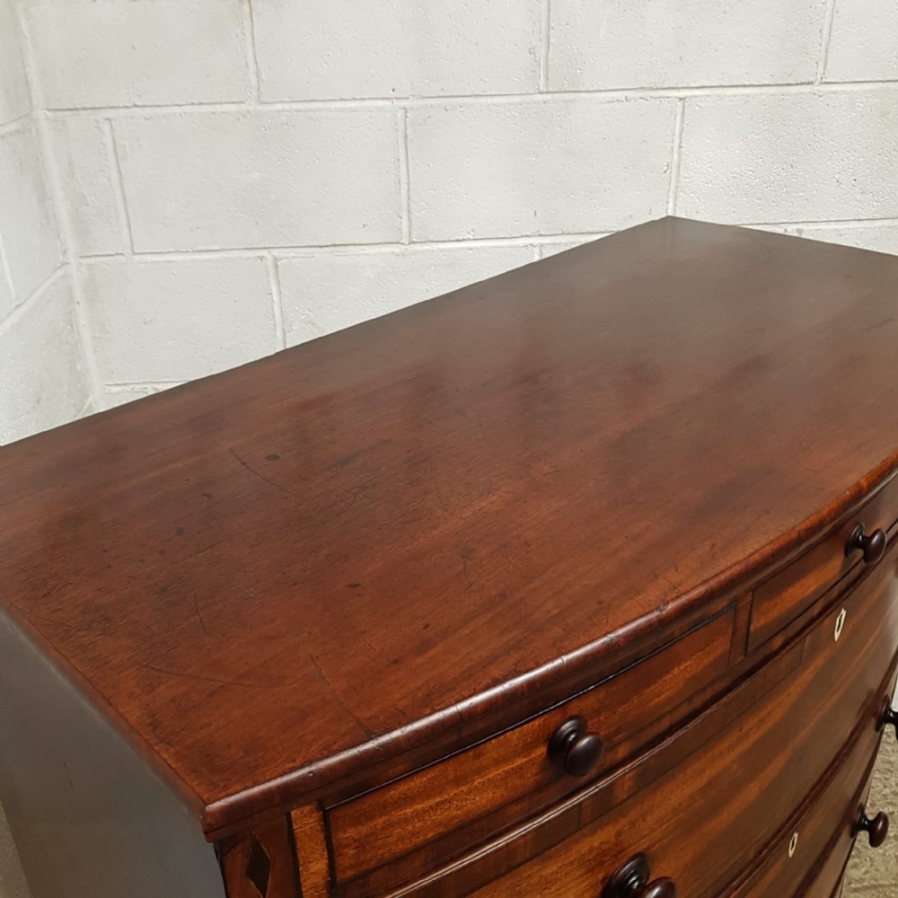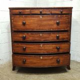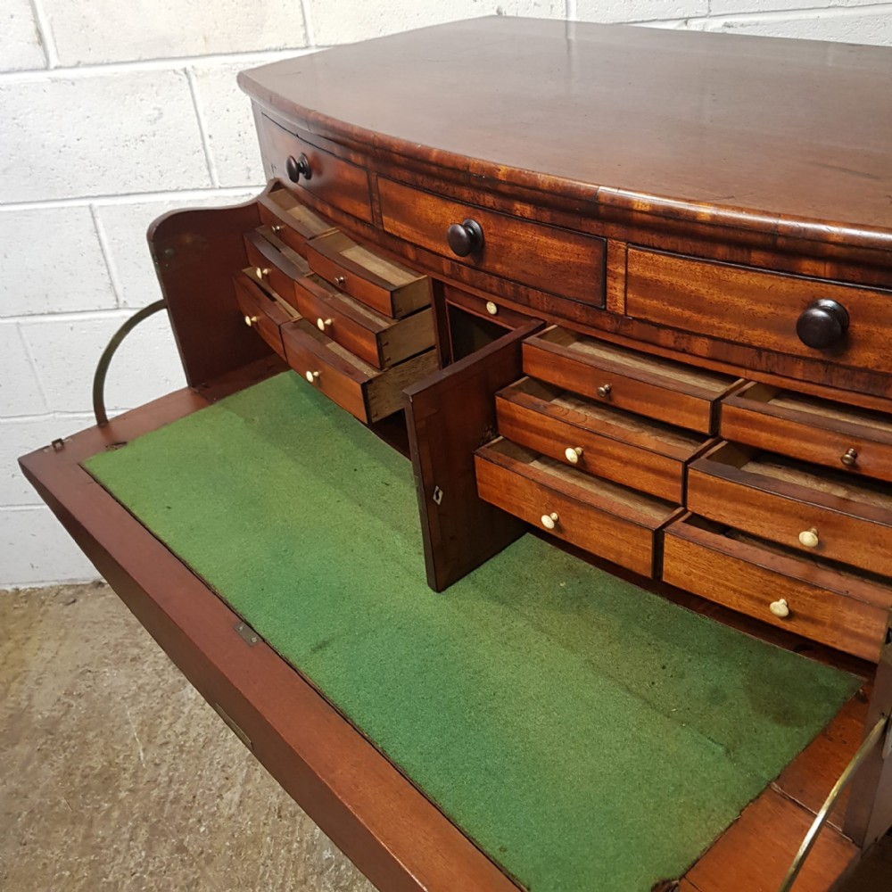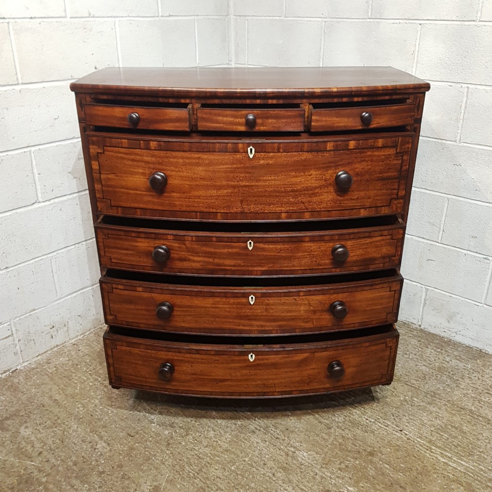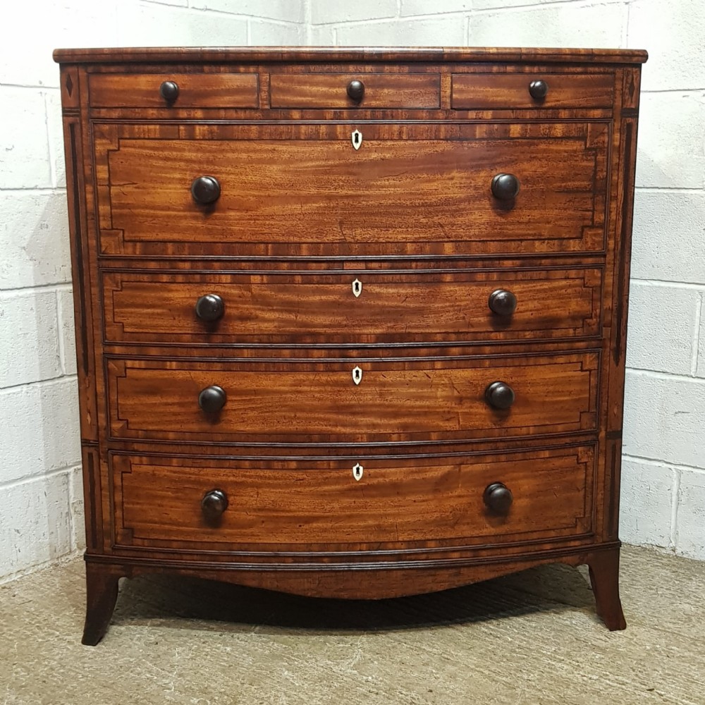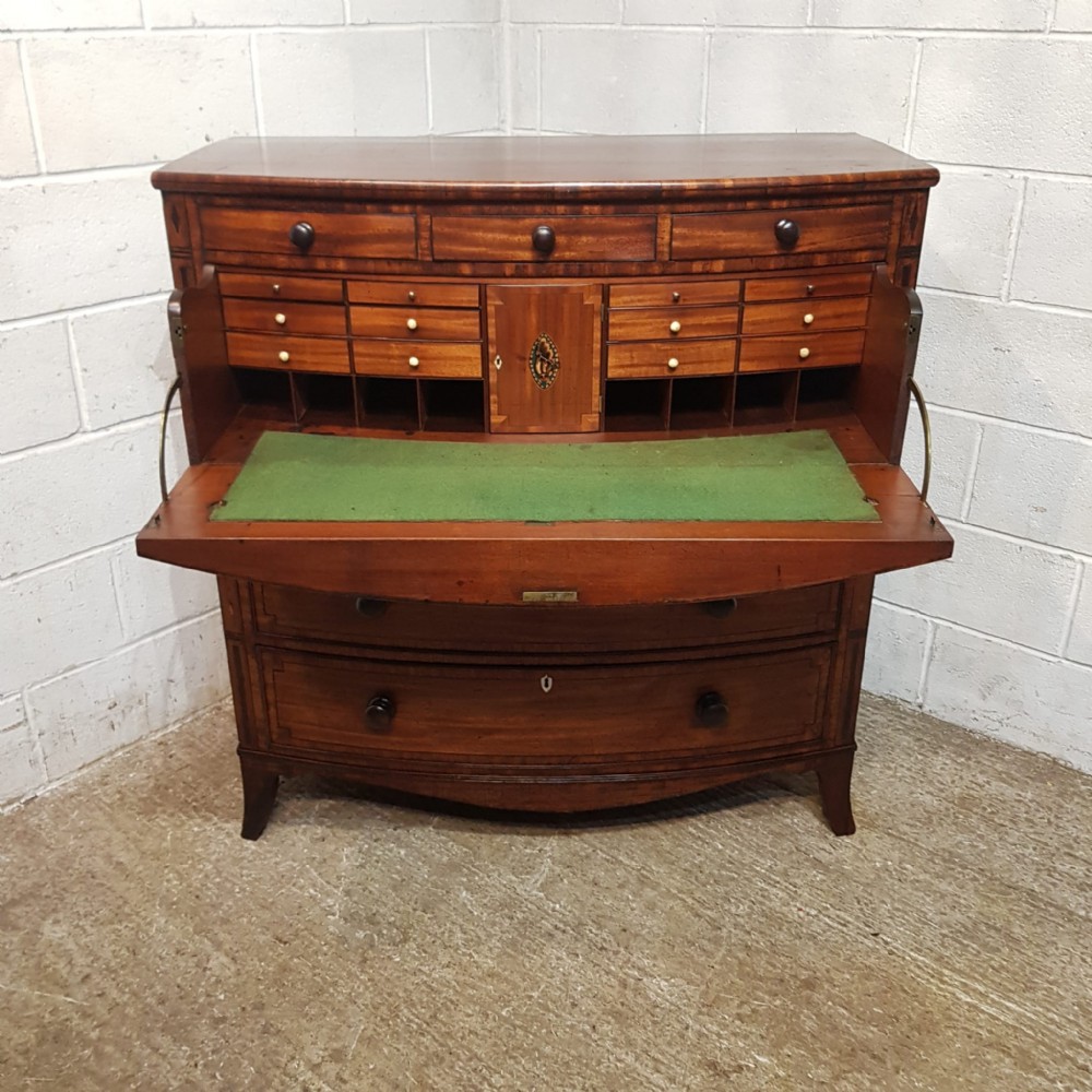 A Victorian Bow fronted Mahogany with Ebony string secretaire chest of drawers and dating from around 1850. This beautiful piece has a rounded edge to the top with three small drawers underneath. Following this is a long deep drawer which the front drops to reveal the secretaire. Inside is a small door to the centre with an inlaid shell on it and six drawers to each side with pigeon holes underneath and a baize writing surface. Under this are three long graduating drawers, all the drawers are pine lined with original knob handles and ivoreen escutcheons. The drawer fronts have a cross banded edge and are strung in ebony. It stands on a splayed bracket feet with a shaped frieze in between.