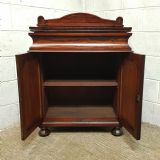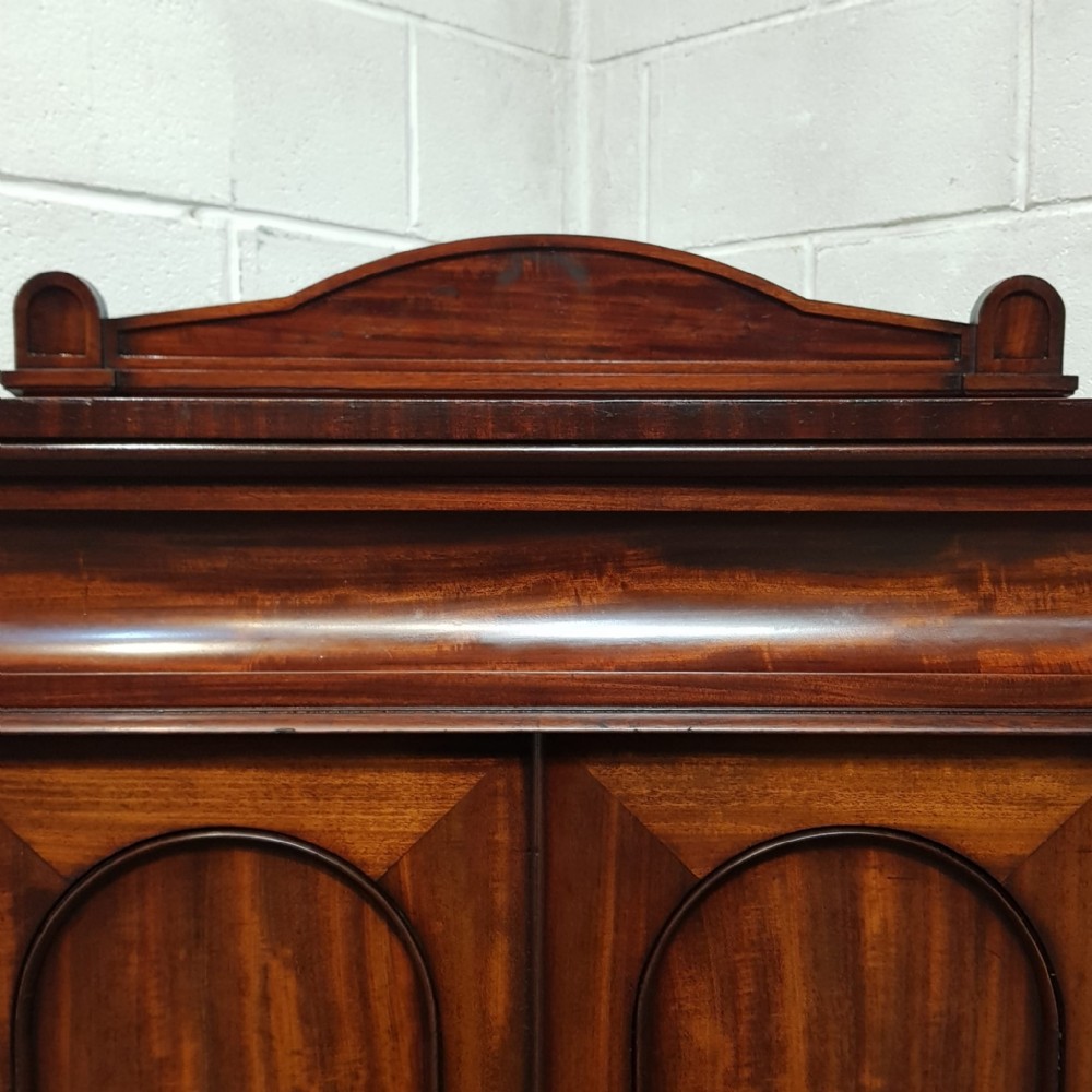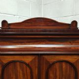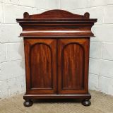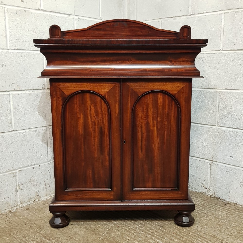 A small Mahogany William 4th chiffonier and dating from around 1830. This lovely chiffonier has a moulded low gallery back to the top with a moulded edge with a moulded frieze drawer underneath. It features two doors with an arched top and moulded panels with a shelf inside. It is moulded around the bottom and stands on turned feet.