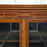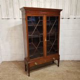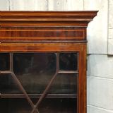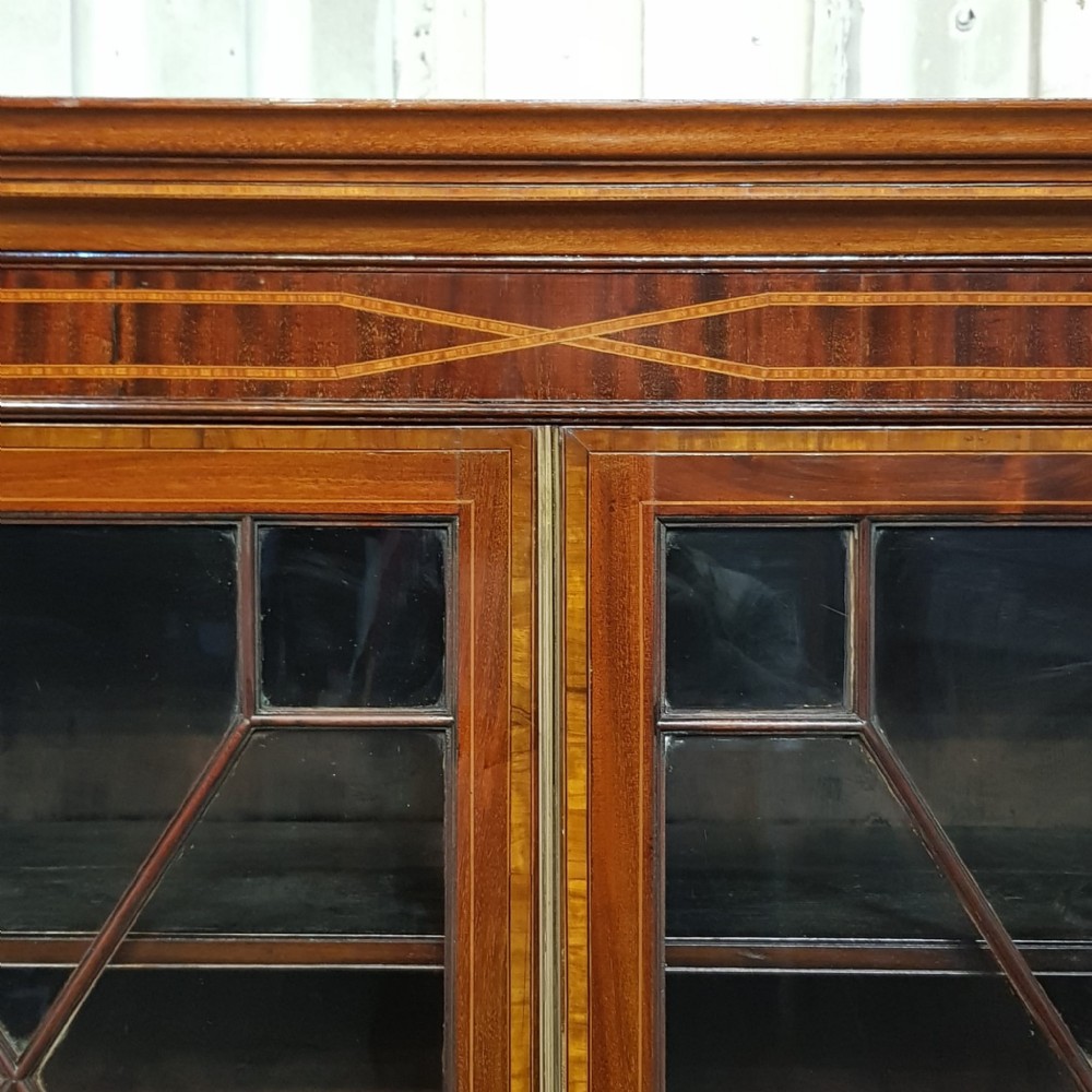 A Regency Mahogany astragal glazed bookcase on stand and dating from around 1810. This bookcase has a moulded inlaid cornice with a wide inlaid lip underneath. It has two Astragal glazed doors with inlaid door frames and a brass door divider and key with three fully adjustable shelves inside. It is moulded around the bottom and the base has a long dummy drawer with brass escutcheon and handles with an inlaid front. It stands on square tapered legs on a spade foot and the top lifts off the base.